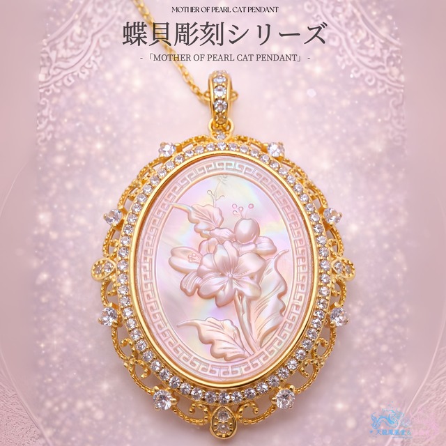 ■動画はこちら https://youtube.com/shorts/j_M8aObUf9A?si=i1KoEXlCN83HQ8hH 主石:紫系マザーオブパール(シェル) 主石のサイズ:約18*22mm 枠のサイズ:約22*29mm サイドストーン:7Aグレード ジルコニア 枠素材:シルバー925(S925刻印入り/K18イエローコーティング)/白蝶貝(マザーオブパール) 付属品:45cmアジャスター付きチェーンネックレス 紫蝶貝彫刻ペンダント ― 百合の花 ― やわらかなピンクベージュの光を湛えた紫蝶貝に、気品ある百合の花を繊細に彫刻した、非常に希少なペンダント。 紫の干渉色が現れる、流通量の少ないマザーオブパール。 自然素材ならではの奥行きある色合いと、一点ごとに異なる表情をお楽しみいただけます。 光の角度によって、やさしいローズカラーやミルキーな紫が浮かび上がり、彫刻された百合の花の立体感をより柔らかく、上品に映し出します。 中央には、優雅に咲く百合の花を繊細に彫刻。 花びらのやわらかな曲線や、すっと伸びる葉のラインまで丁寧に表現され、百合特有の気高さと清らかさを感じさせる仕上がりです。 マザーオブパールの干渉光が彫刻の陰影をやさしく照らし、まるで光の中で静かに咲いているかのような印象を生み出します。 外周にはクラシカルな装飾フレームを配し、周囲にはキュービックジルコニアをあしらった華やかなデザイン。 ゴールドカラーのフレームが紫蝶貝のピンクトーンを引き立て、全体に温かみと優雅さを添えています。 紫系マザーオブパールは仕入れ自体が難しく、この色味・この彫刻で出会える機会はごくわずか。 見つけられたらラッキーと言える、一期一会のペンダントです。