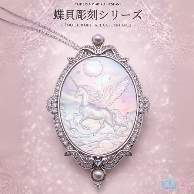 ■動画はこちら https://youtube.com/shorts/8JSFKqjzb3M?si=Msji0kIrgO95vkJg 主石:白蝶貝(豪州産MOP) 主石のサイズ:約22*30mm メレ石:7Aグレードジルコニア 枠素材:シルバー925(S925刻印入り/プラチナコーティング)/フェイクパール 付属品:45cmチェーンネックレス 本作はオーストラリア産の白蝶貝(マザーオブパール)を使用。 白蝶貝ならではの透明感のある乳白色の輝きに、角度によって淡い虹色の干渉色が浮かび上がります。 自然素材のため、一点ごとに表情が異なり、同じものがふたつとない風合いも魅力のひとつです。 月光のように澄んだ輝きを湛えた白蝶貝に、夜空を駆けるペガサスの姿を繊細に彫刻した、幻想的なペンダント。 大きく翼を広げ、雲の上を進むペガサスは、しなやかな脚運びや、風を受けてなびくたてがみまで丁寧に表現され、「飛躍」「自由」「前進」を象徴する存在として描かれています。 背景には月と星が配され、静かな夜の空に物語が広がる構図です。 白蝶貝ならではの、乳白色をベースにした虹色の干渉光が、翼の陰影や雲の立体感をやわらかく浮かび上がらせ、光の角度ごとに表情が変化します。 ゴールド系よりも透明感が際立ち、凛とした印象にまとまるのがこの個体の魅力です。 外周フレームと金具にはSILVER925を採用。 透かしの装飾と小粒ストーンが、白蝶貝の清らかな輝きを引き立て、クラシカルで上品な雰囲気を添えています。 馬(ペガサス)は古くから「成功」「行動力」「道を切り拓く力」の象徴。 馬の年の節目に、新しい一歩や飛躍を願うお守りのように身につけたい一本です。