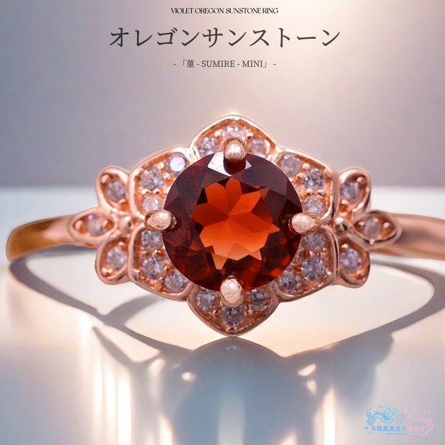 ストーン:天然オレゴンサンストーン カット:ラウンドファセットカット ストーンのサイズ:5*5mm(約0.4ct) 素材:純正SV925(S925刻印入り/K18イエローゴールドコーティング) サイズ:フリー(デフォルト12号) ■リングのデザイン こちらは当店が構想から設計まで手がけた、完全オリジナルのリング枠。 枠の原案を手がけたデザイナーと製造工場が緻密に連携し、小さな花のようなフォルムに“咲かせたい想い”を込めた、特別な一品です。 5mmのラウンドサイズを基準に設計されたこのリング枠は、小ぶりでありながら洗練された存在感を放ちます。特に注目していただきたいのは、「花弁と葉っぱ」のバランス。 一般的な6mm用の市場流通枠では、センターストーンがやや大きすぎて葉のモチーフが埋もれがちになりますが、本作では石と周囲のデザインが引き立て合うよう、細かく調整を加えています。 ■宝石について アメリカ・オレゴン州産の天然オレゴンサンストーンを主石に用いた、繊細で気品あるリングです。 本作に使用しているのは、数あるオレゴンサンストーンの中でも特に発色の優れた赤系カラーのみを厳選した一石。 銅由来のインクルージョンによって生まれるオレゴンサンストーン特有の色合いの中でも、ここまで深みと透明感を併せ持つ赤は産出量が少なく、流通数も限られています。 光を受けると、朱から深紅へと表情を変え、内側から静かに燃えるような輝きを見せるのがこの石の魅力。 派手さではなく、「芯のある美しさ」を感じさせる赤です。 デザインは、当店人気の《菫 -SUMIRE-》シリーズをベースに、石の存在感を引き立てる5mmサイズ仕様。 主石の周囲には高品質ジルコニアを花弁のように配置し、可憐さとクラシカルな雰囲気を両立させました。 石を主役に据えつつ、全体のバランスを崩さない、上品な仕立てとなっています。 ⬛︎K18ピンクゴールド やわらかな赤みを帯びた地金が、石の赤やオレンジのニュアンスと自然に溶け合います。 発色が穏やかに引き立ち、華やかさの中に可憐さと温もりを感じさせる、やさしい印象の仕上がりになります。 オレゴンサンストーンは、「希望」「前向きな情熱」「自分らしさ」を象徴するといわれる宝石。その中でも赤系は、意志の強さや内なる情熱を静かに宿す色とされています。 可憐さの奥に、確かな芯を感じさせる一本。 量産品では表現しきれない、洗練されたバランスと細部へのこだわり。 指先で静かに花開く、小さな芸術品をぜひお楽しみください。