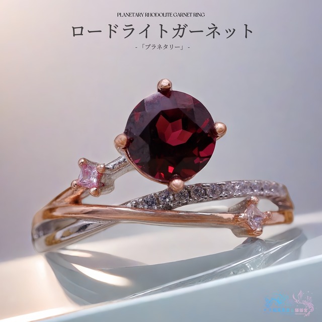 中石:天然ロードライトガーネット 中石のカラー:ワインレッド 中石のカット:ラウンドファセットカット 中石のサイズ:6mm(約1ct) クラリティ:ルーペクリーン リングの素材:SV925(刻印入り/ロジウムコーティング&K18ピンクゴールドコーティング) リングのサイズ:12.5号(固定) メレ石:ジルコニア(ホワイト) 本作は、色味に徹底してこだわり、真紅のロードライトガーネットのみを厳選してお仕立てした一本です。 ロードライトガーネットは、紫みが強く出る個体や、暗く沈んで見えるものも多い宝石ですが、本作では ・紫みが前に出すぎないこと ・黒味を感じさせないこと ・光を受けた時に、赤がはっきりと立ち上がること この基準を満たした、深く澄んだレッドの個体のみを選び抜いて使用しています。 主石には、ロードライトガーネット本来の色と輝きを素直に楽しめるオーソドックスなラウンドファセットカットを採用。 カットによる演出に頼らず、石そのものの赤の濃淡、透明感、光の戻りを正面から感じていただける仕上がりです。 デザインは、惑星が軌道を描きながら巡る姿をイメージした「プラネタリー」シリーズ。 主石を中心に、異なるラインが重なり合うことで、静かな動きと立体感を生み出しています。 角度によって表情が変わり、指元でさりげなく視線を引き寄せる構成です。 地金には、真紅のロードライトガーネットと相性の良いローズゴールドカラーを採用。 温かみのある地金色が、赤の深みをより美しく見せ、華やかさの中にも落ち着いた印象を与えます。 固定サイズでお仕立てしているため、指にしっかりと馴染み、安定感のある着け心地も魅力のひとつ。 日常使いでもストレスを感じにくく、長時間身に着けていただけます。 赤い宝石がお好きな方、ガーネットでも“暗くない赤”を求めている方、華やかさと品の良さを両立したリングをお探しの方に、ぜひおすすめしたい一品です。 赤い宝石がお好きな方、 ガーネットでも“暗く沈まない赤”と、 惑星の軌跡を思わせる立体的なデザインを楽しみたい方に、 ぜひおすすめしたい一本です。 ※ご注意※ メッキ加工の商品は、ご使用状況により色味の変化が起こる場合がございます。水や摩擦を避け、優しくお取り扱いいただけますと長く美しさを保てます。