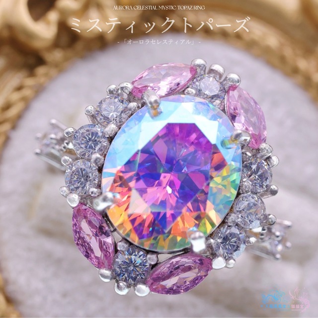 ストーン:ミスティックトパーズ カット:オーバルブリリアントカット クラリティ:ルーペクリーン(VVS相当) ストーンのサイズ:9*11mm(約3.6ct) 素材:SV925(ロジウムコーティング) サイズ:フリー(デフォルト14号/11号~20号調整可能) 当店監修のもと制作した、9×11mmの大粒ミスティックトパーズを贅沢にあしらった幻想的なリング「セレスティアル」。 神秘的な光彩を放つその輝きは、まるで宇宙の彼方から舞い降りた星のよう。 虹色の幻想的な煌めきが、指元にロマンを添えます。 センターには、高品質なブリリアントカットのミスティックトパーズをセッティング。ピンクとブルーが交差する幻想的な煌めきは、見る角度によって豊かに表情を変え、夜空のオーロラのような美しさを感じさせます。 サイドにはローズカラーのマーカサイト風ストーンと、透明感の高いキュービックジルコニアを配し、まるで星々が寄り添うような優美なシルエットに。リング全体のデザインは天体や流星を思わせる構造で、夢とロマンを詰め込んだ作品に仕上がっています。 幻想的な煌めきを愛する方に贈りたい、特別な一品です。