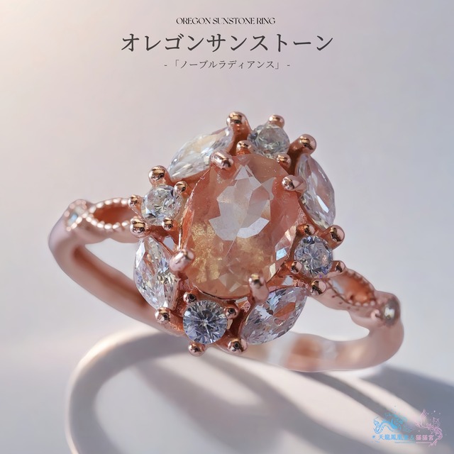 宝石:オレゴンサンストーン 宝石カット:オーバルファセットカット 素材:純正シルバー925(K18ピンクゴールドコーティング/S925刻印入り) 石のサイズ:約5*7mm(約1ct) リングのサイズ:フリー 【オレゴンサンストーン – ノーブルラディアンス】 陽光の煌めきを宿した、特別な天然石「オレゴンサンストーン」。 そのあたたかく上品な輝きを、王妃のティアラを思わせる放射デザインで仕立てた、華やぎと気品に満ちたリングです。 中央に輝くのは、アメリカ・オレゴン州のみで産出される希少なオレゴンサンストーン。 ピーチゴールドのような柔らかな色合いの中に、繊細なシラー(光のきらめき)が浮かび上がり、まるで夕陽が宝石の中で揺れているかのよう。 周囲にはマーキスカットとラウンドカットの高品質ジルコニアを配し、太陽の光が広がる瞬間のような放射状のシルエットを描いています。 立体感のあるセッティングとピンクゴールドカラーの地金が相まって、指元にふんわりとしたあたたかみと優雅なオーラを添えてくれます。 アーム部分には、繊細なミル風の粒細工とジルコニアを交互にあしらい、全体のデザインにリズムと装飾性を加えています。 ◆ オレゴンサンストーンについて オレゴンサンストーンは、アメリカ・オレゴン州でしか採れない希少石で、銅の含有によって独特の赤みやシラーを見せます。 「内面の魅力を引き出す石」「幸運と喜びを呼ぶ石」とも言われ、ポジティブなエネルギーに満ちた天然石です。