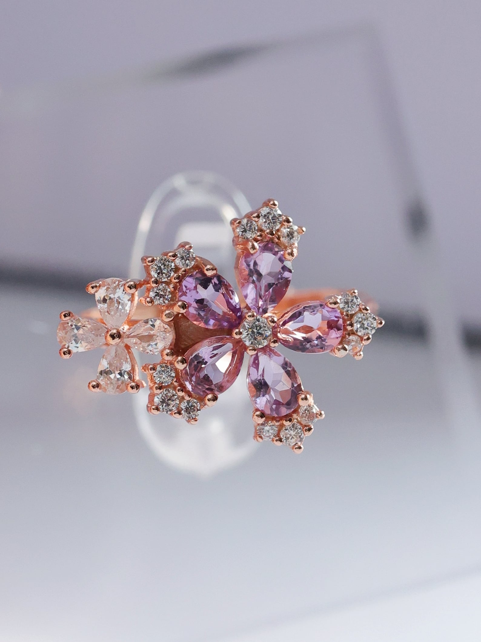 やわらかく透明感のあるアメジストを、滴のようなペアシェイプカットで花びらのかたちに。