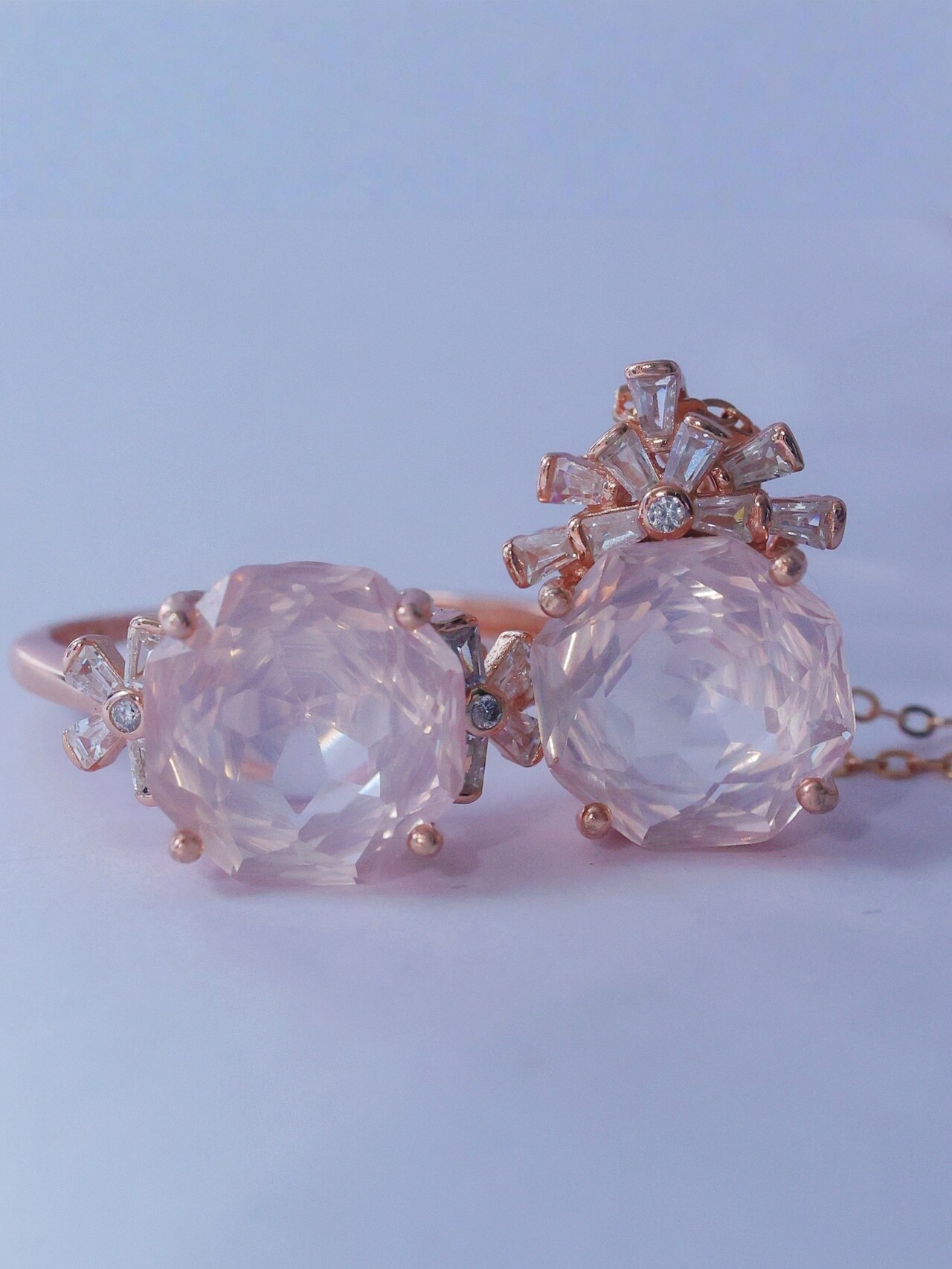 中央のローズクォーツには、通常のカボションやブリリアントでは見られない、特別なカットが施されています。