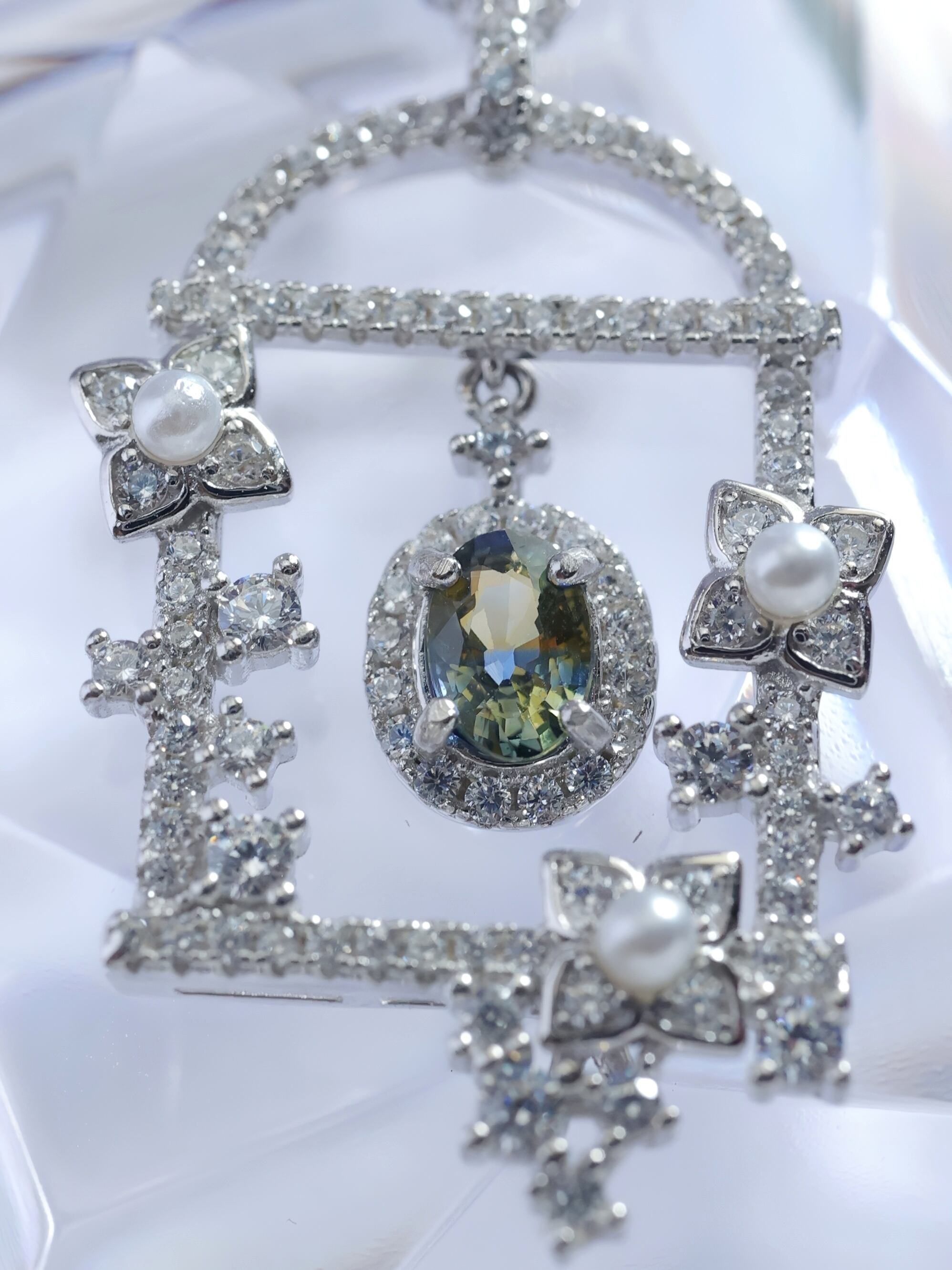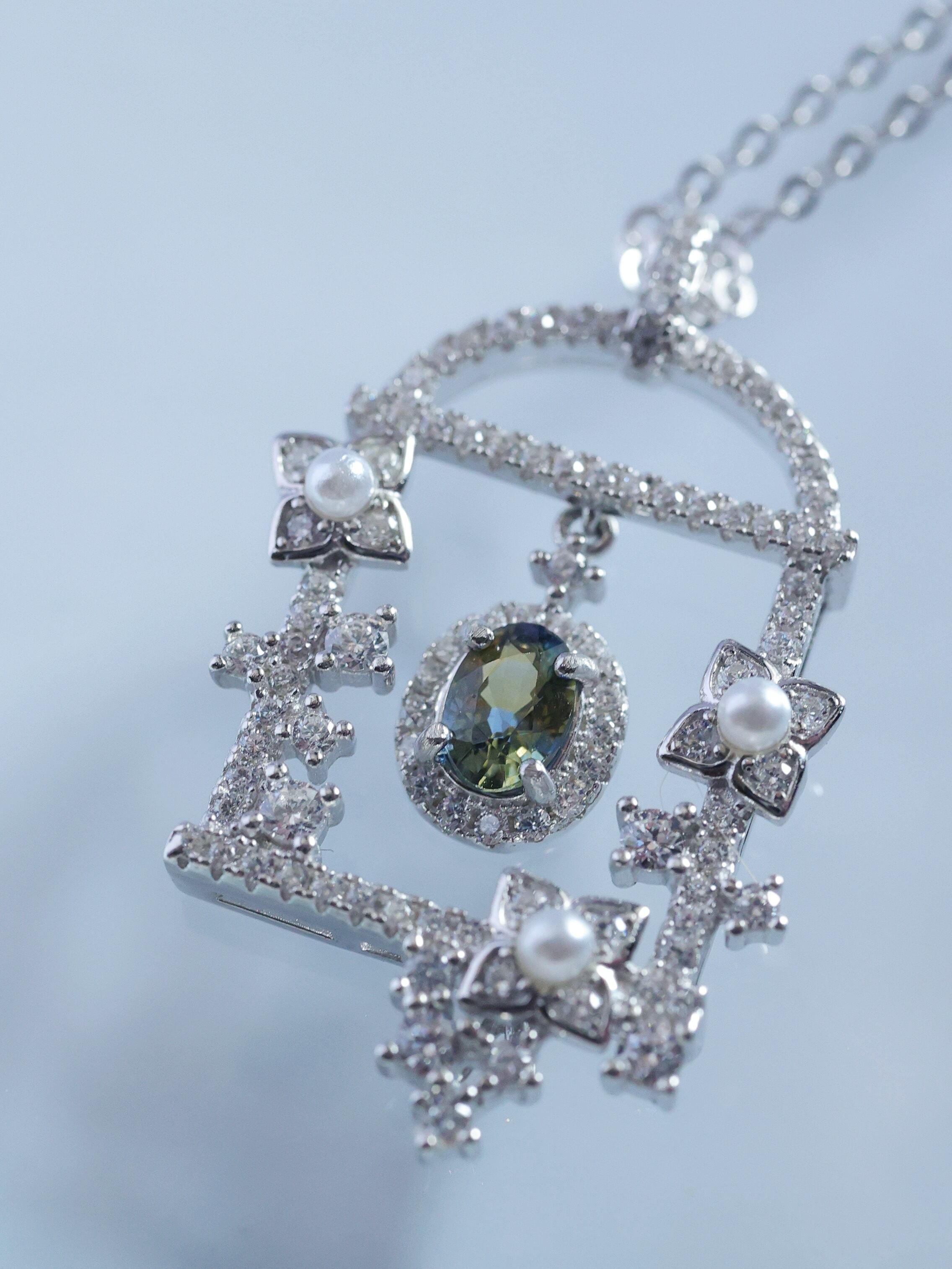 【印象派の宝石 モネ・睡蓮の池】 日宝協ソ付き バイカラー サファイア ゴッホ 天然石 S925 鳥籠 ペンダント