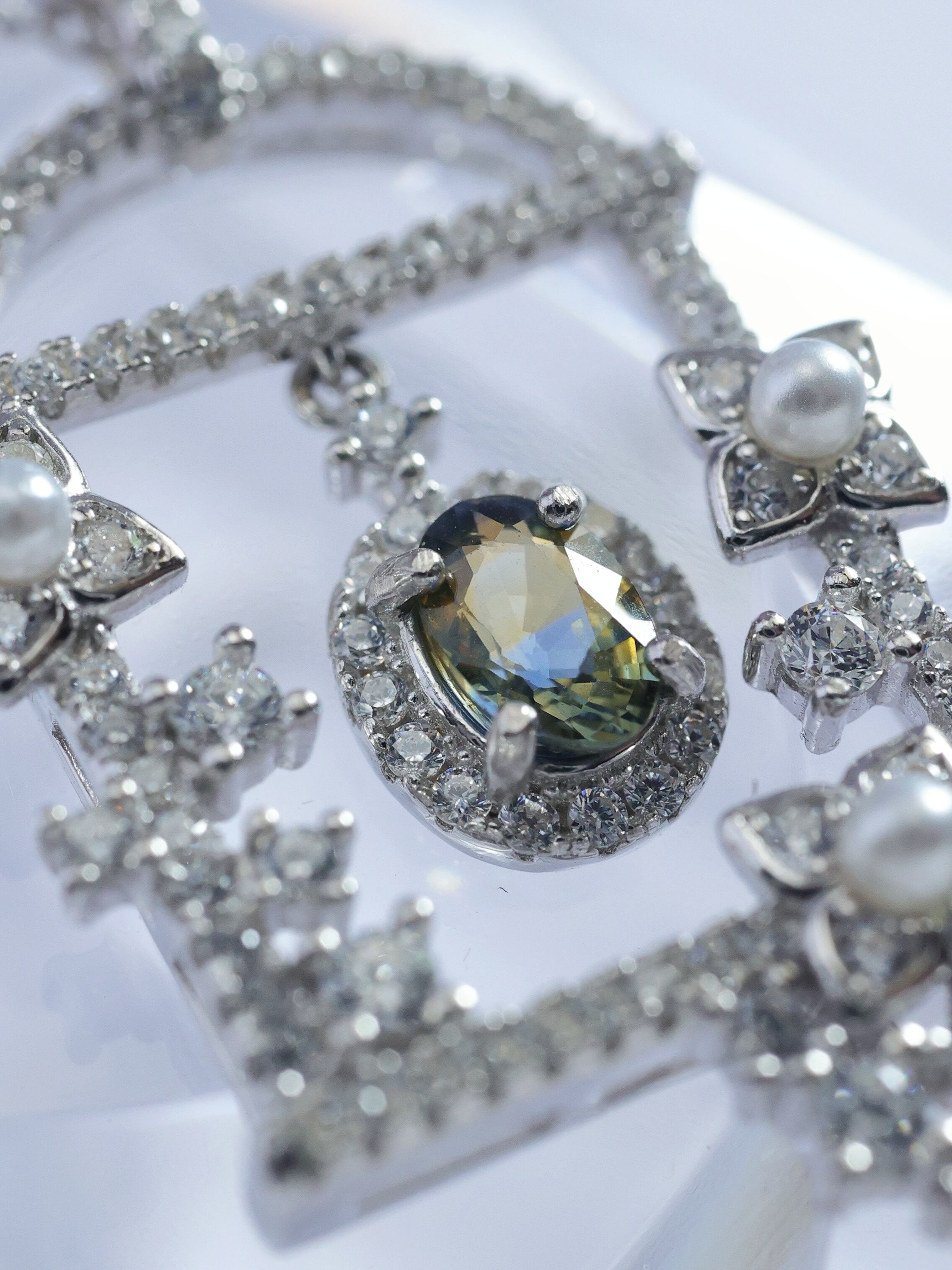 中心には、青とグリーンのニュアンスをたたえたバイカラーサファイアをセット。
