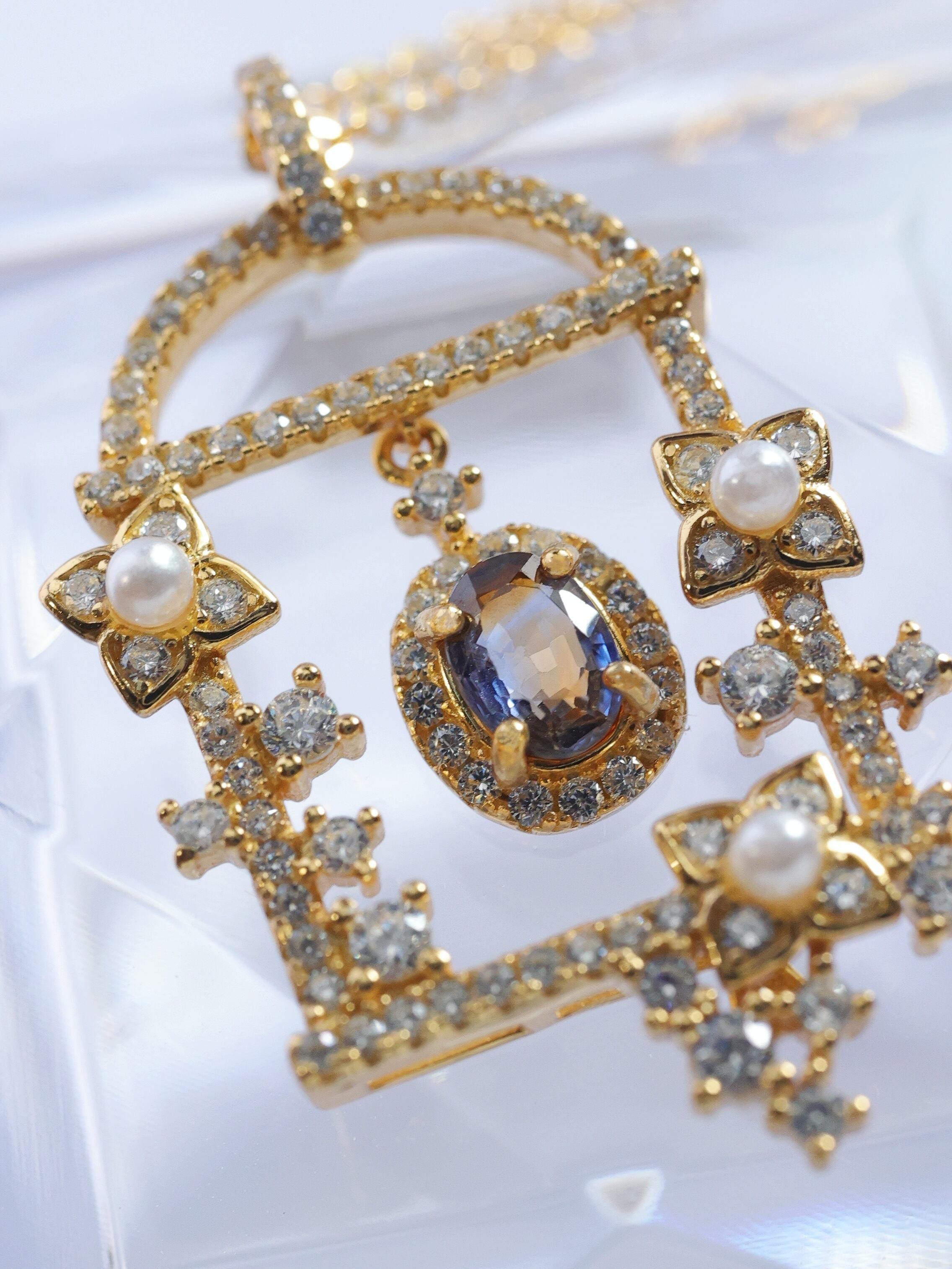 かごの四隅には、星の瞬きをイメージした可憐な花々を配置し、中央には繊細なチェーンで吊るされたバイカラーサファイアが美しく揺れます。