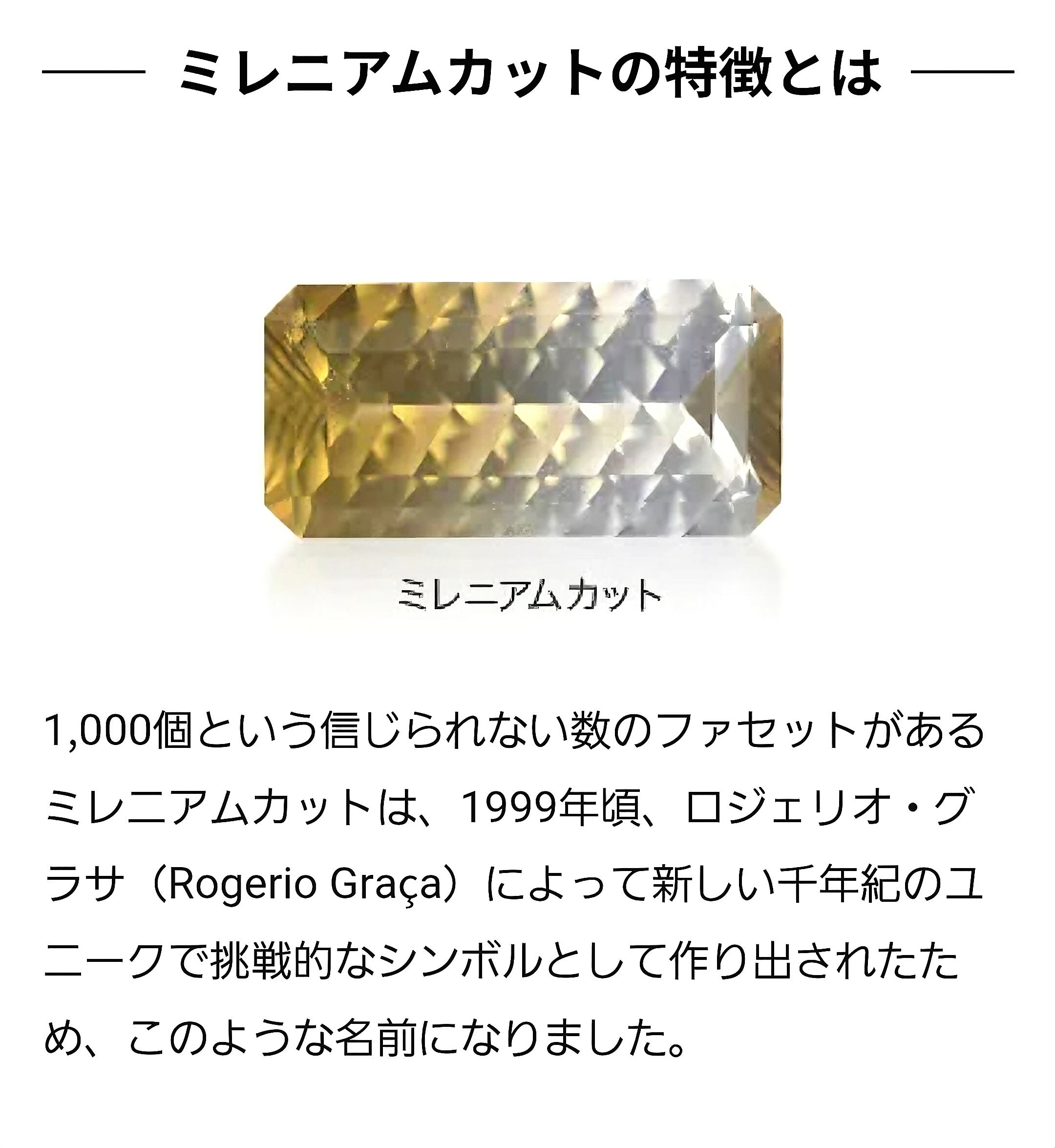 1,000個という信じられない数のファセットがあるミレニアムカットは、1999年頃、ロジェリオ・グラサ(Rogerio Graça)によって新しい千年紀のユニークで挑戦的なシンボルとして作り出されたため、このような名前になりました。