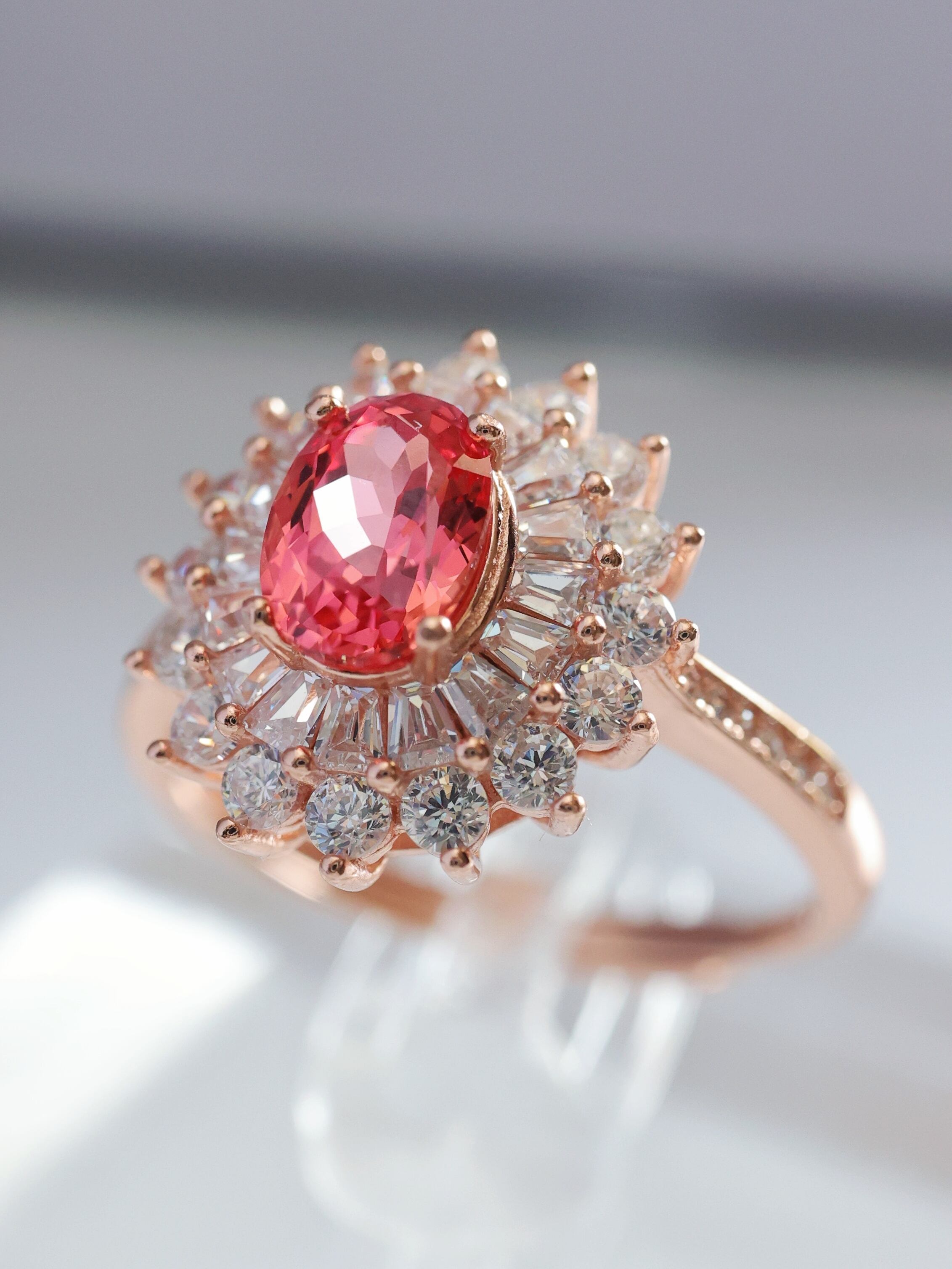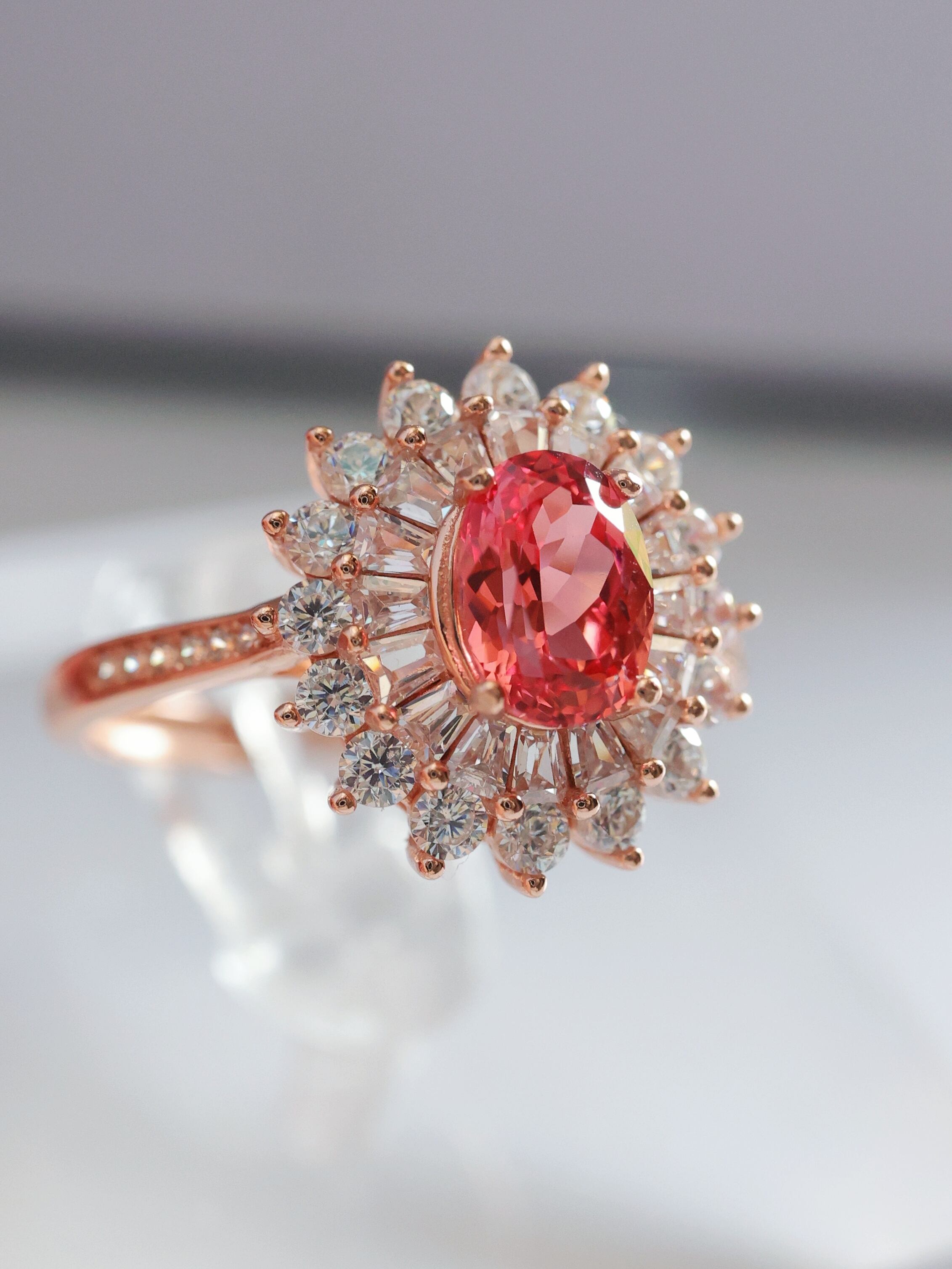 デザインは、中央のオーバルカットのパパラチアサファイアを囲むように、放射状に広がる煌めきが特徴。まるで太陽が昇る瞬間の光を再現したような仕上がりで、指元を一際華やかに演出します。サイドのメレストーンにも高品質な7Aグレードのジルコニアを使用し、繊細な輝きをプラス。