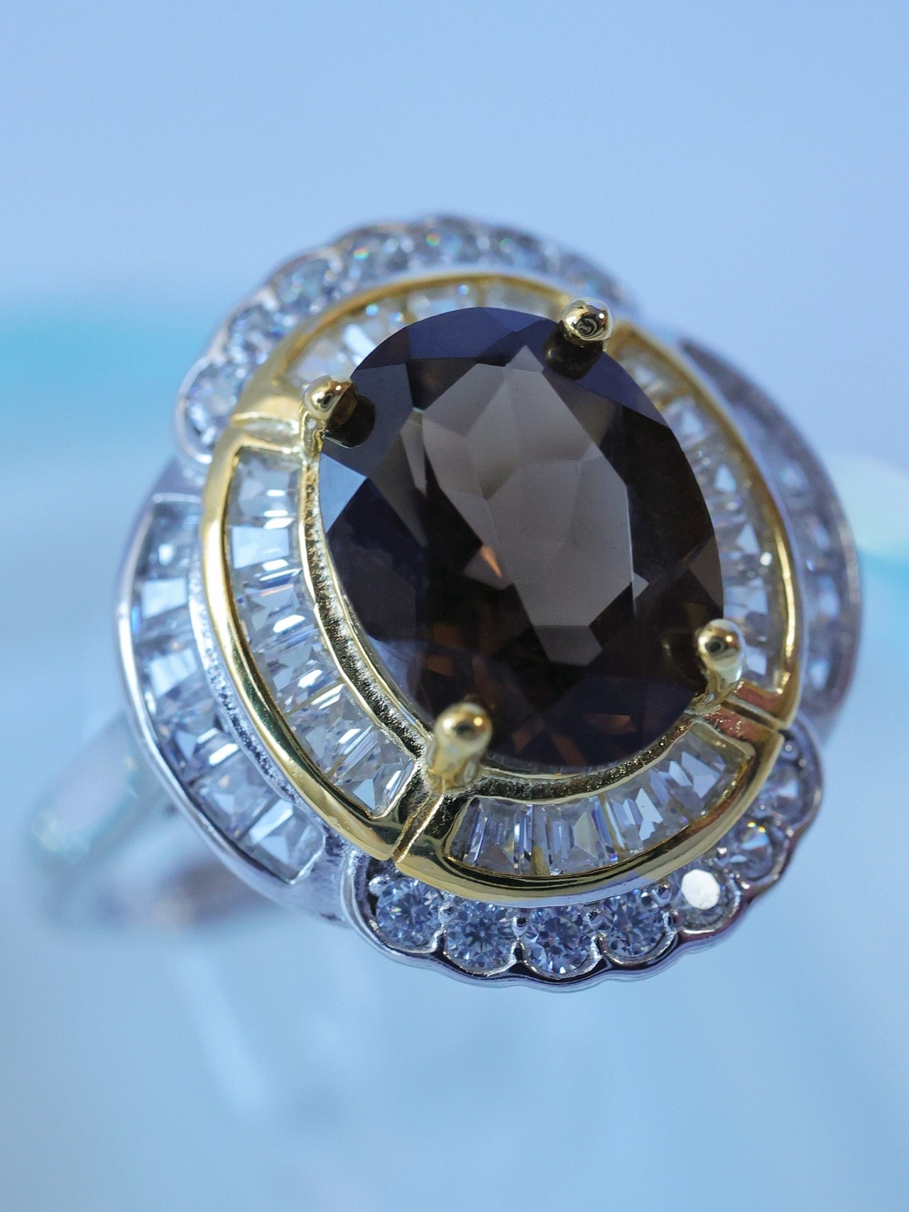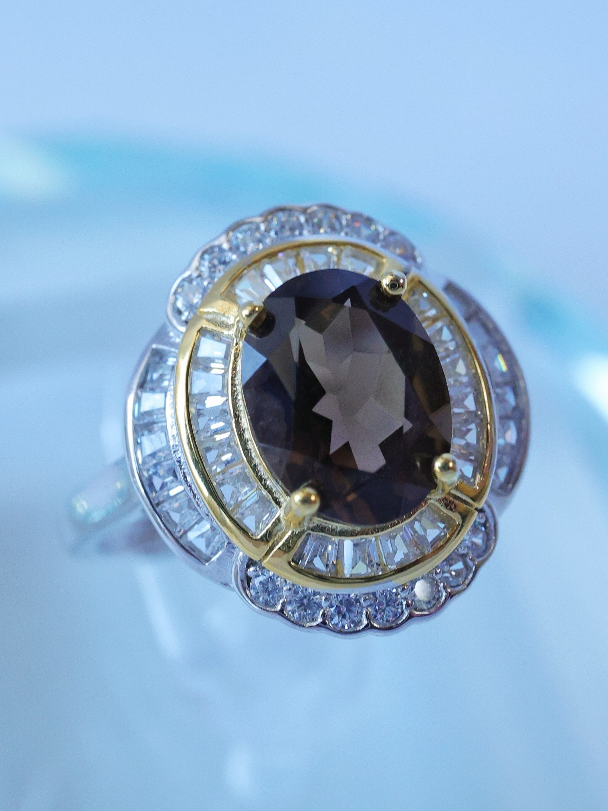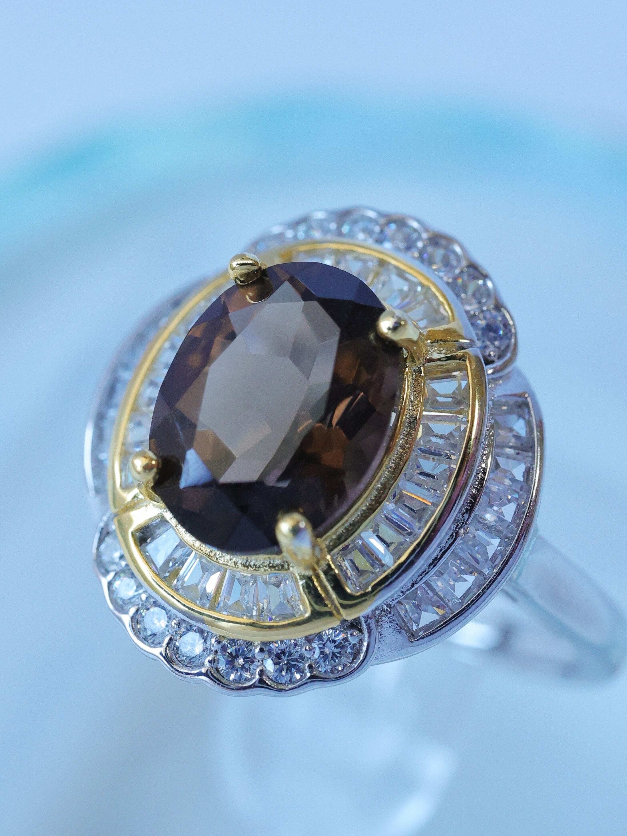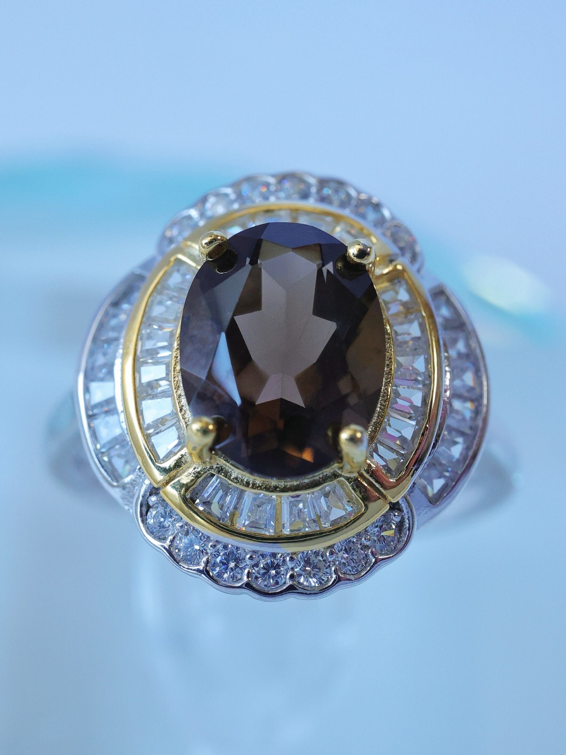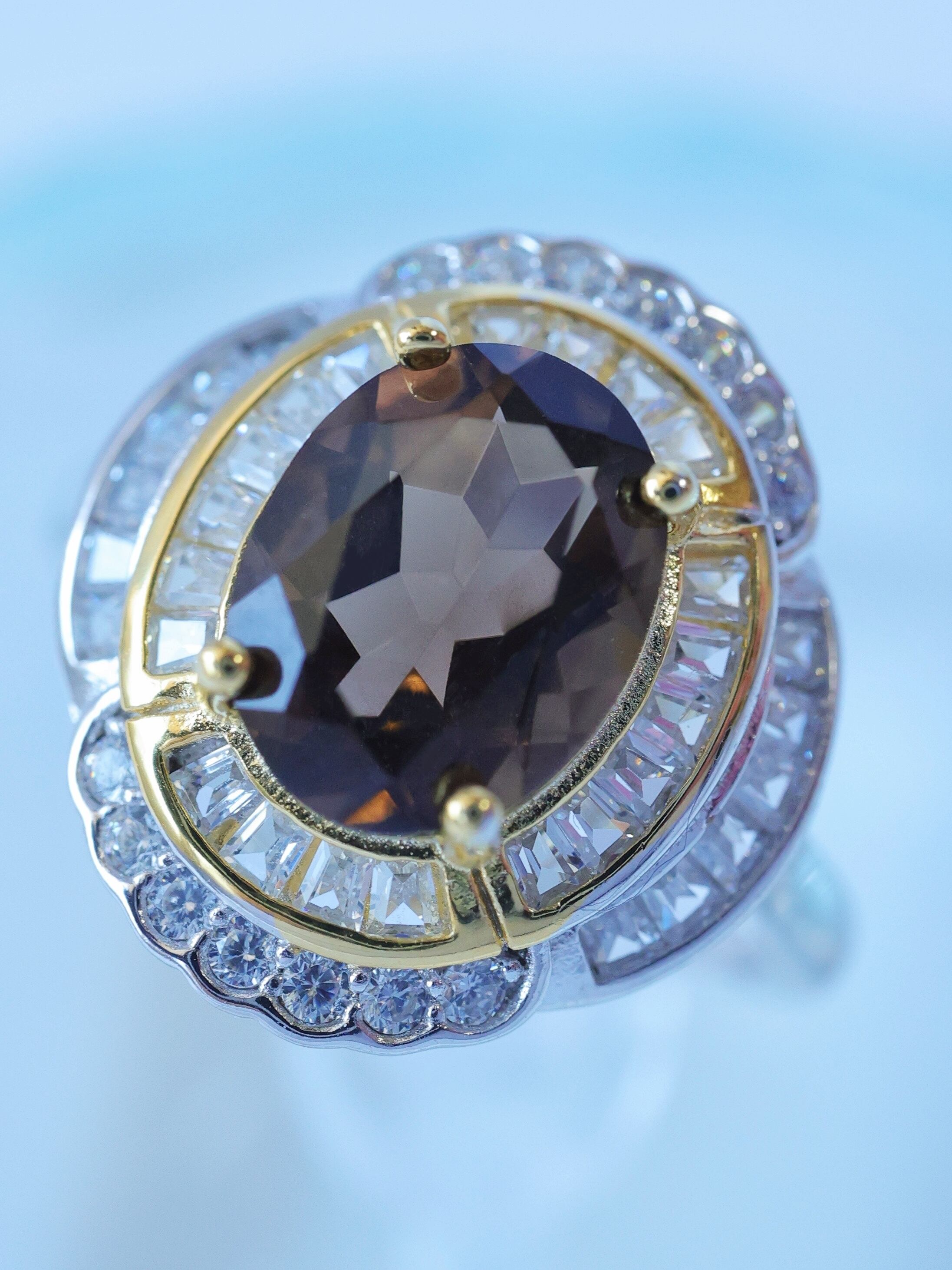 中心のスモーキークォーツを、まるで舞台の主役のように引き立てる贅沢な構成です。