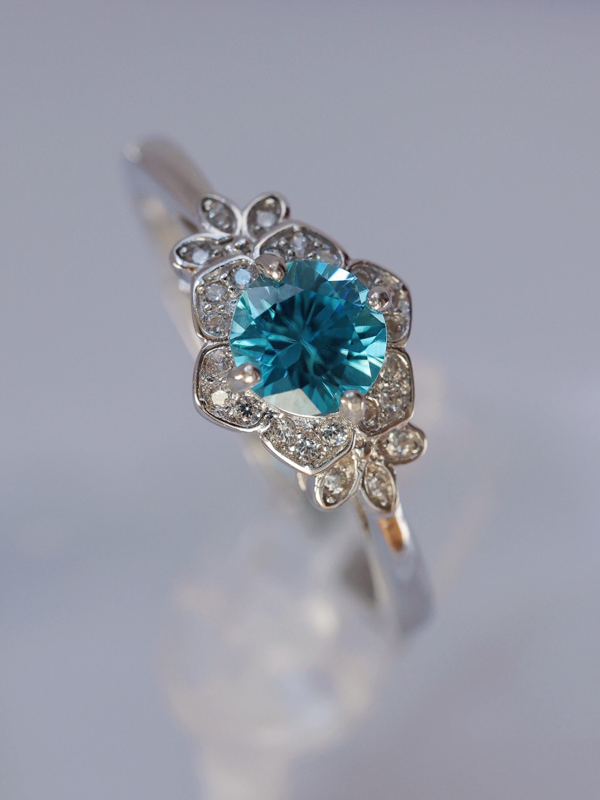 中央に輝くのは、鮮やかなブルーが美しい、高品質な天然ブルージルコン。天然石ならではの瑞々しい発色と、屈折率の高いブルージルコン特有のまばゆい輝きが際立ちます。特に本作では、透明度が高くルーペクリーンランクの高品質ルースを厳選。宝石の奥から光が湧き上がるようなブリリアントカットが施され、光の角度に応じて繊細な表情の変化が楽しめる点も魅力のひとつです。