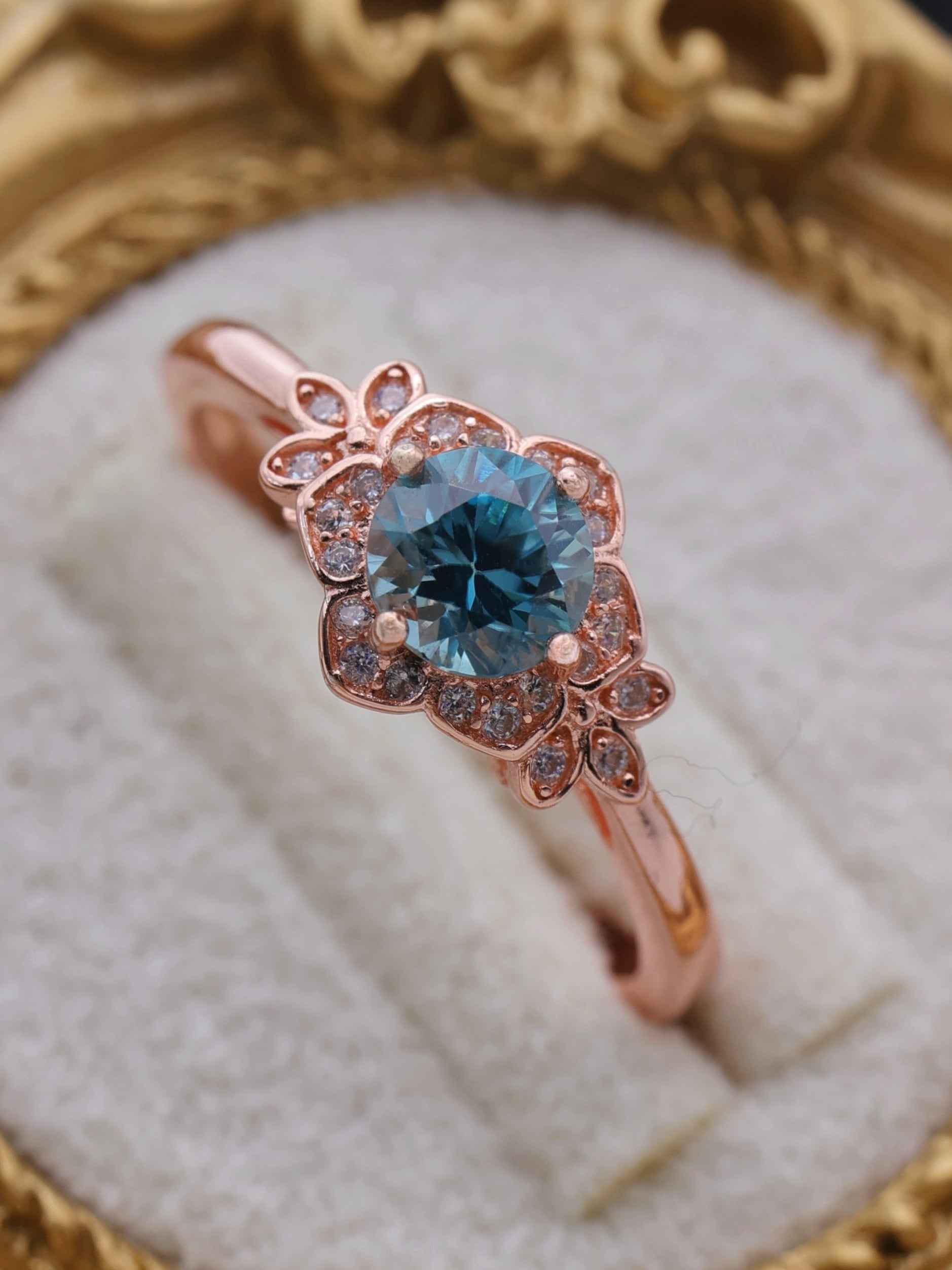 中央に輝くのは、鮮やかなブルーが美しい、高品質な天然ブルージルコン。天然石ならではの瑞々しい発色と、屈折率の高いブルージルコン特有のまばゆい輝きが際立ちます。特に本作では、透明度が高くルーペクリーンランクの高品質ルースを厳選。宝石の奥から光が湧き上がるようなブリリアントカットが施され、光の角度に応じて繊細な表情の変化が楽しめる点も魅力のひとつです。