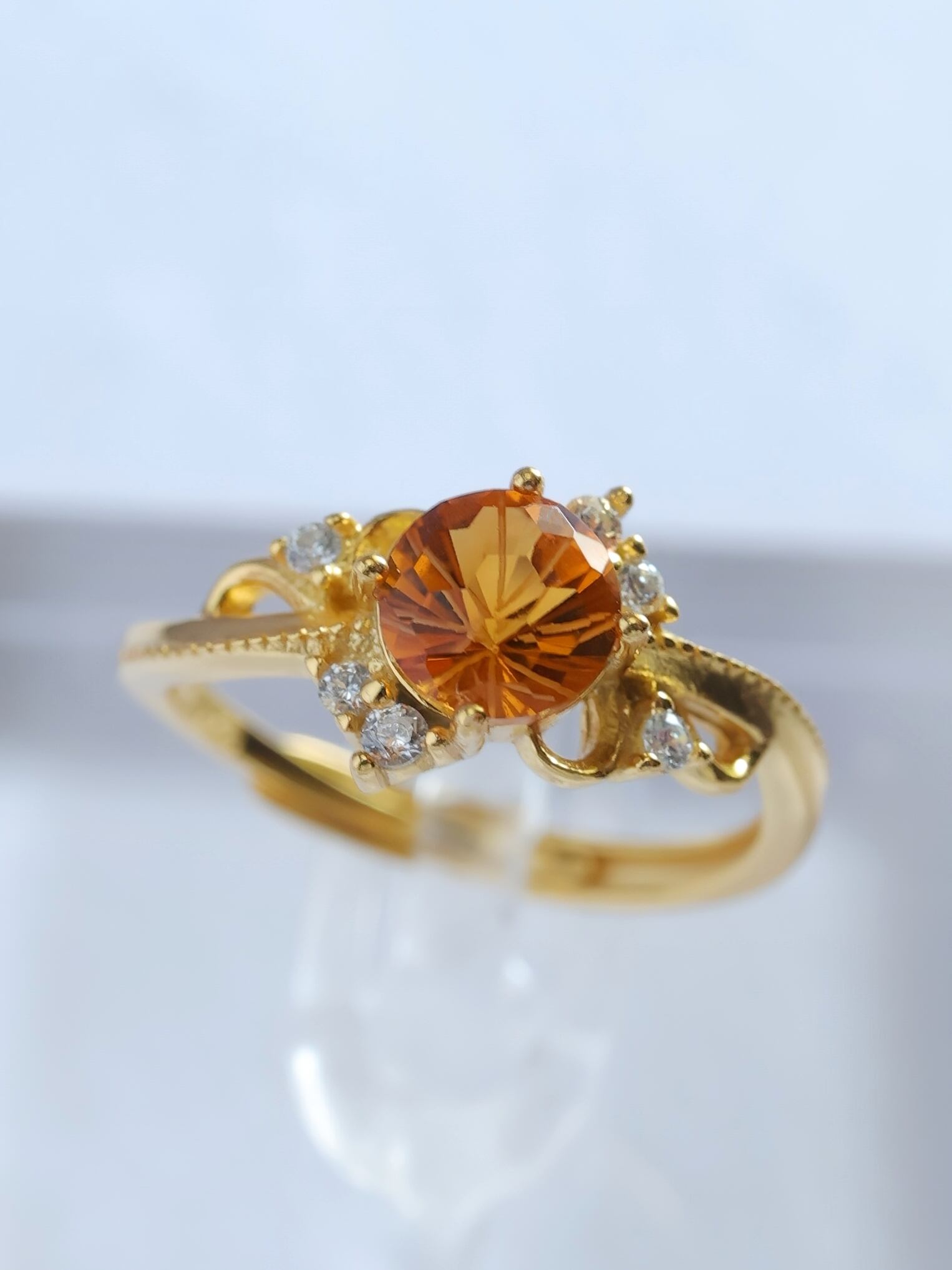 6mmサイズの高品質シトリンは、澄んだ蜂蜜のような色合いと、揺らめく炎のような奥行きのある輝きが魅力。宝石を支える台座は繊細な爪と王冠のようなシルエットで、正統派の品格を感じさせる造りに仕立てました。