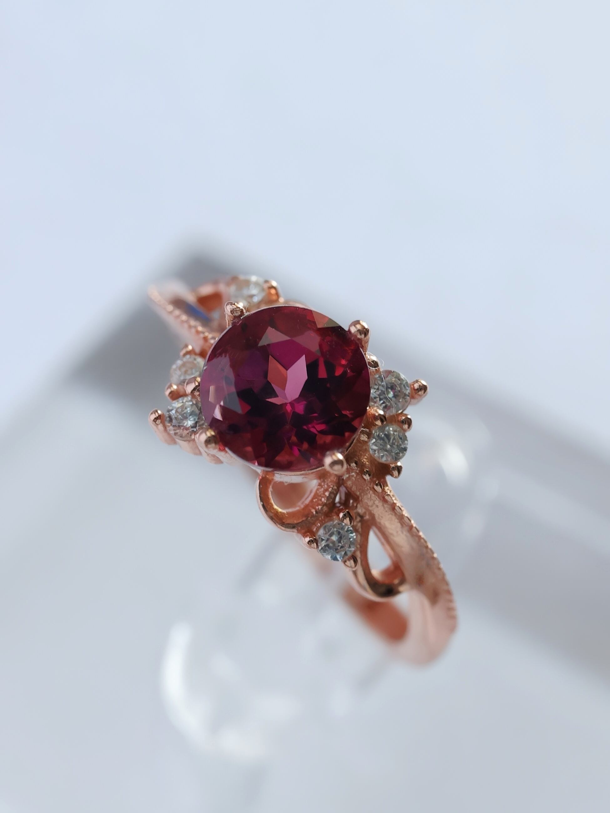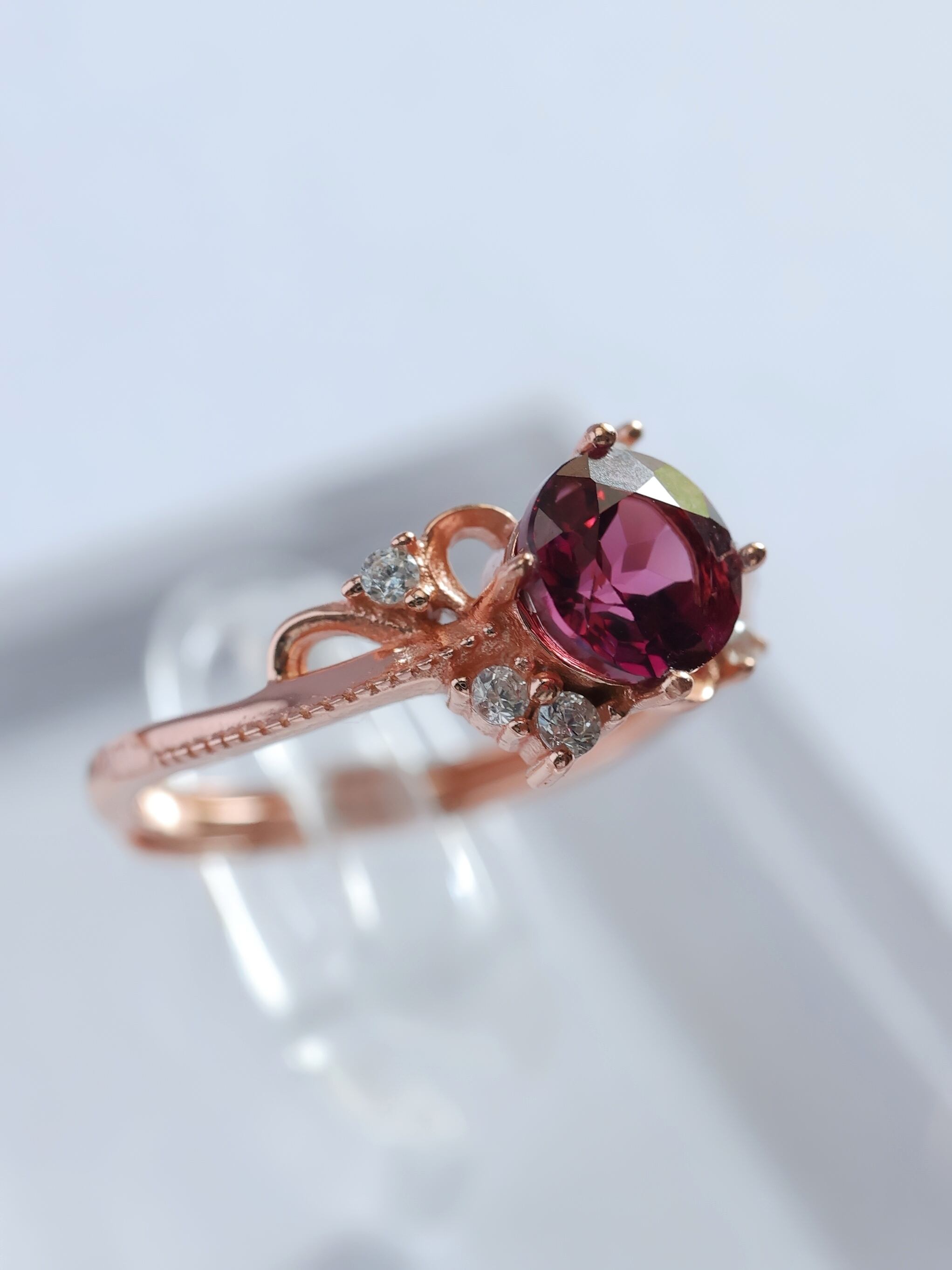 センターには、深みのある赤が美しい6mmラウンドカットのロードライトガーネットを。わずかに紫みを帯びた色合いが、大人の女性の凛とした魅力を引き立てます。