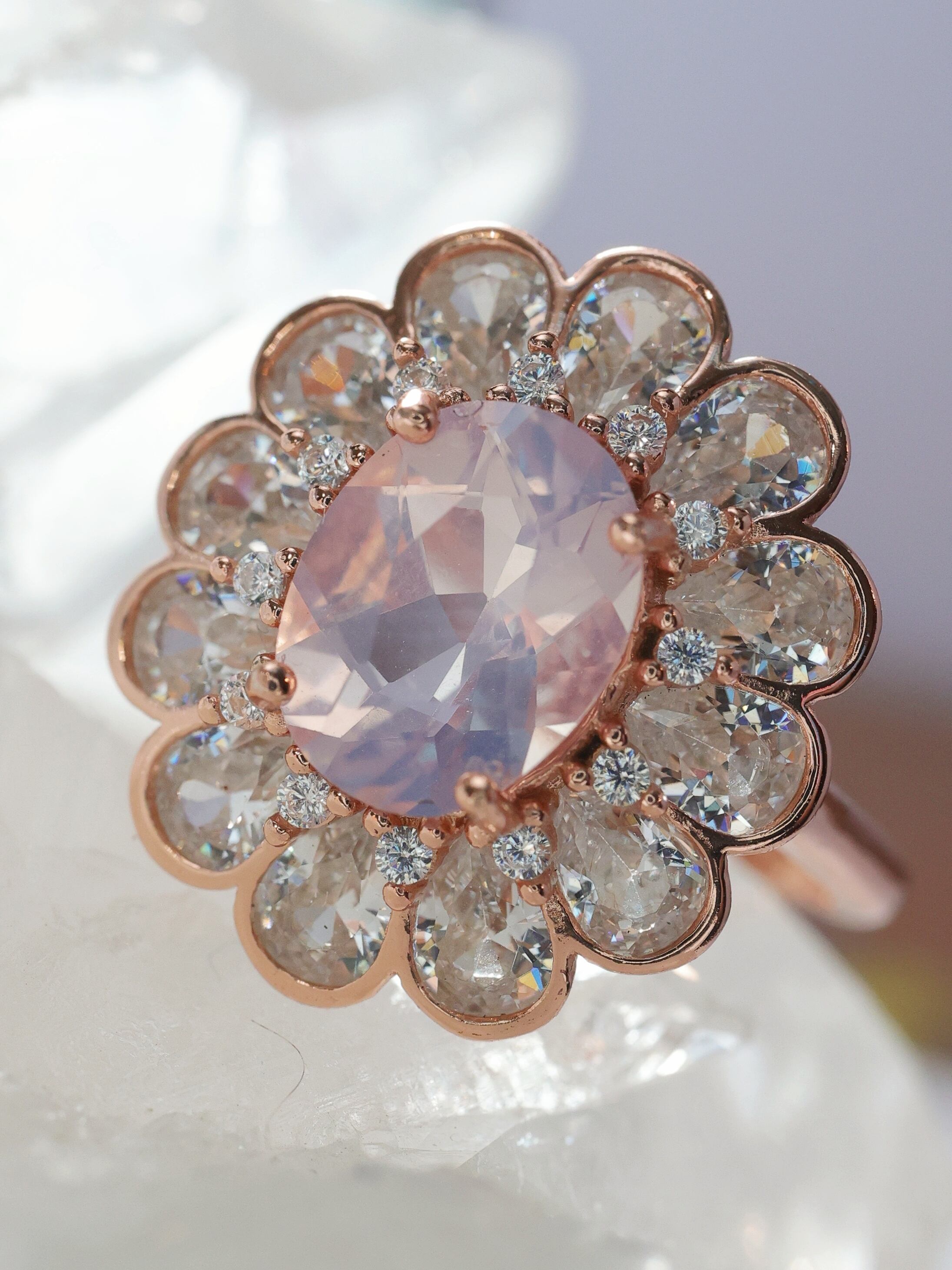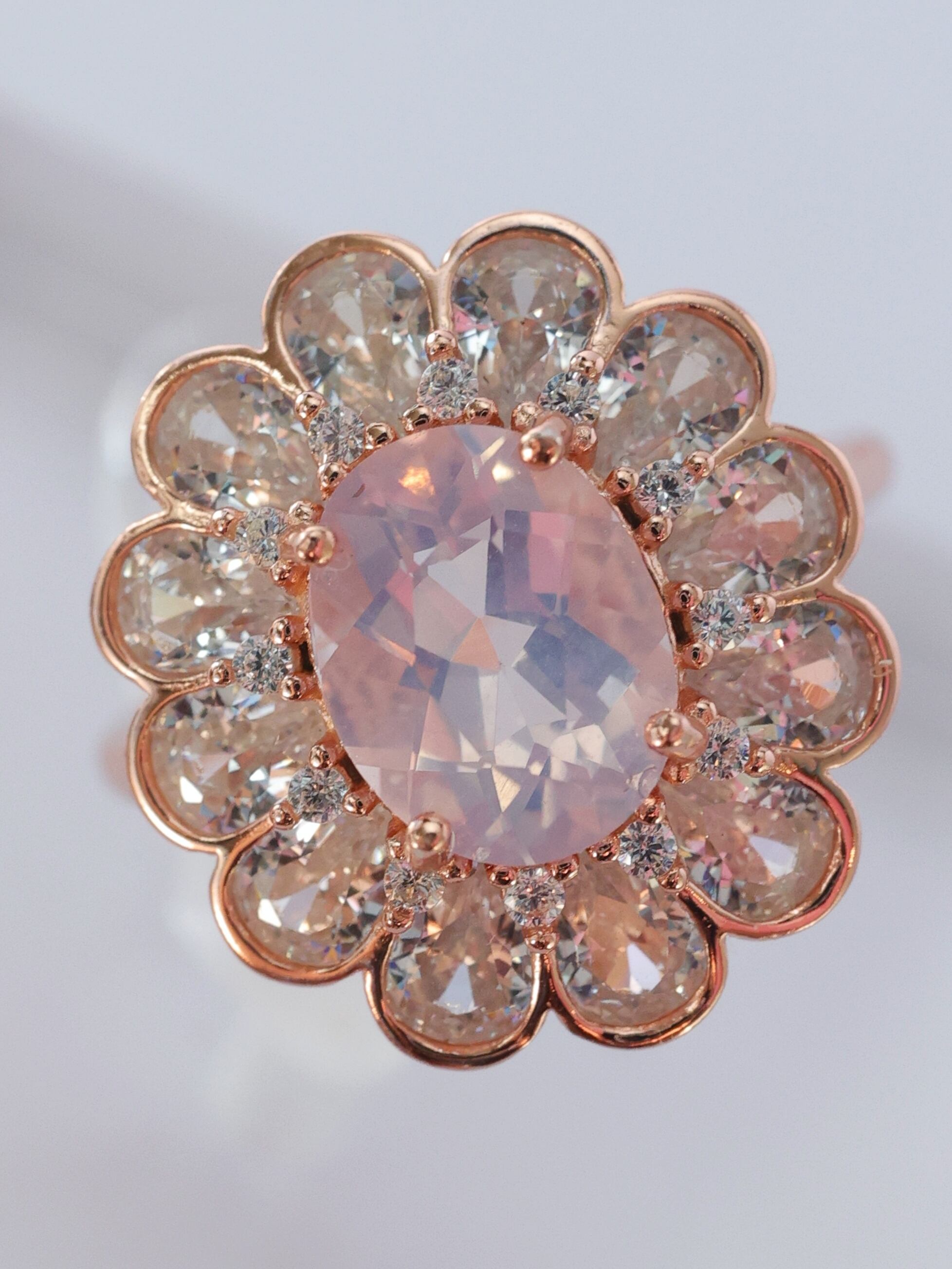 周囲には花びらを模したペアシェイプカットのジルコニアをぐるりと配し、さらにその間にラウンドカットのジルコニアをあしらうことで、まるで花弁に朝露がきらめくような繊細な表情に仕上げました。
