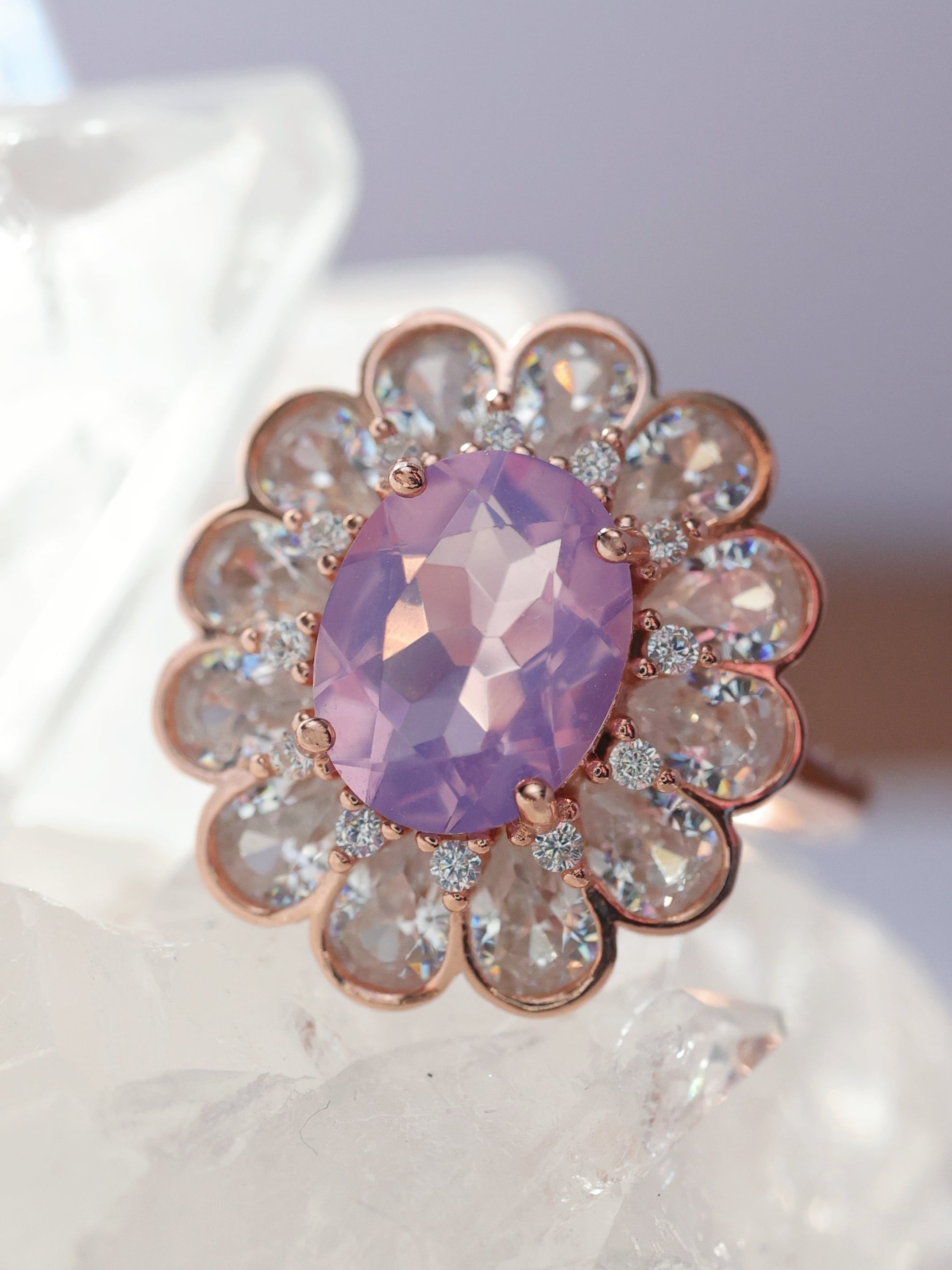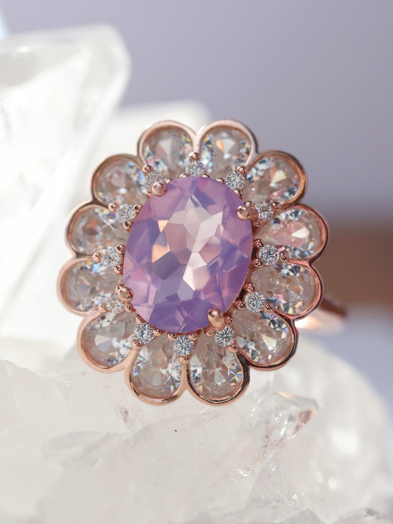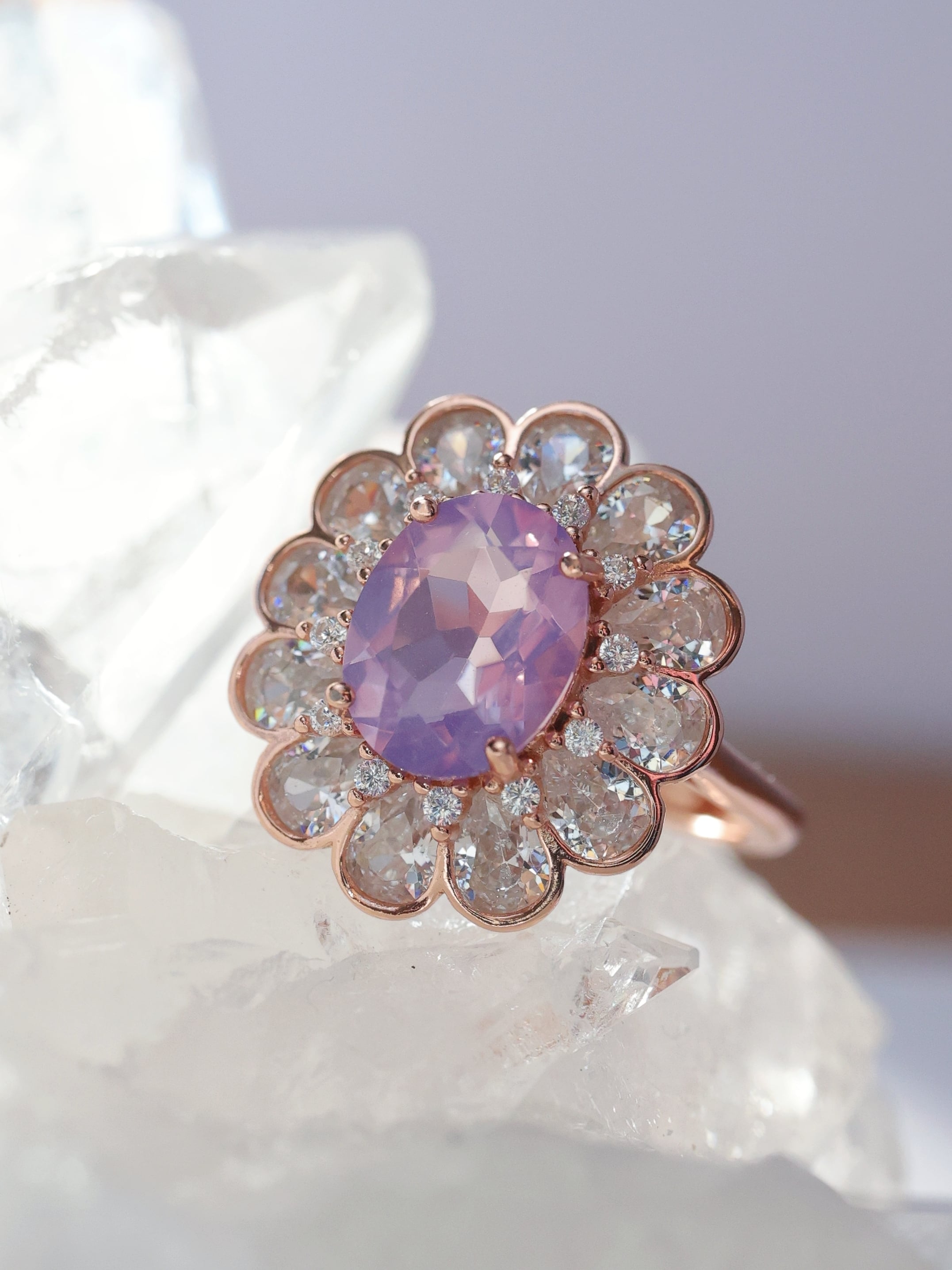 淡く揺れるピンクと紫のグラデーションは、見る角度によって表情を変え、まるで心を映す鏡のよう。