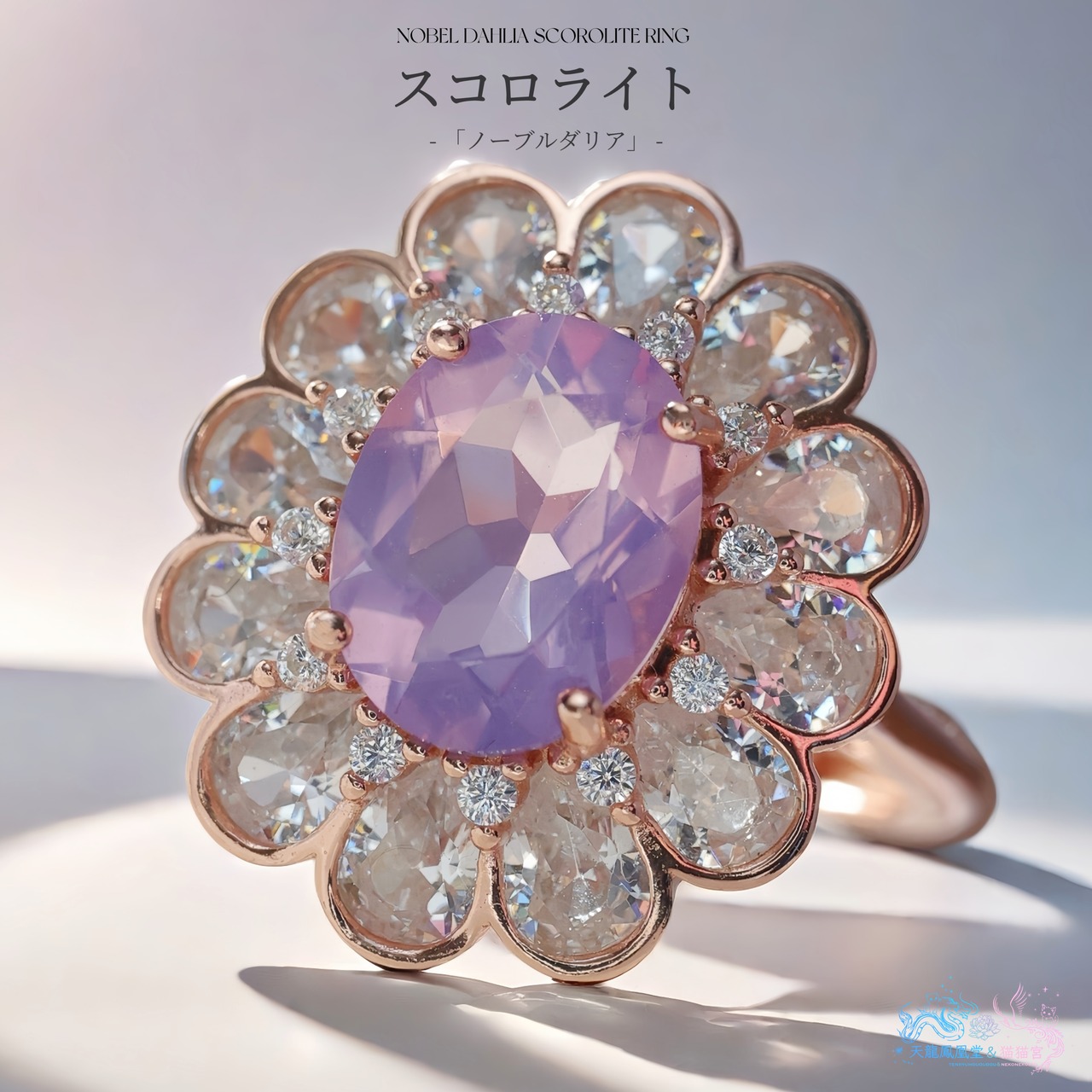 花弁を思わせるペアシェイプストーンの煌めきが、中央のスコロライトを優美に引き立て、可憐な花を咲かせます。