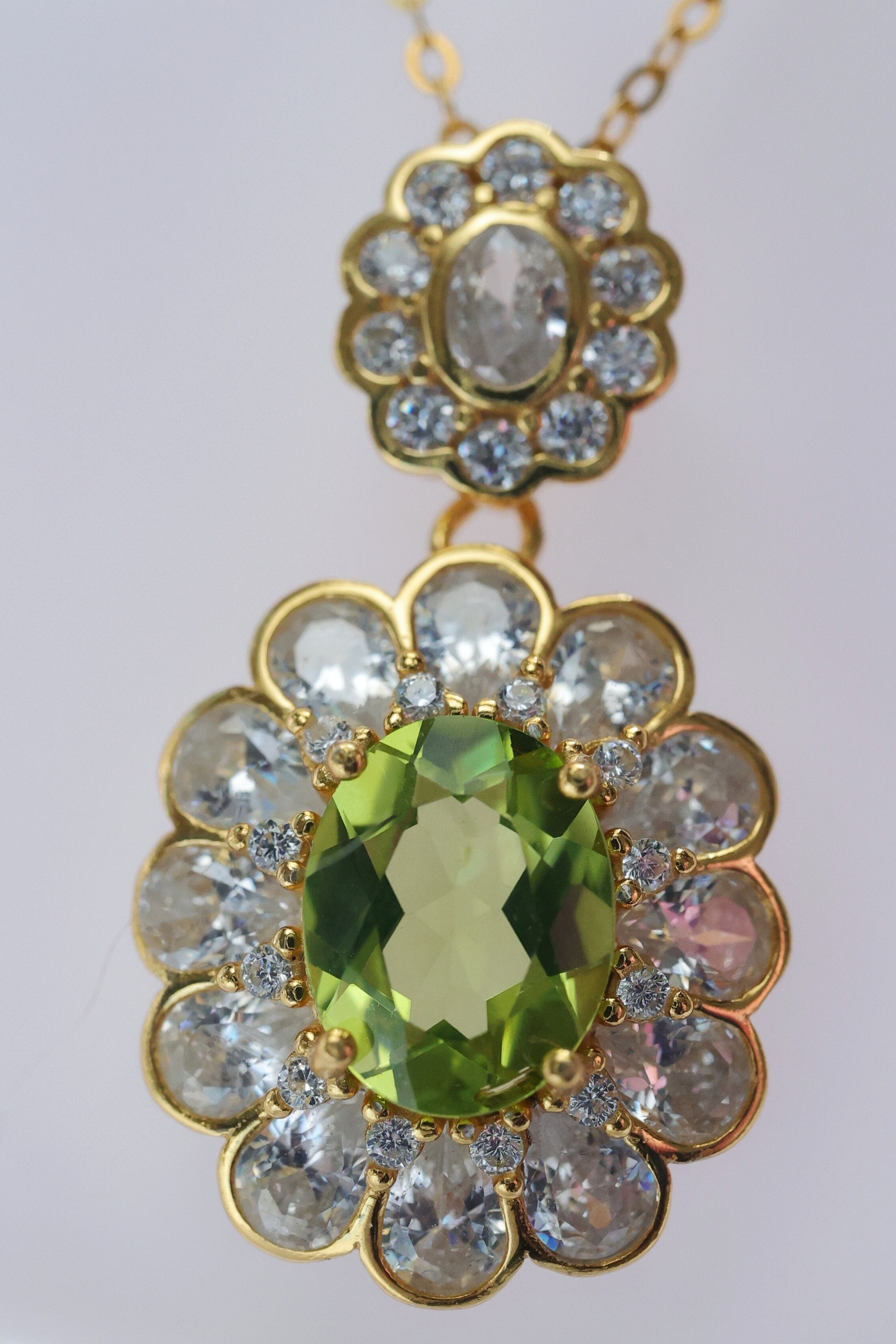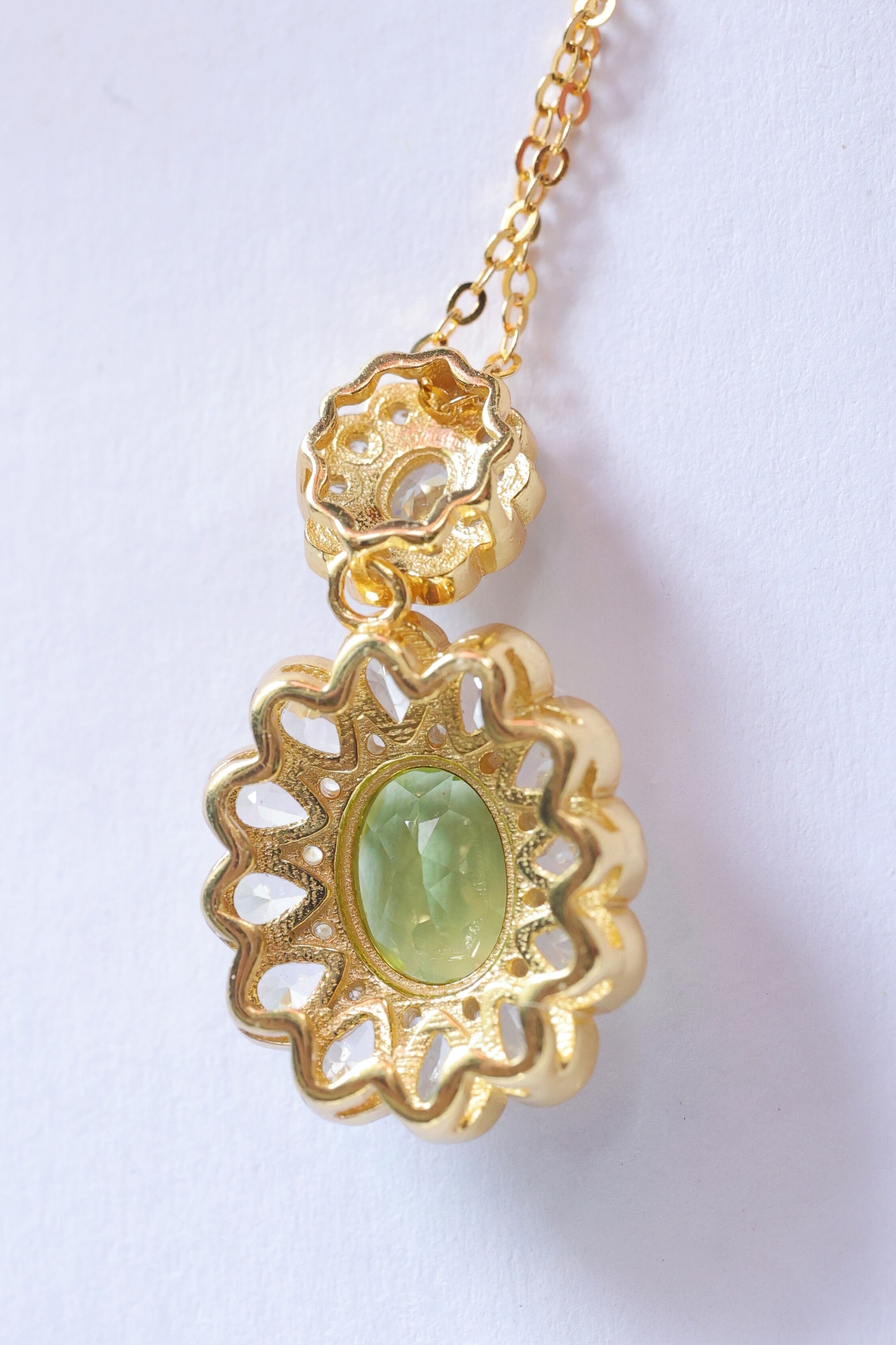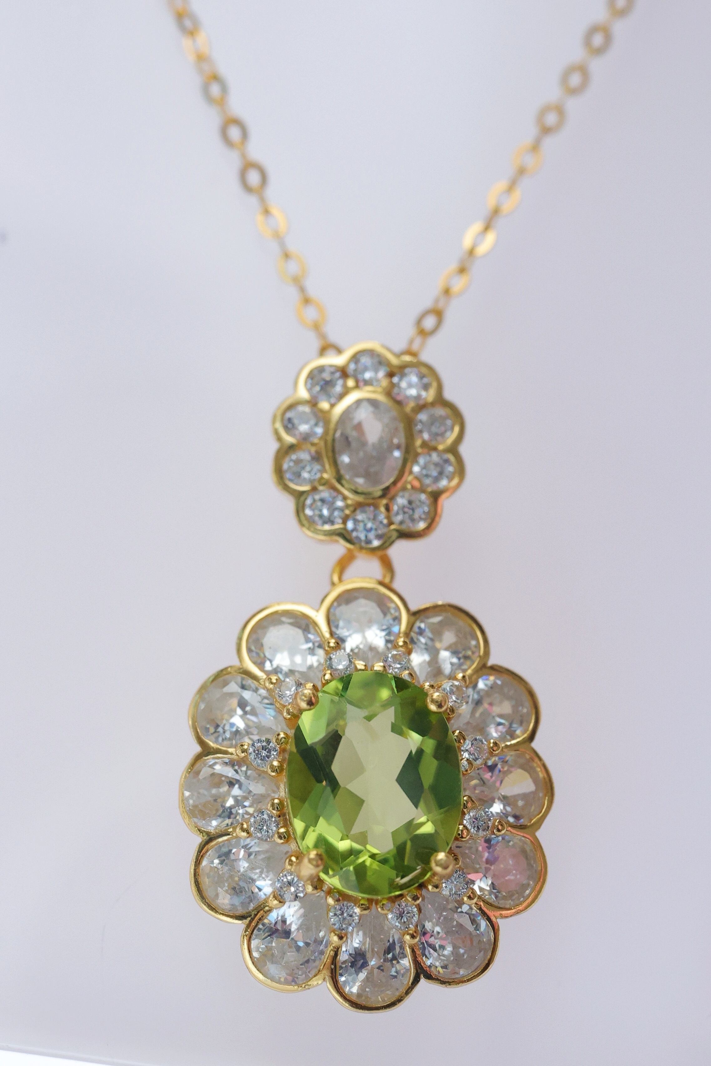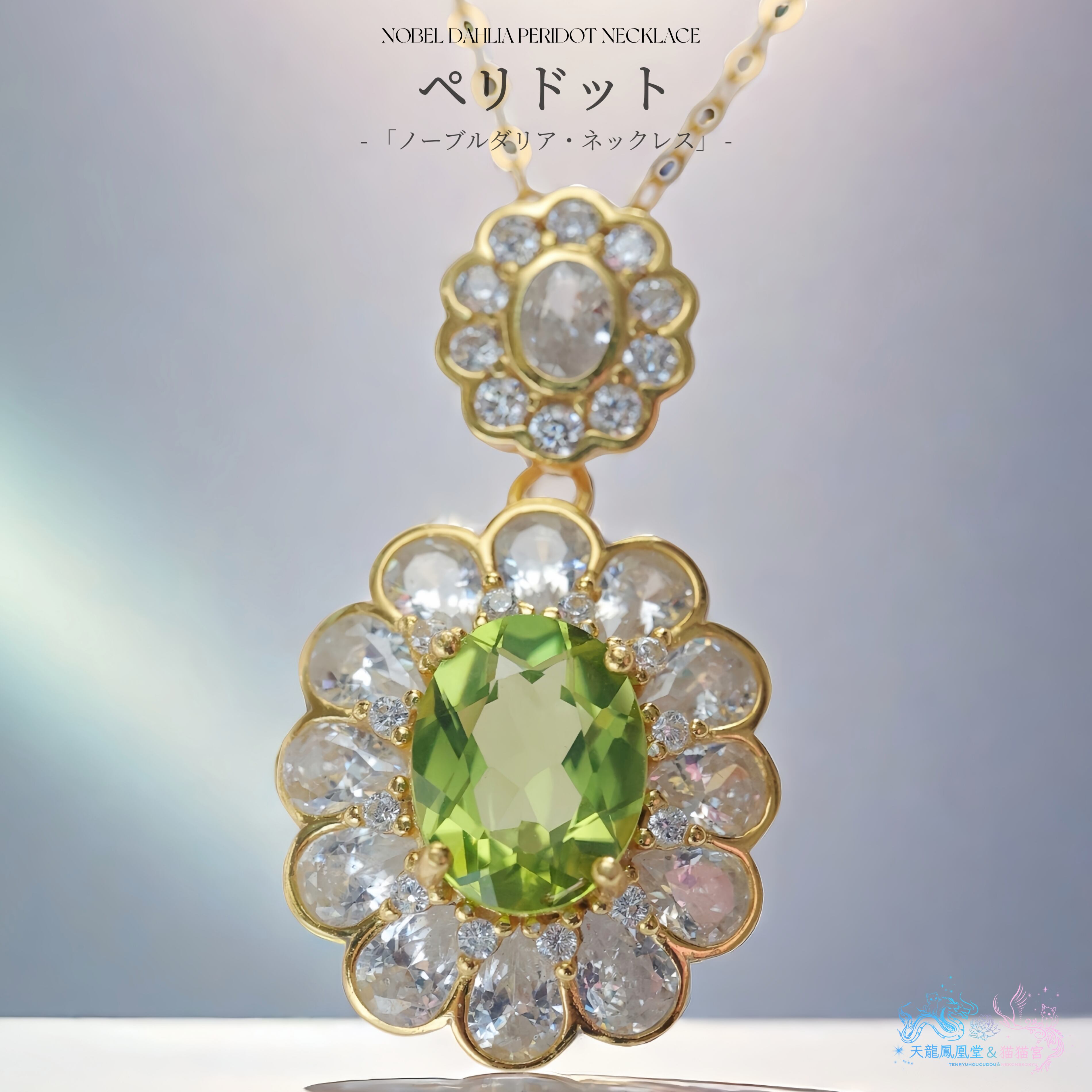 鮮やかで明るい彩りが魅力の天然ペリドットを、ダリアの花を模した華やかなデザインに仕立てたネックレスです。