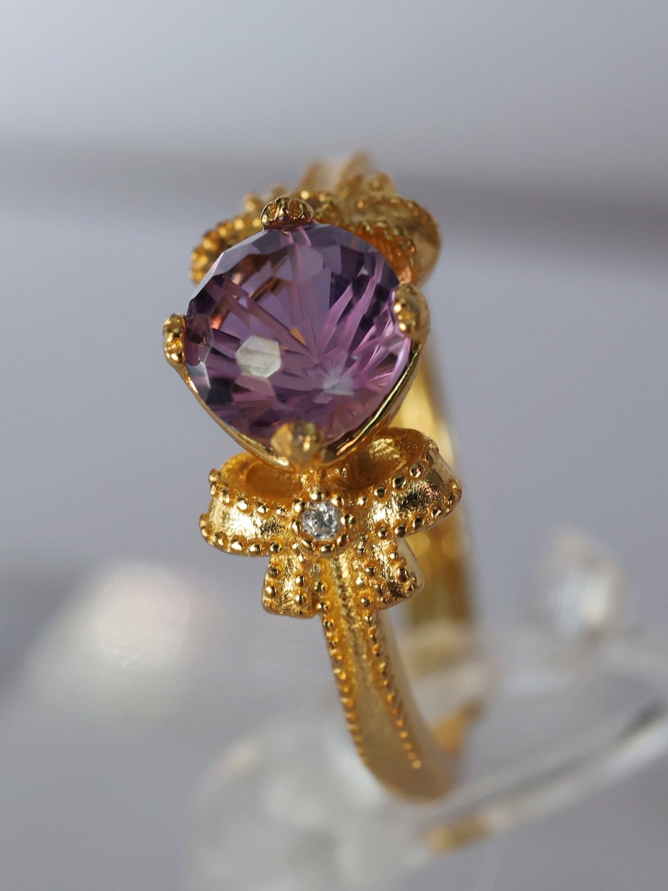 花火カットアメジスト × ゴールドリボンリング