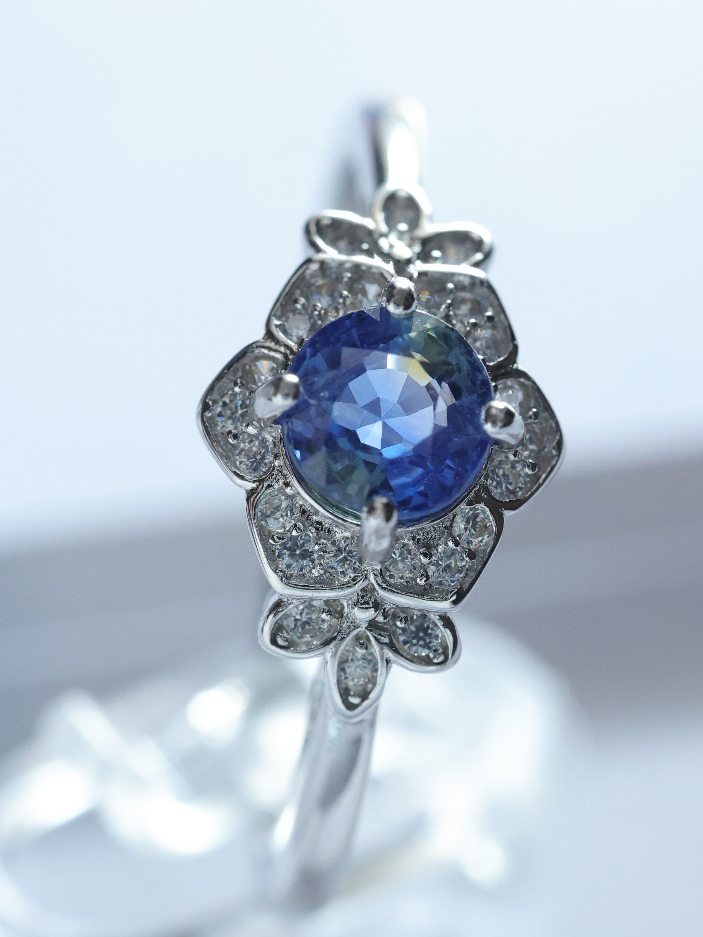 石座には、7Aグレードの高品質ジルコニアを花の花弁のように配置し、中央のサファイアを優しく包み込むようなデザインに。