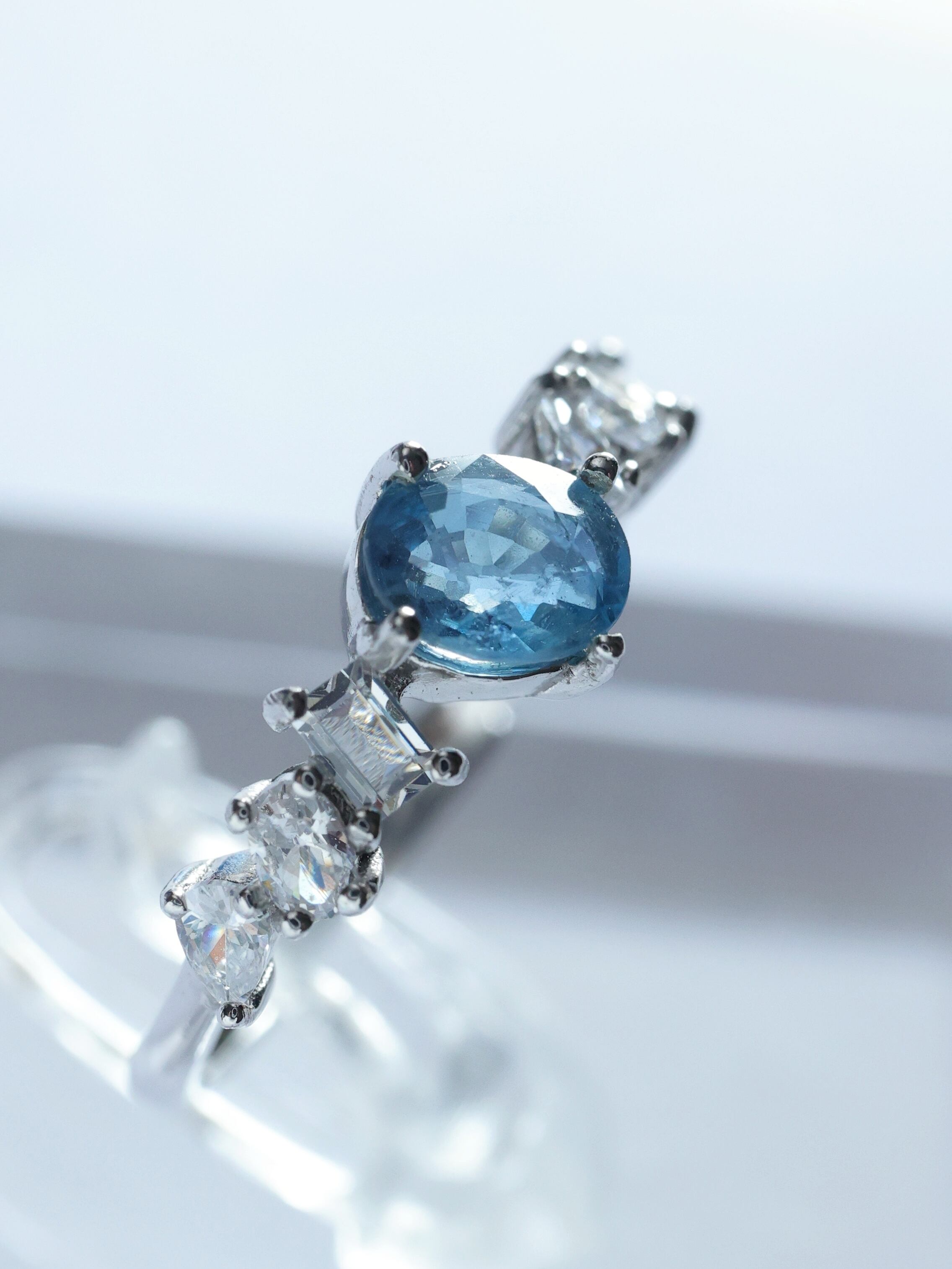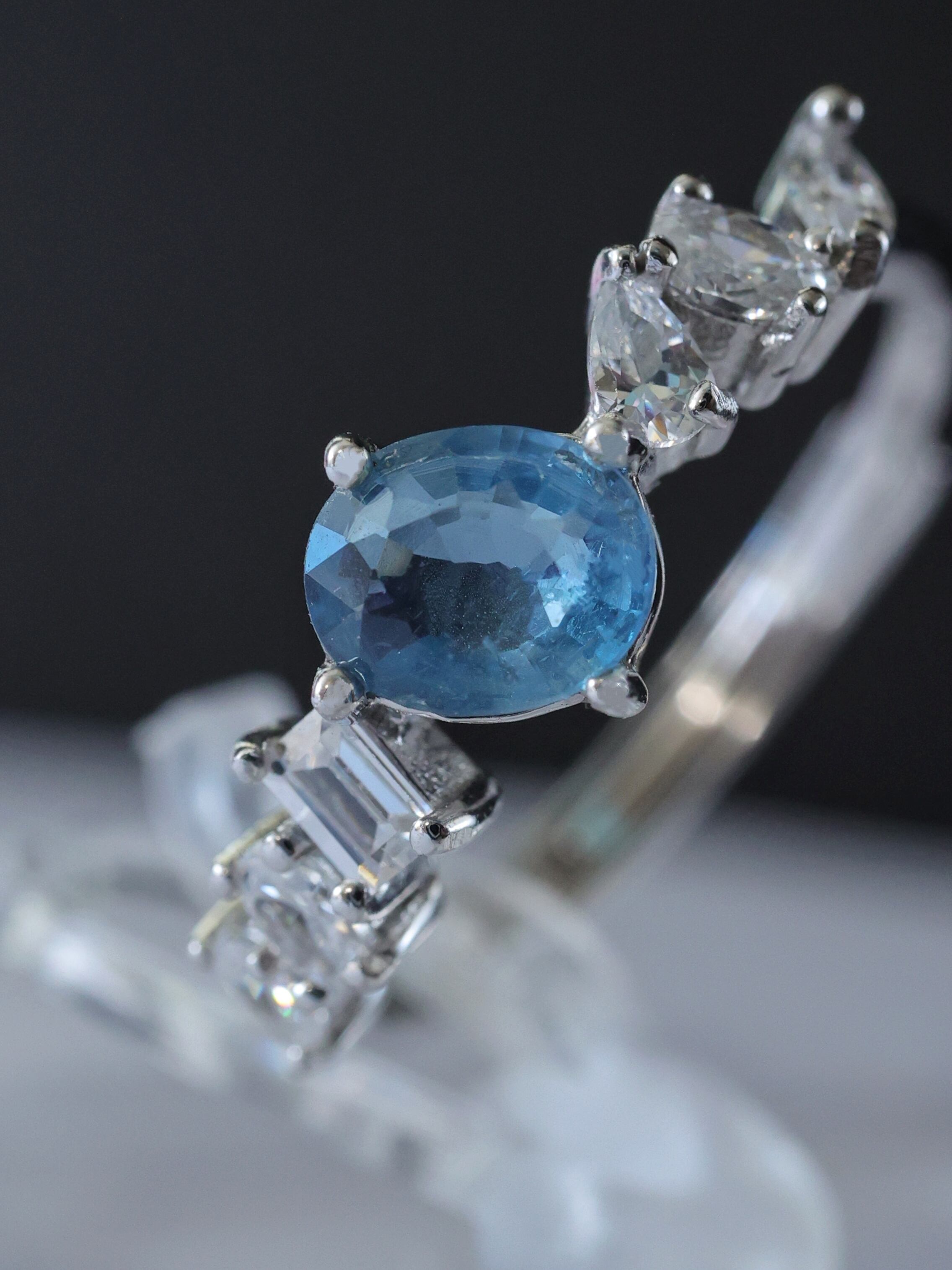 マーキス、バゲット、トリリアント——それぞれ異なるカットのジルコニアが並び、繊細でリズミカルな光を添えることで、中央のアクアマリンをより一層際立たせています。