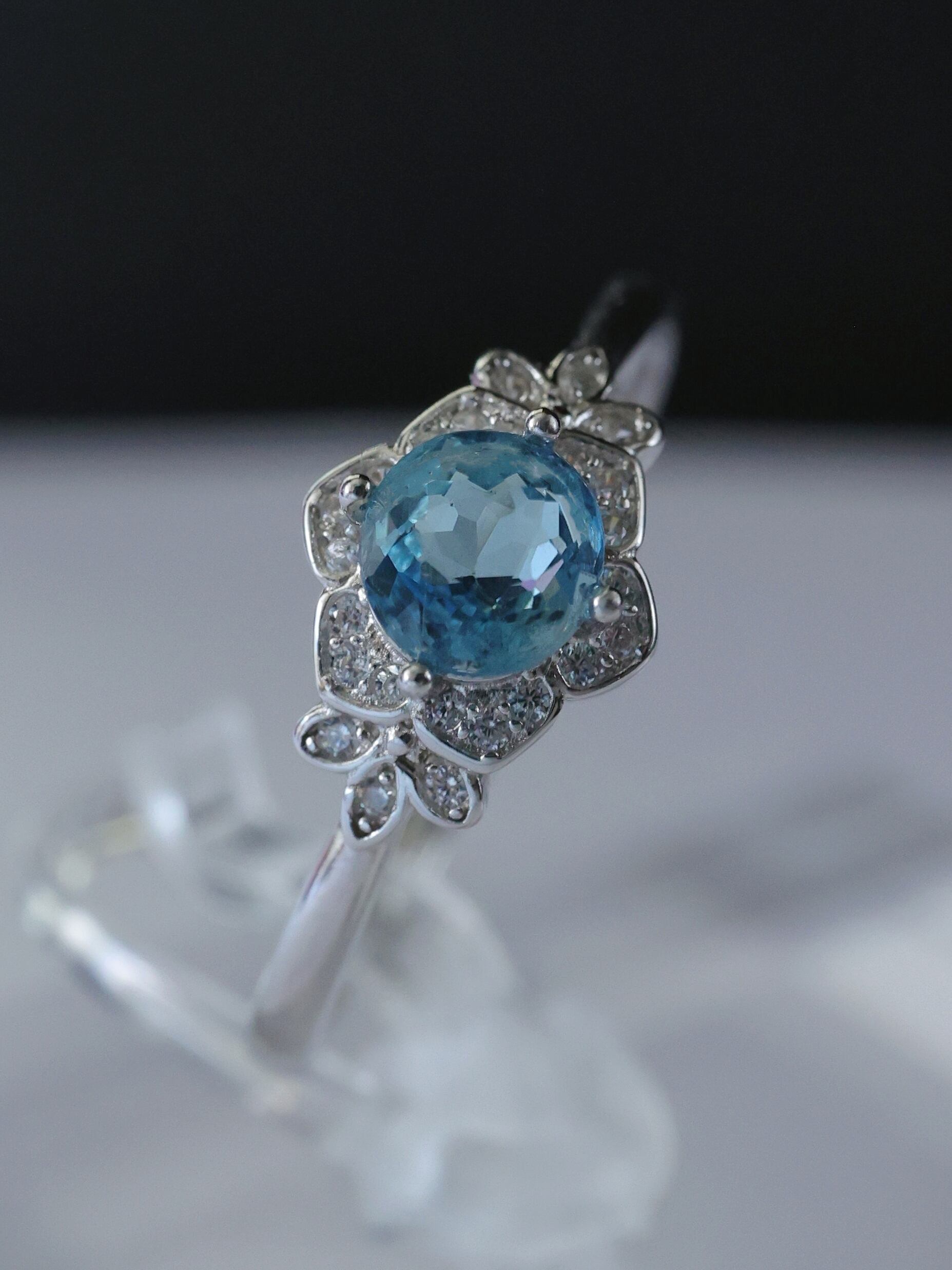 石座には、7Aグレードの高品質ジルコニアを花の花弁のように配置し、中央のサファイアを優しく包み込むようなデザインに。