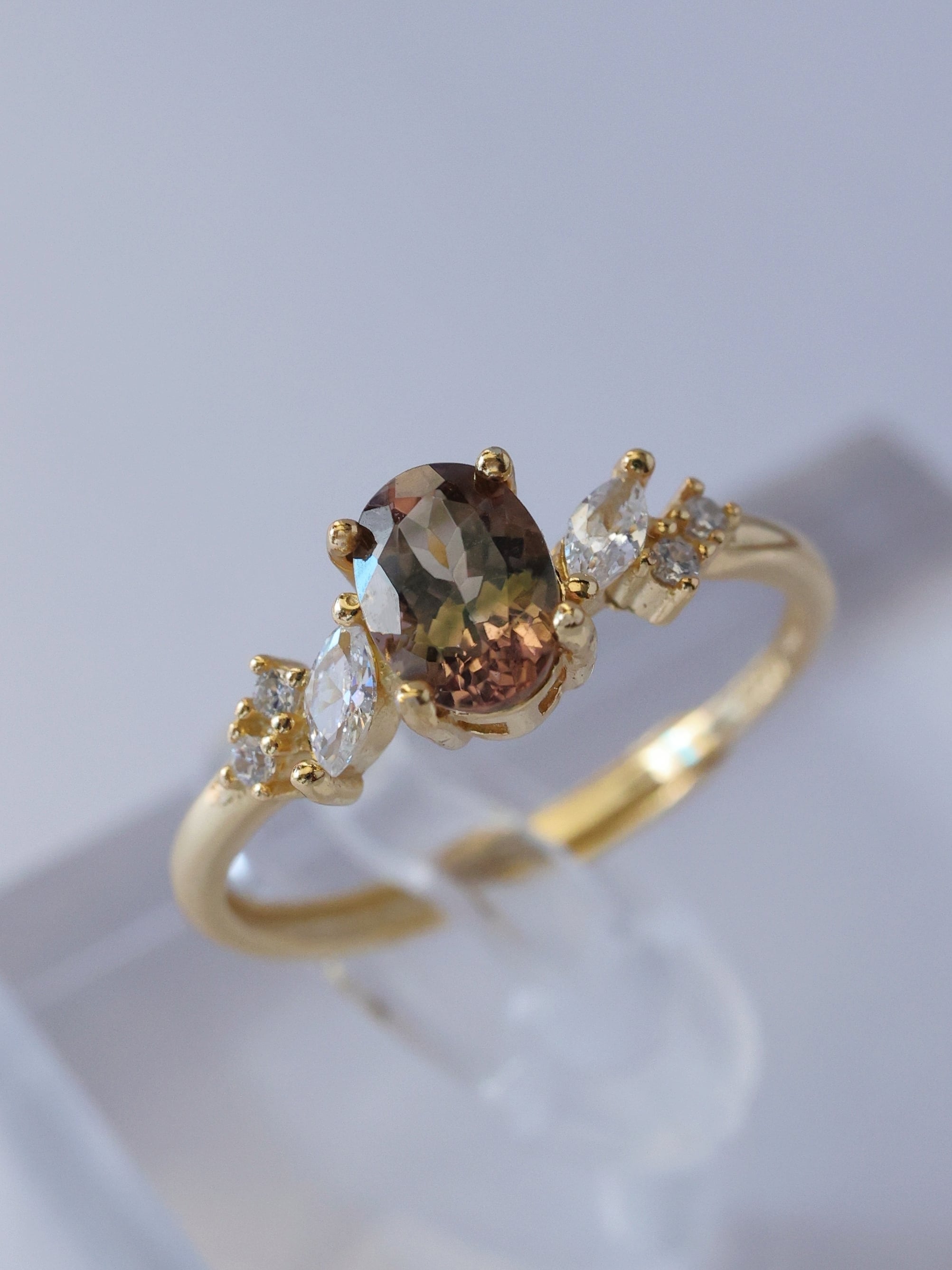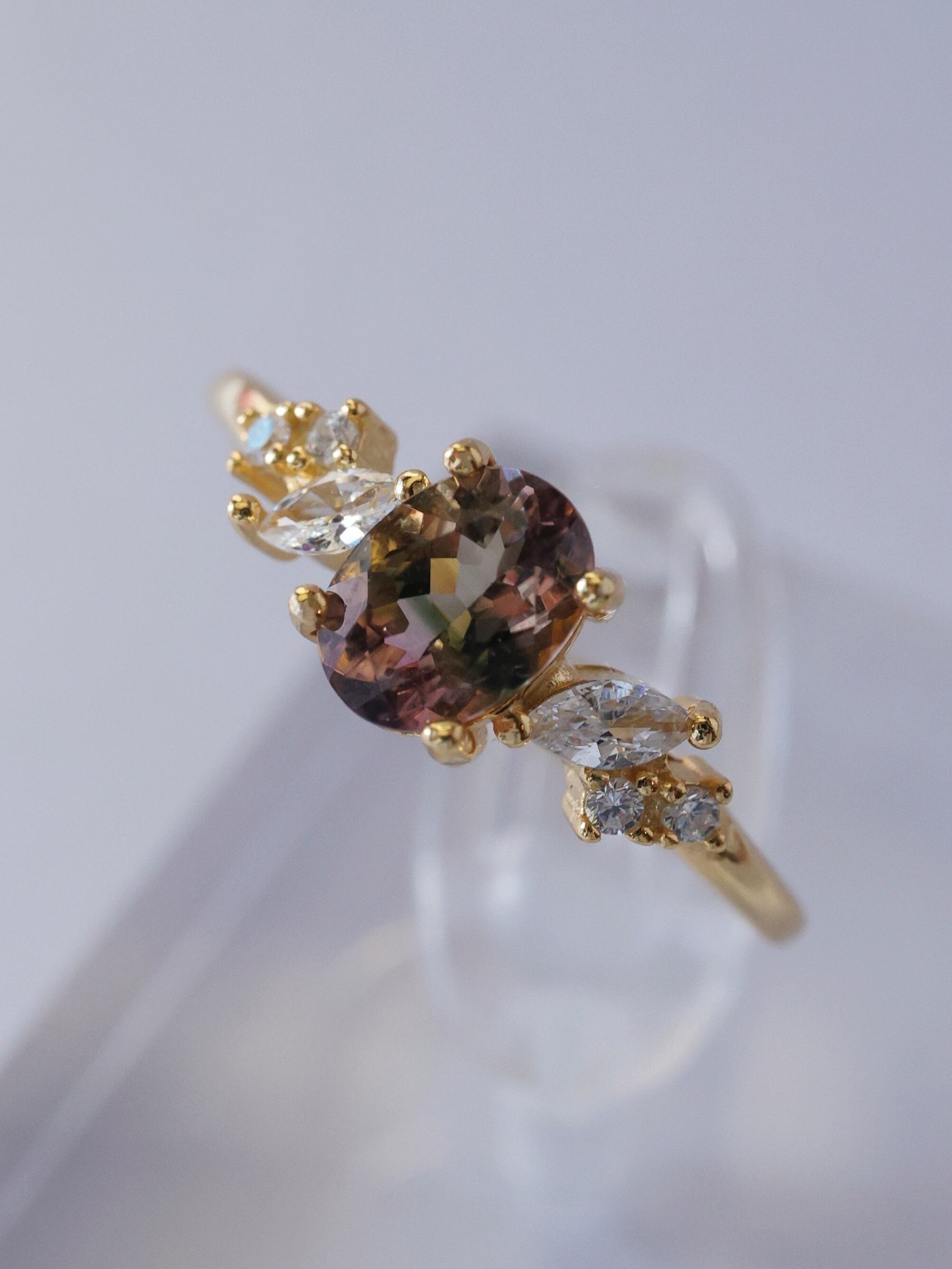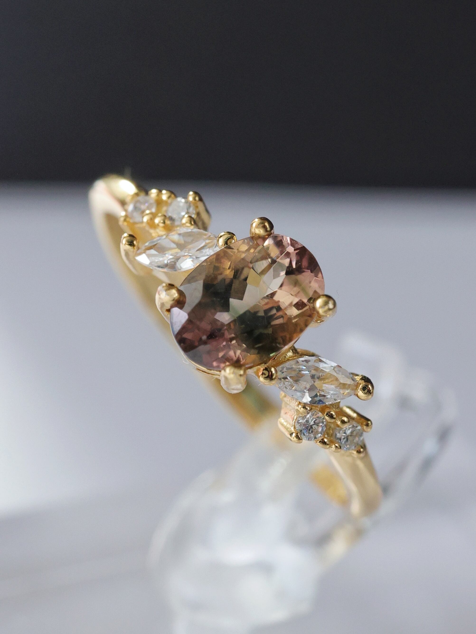 選び抜かれたバイカラートルマリンが見せるのは、深みのあるブラウンと柔らかなオリーブグリーンの絶妙なバランス。