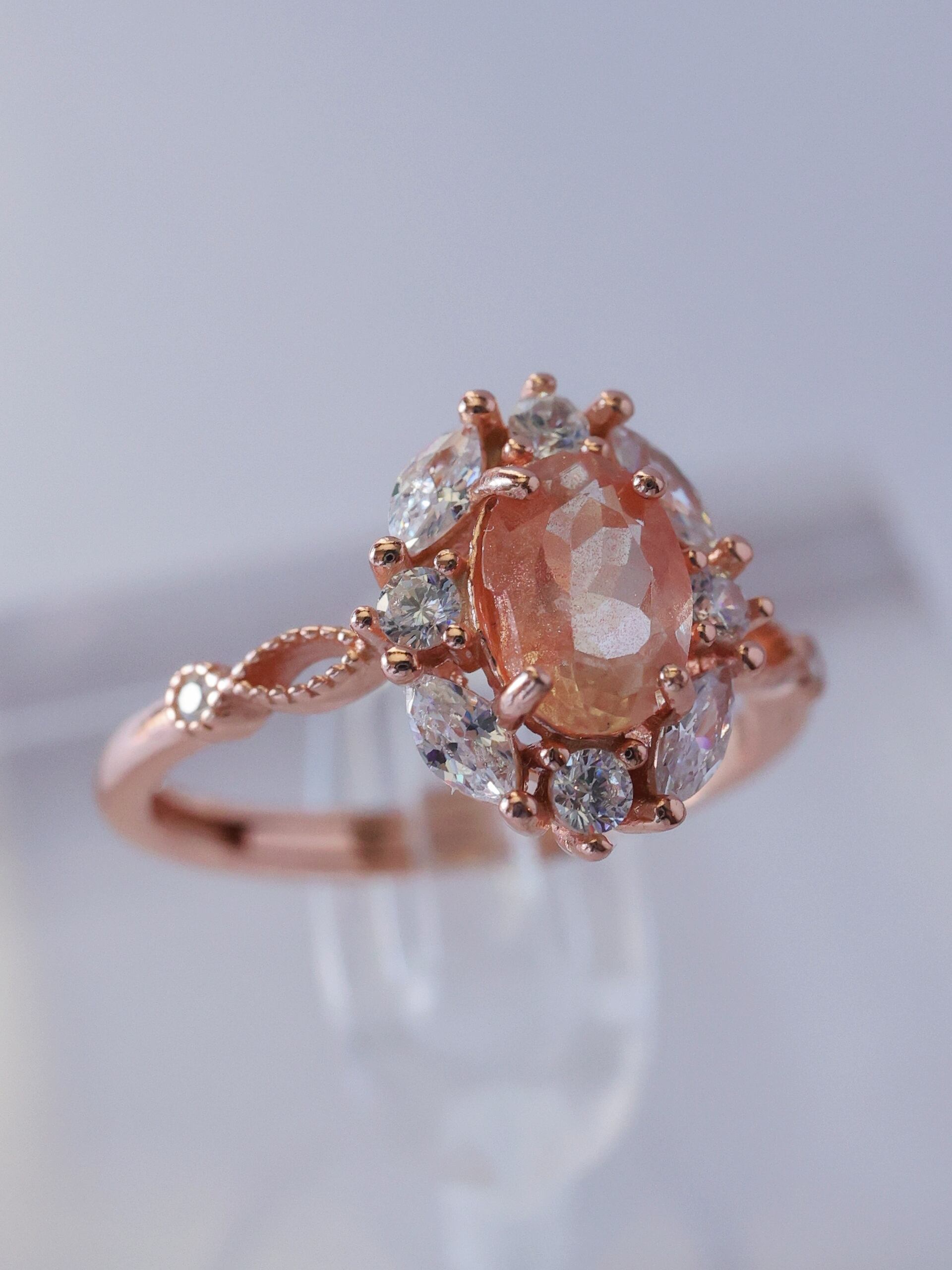 ピーチゴールドのような柔らかな色合いの中に、繊細なシラー(光のきらめき)が浮かび上がり、まるで夕陽が宝石の中で揺れているかのよう。