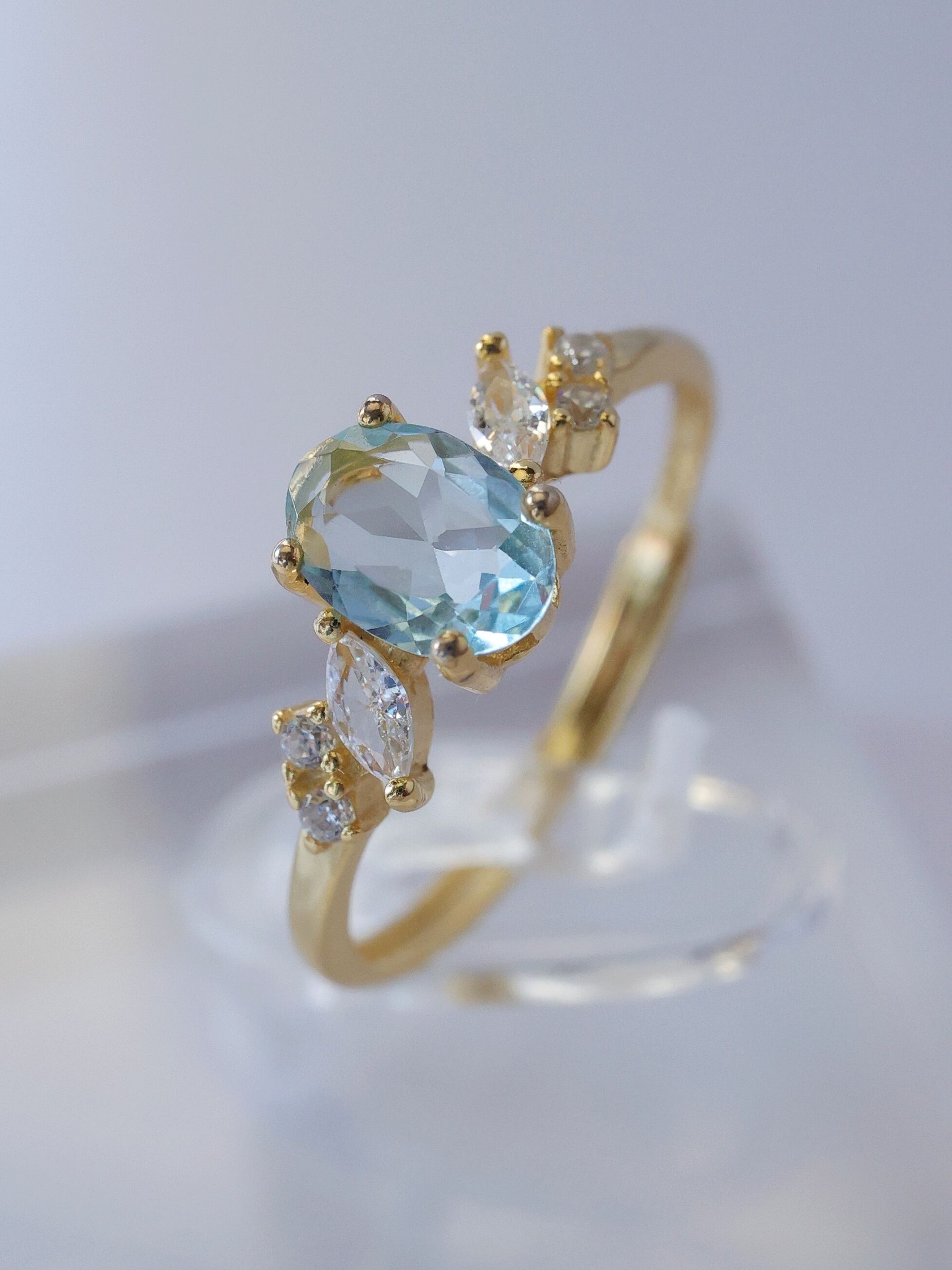 センターには、上質な天然アクアマリンをオーバルカットでセット。