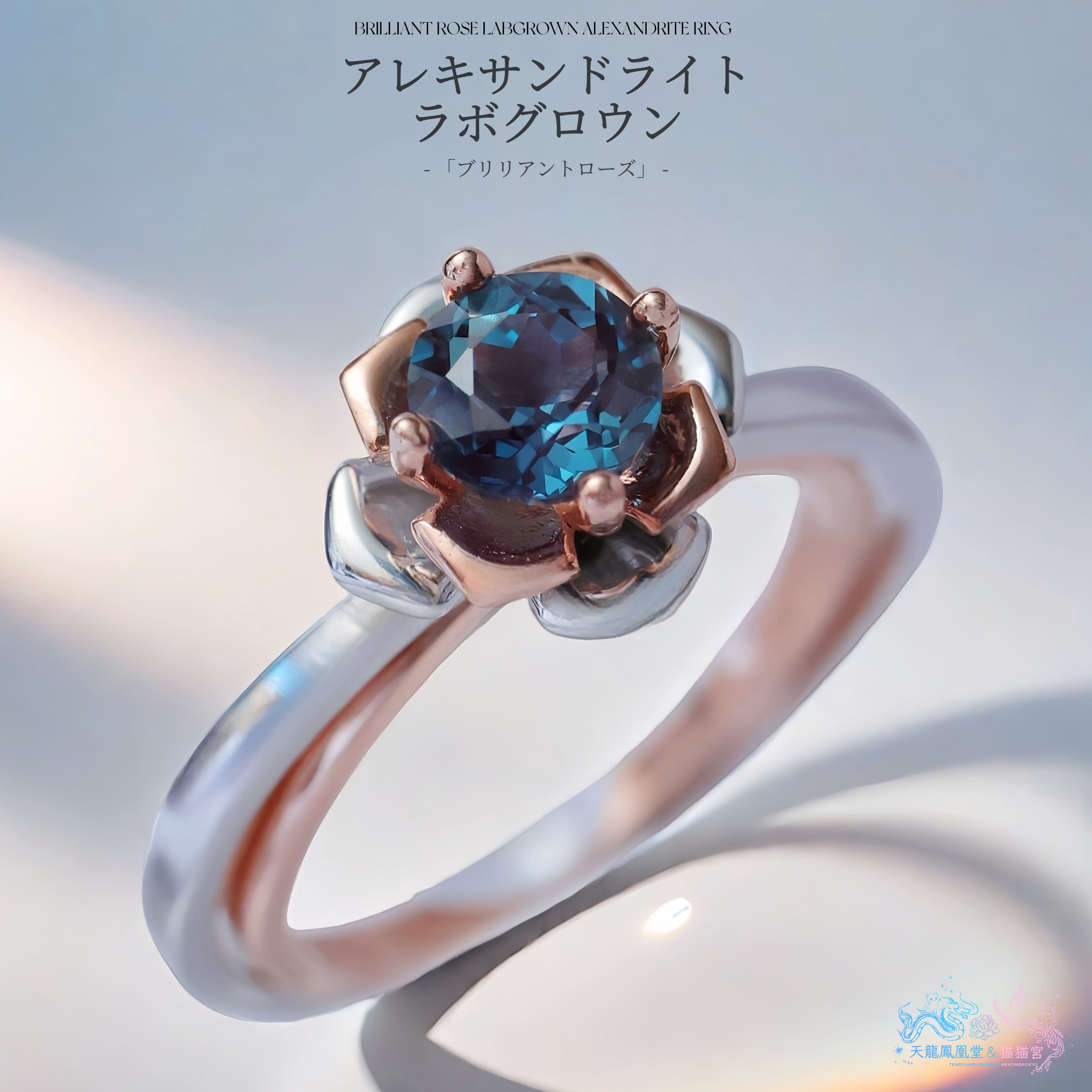 天然と同一の化学組成と光学特性を持ち、ルーペクリーンランクの美しい透明感と共に、光源によって色を変える“奇跡の宝石”です。