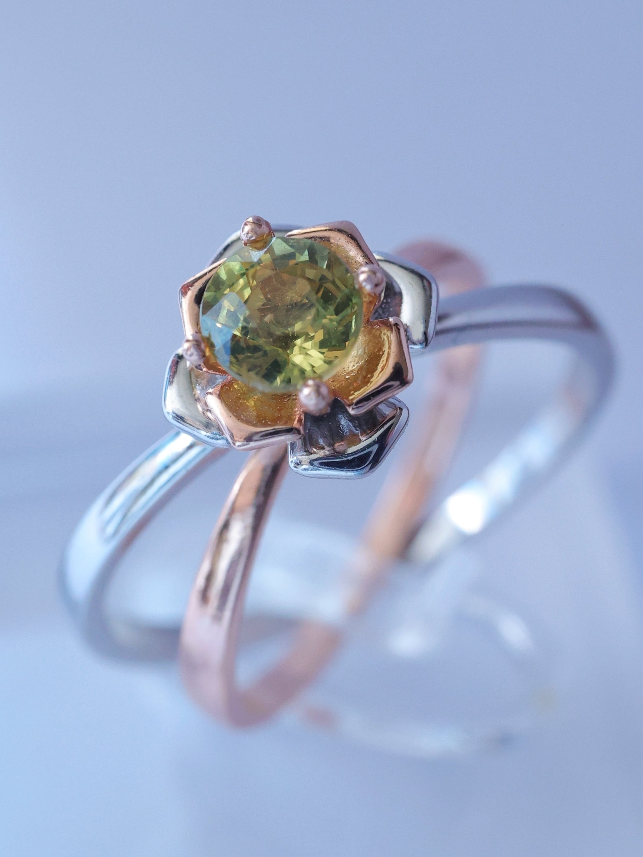 今回使用したルースは、ライムグリーンにほんのりとイエローが差す、“陽だまり”のような温かく華やかな色合い。透明度も高く、花弁のような瑞々しい輝きを湛えています。
