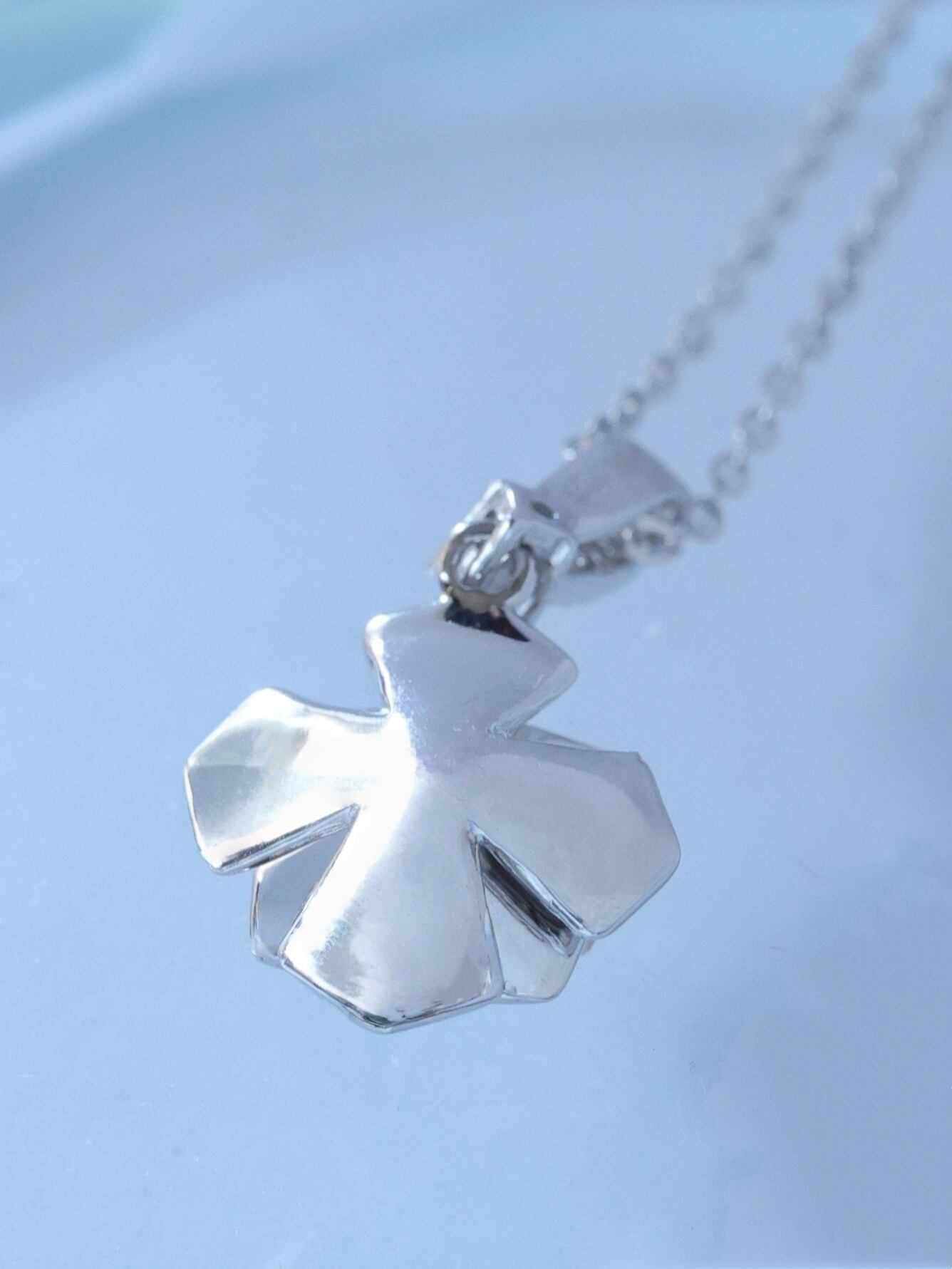 本体は、外側に気品あるロジウムカラー、内側には優美なピンクゴールドカラーを配したダブルカラー構造。胸元に添えるたびに、まるで一輪の花がそっと咲くような存在感を放ちます。