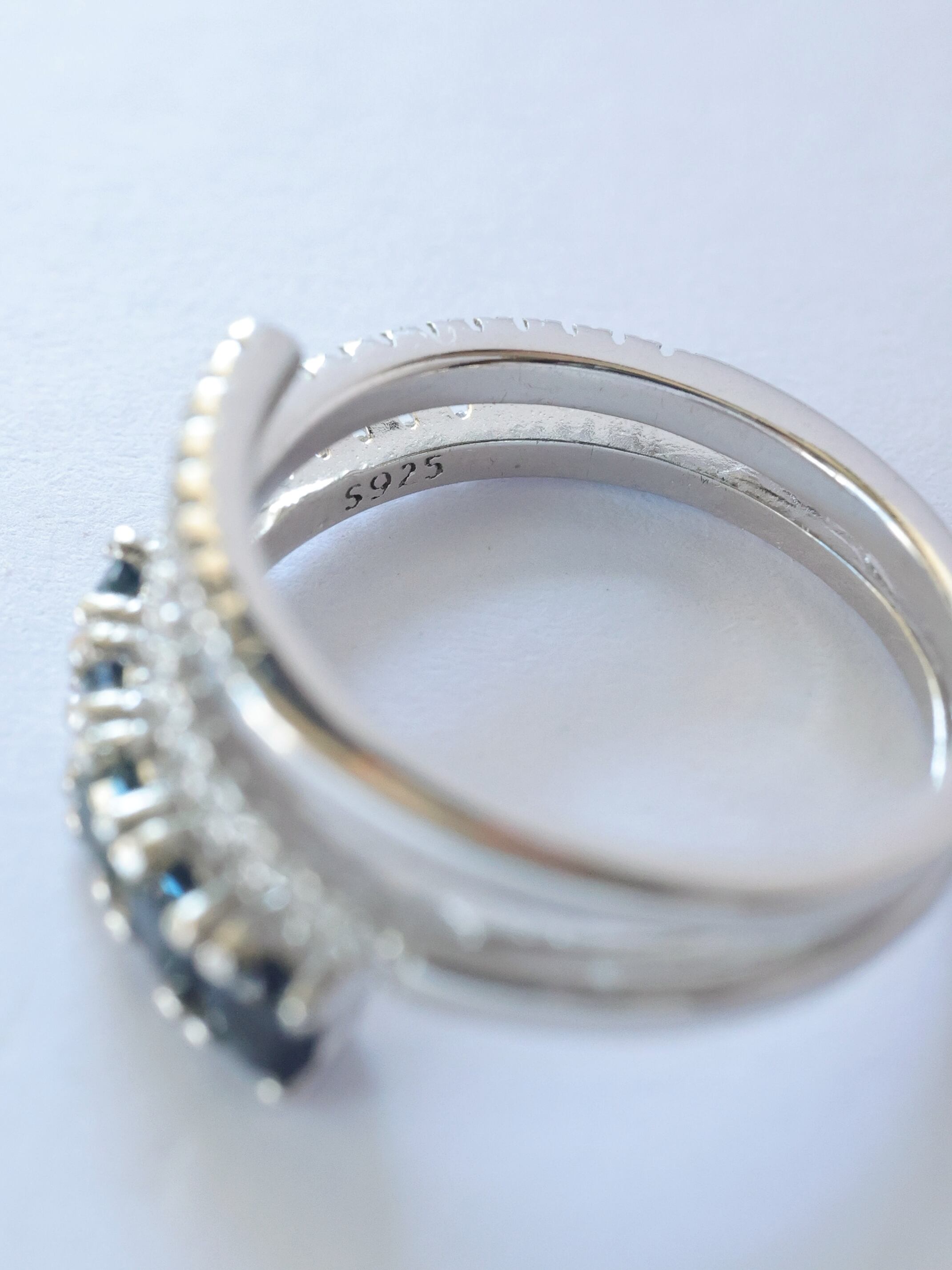 立体感ある3連デザインの中央に配したバイカラーサファイアが、サイドの煌めくジルコニアと調和し、手元を華やかに演出。