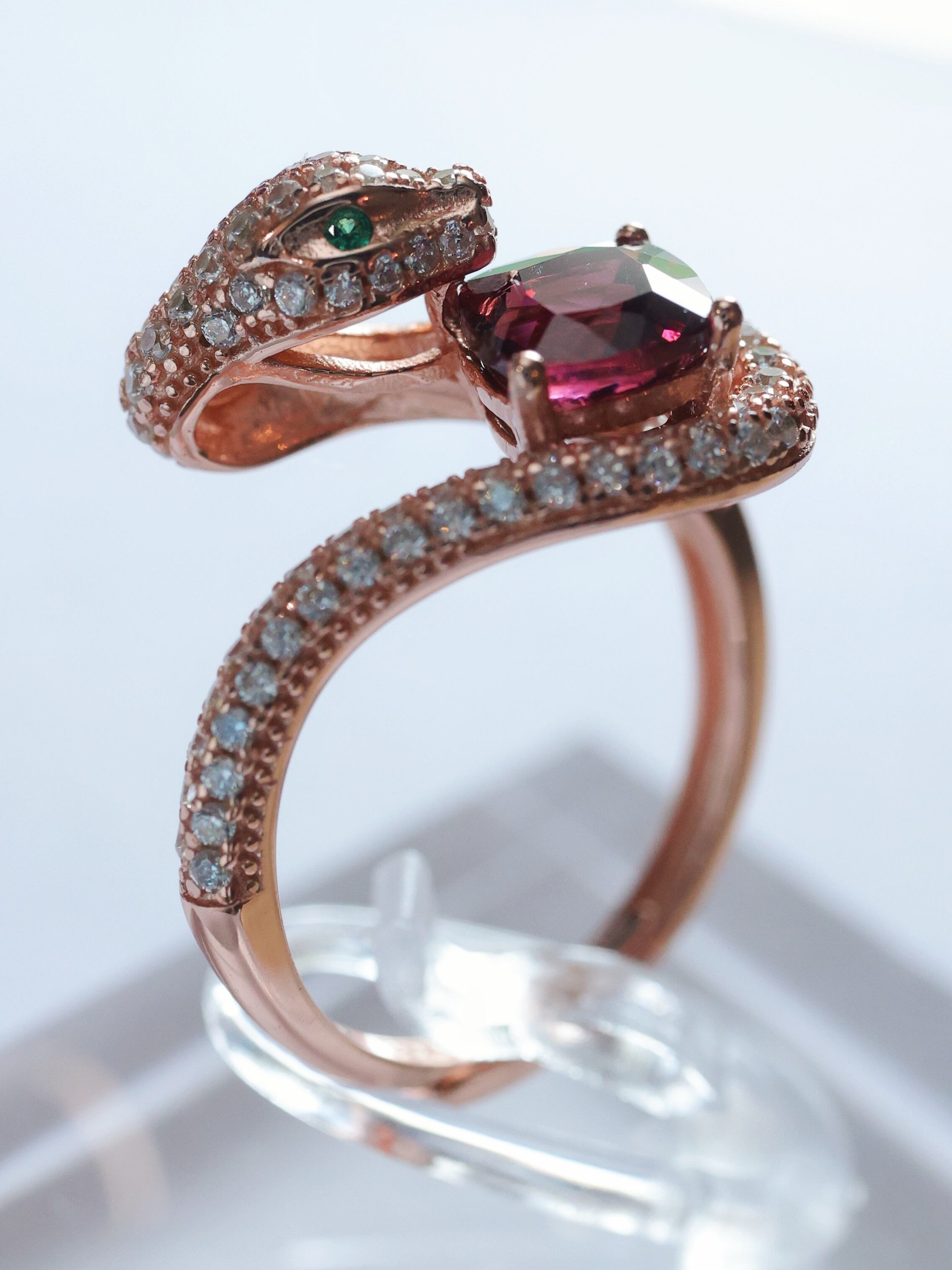 深い紅紫色が魅力のロードライトガーネットを主役に据えた、神秘的な蛇モチーフのリングです。