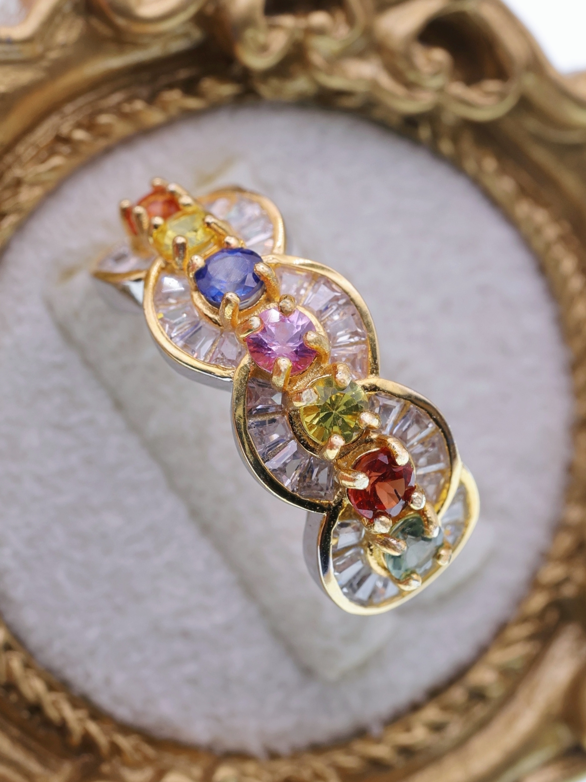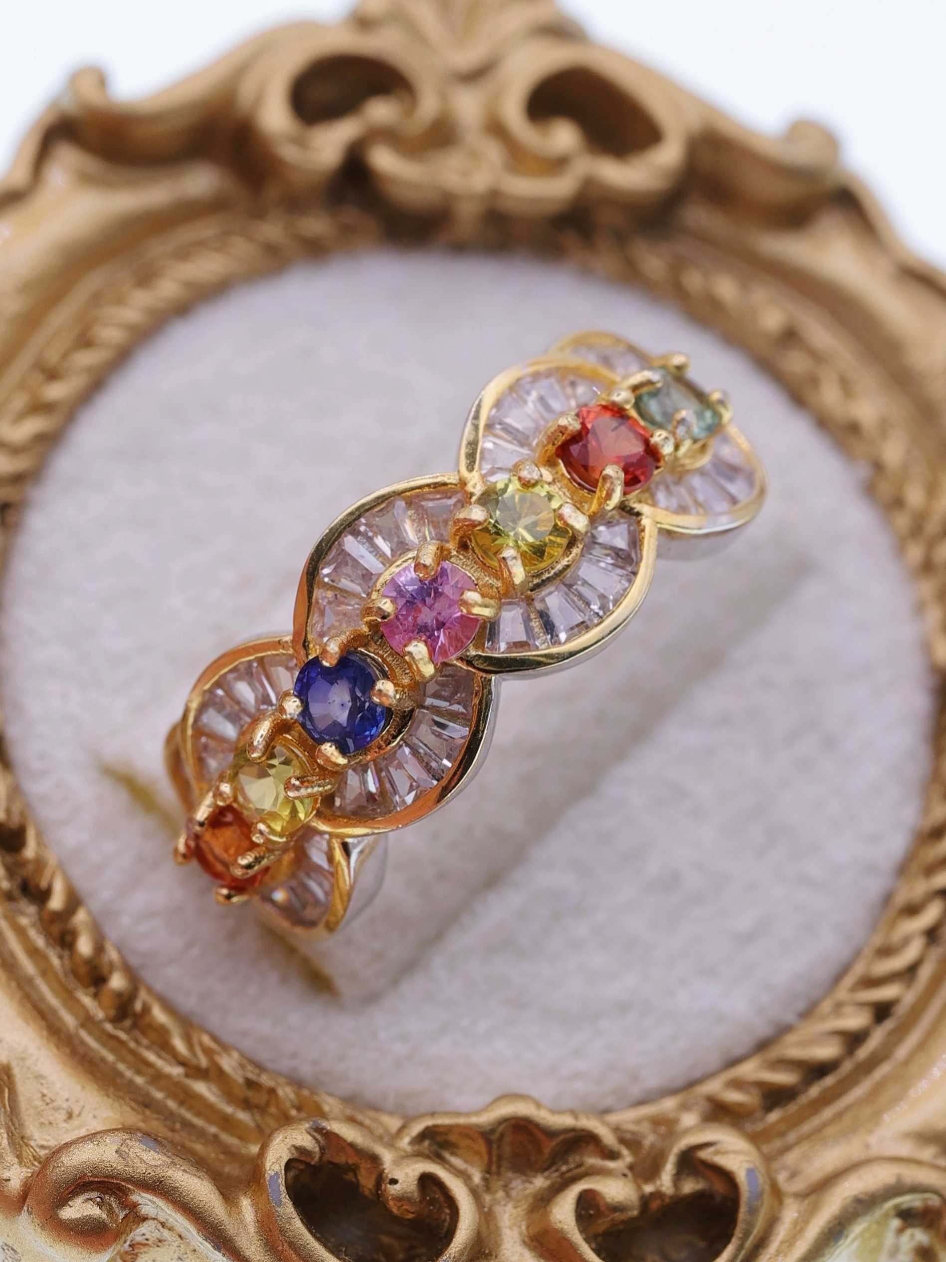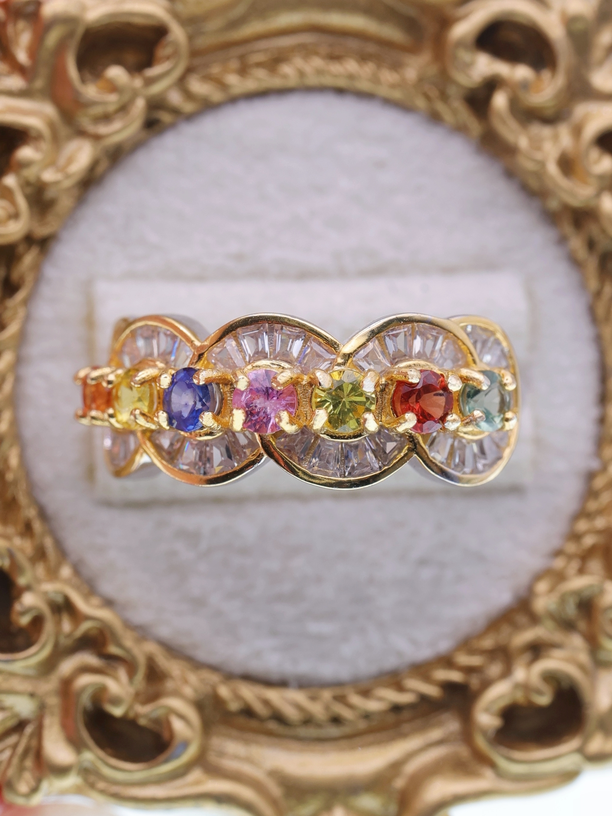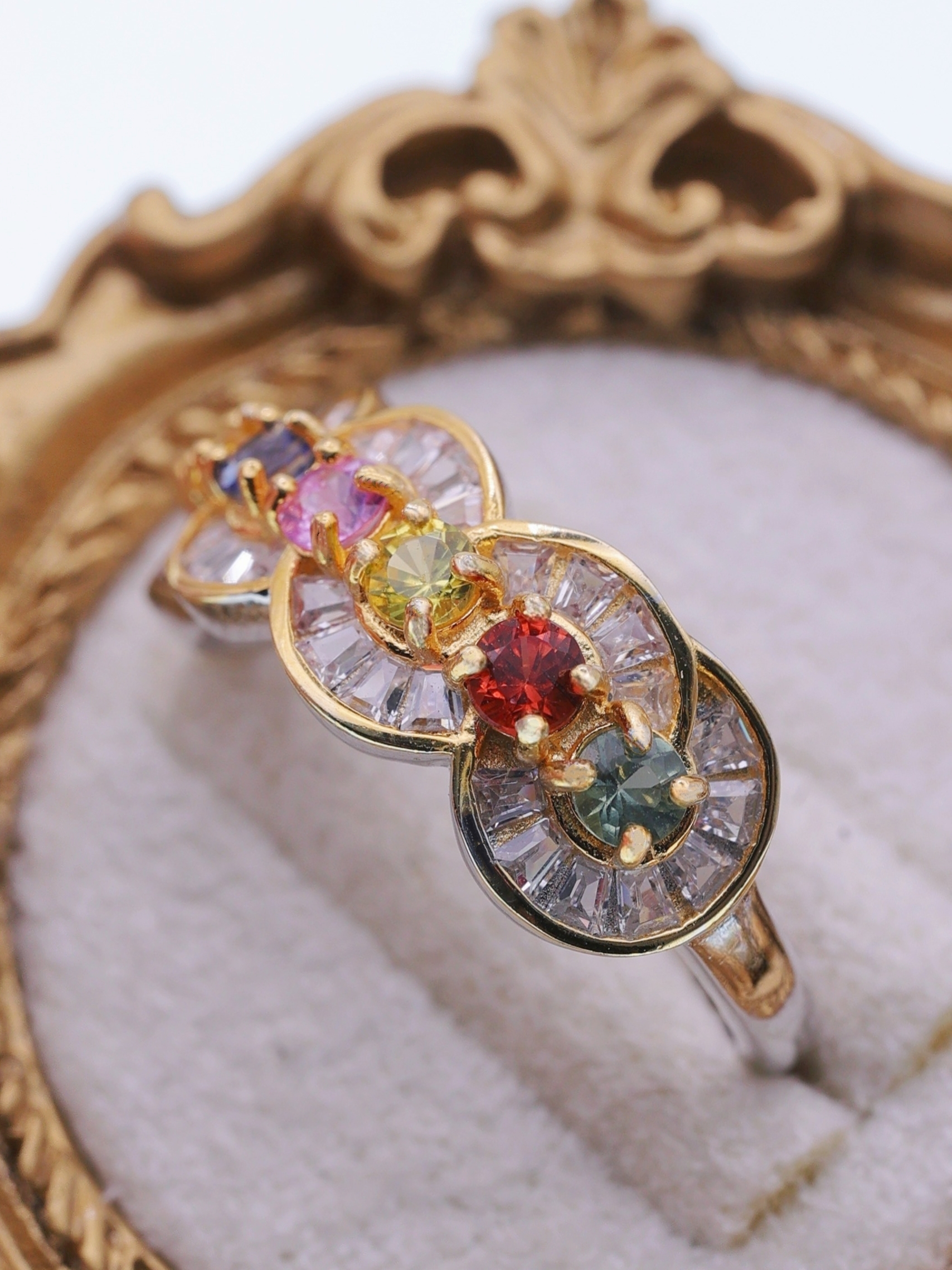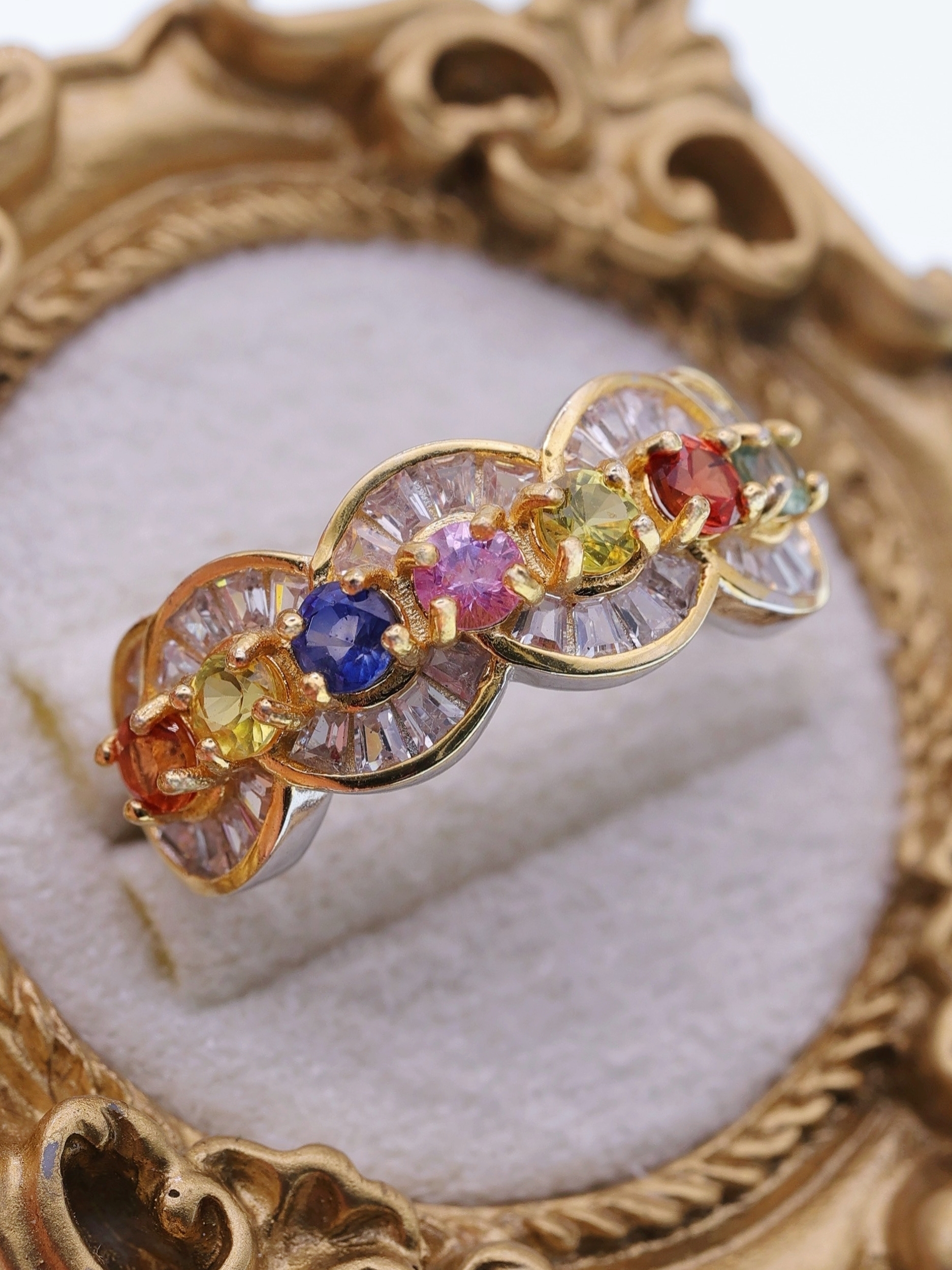 外周を彩る放射状のバゲットカットジルコニアが、プリズムのような光を放ち、指先に虹のような輝きを映し出します。