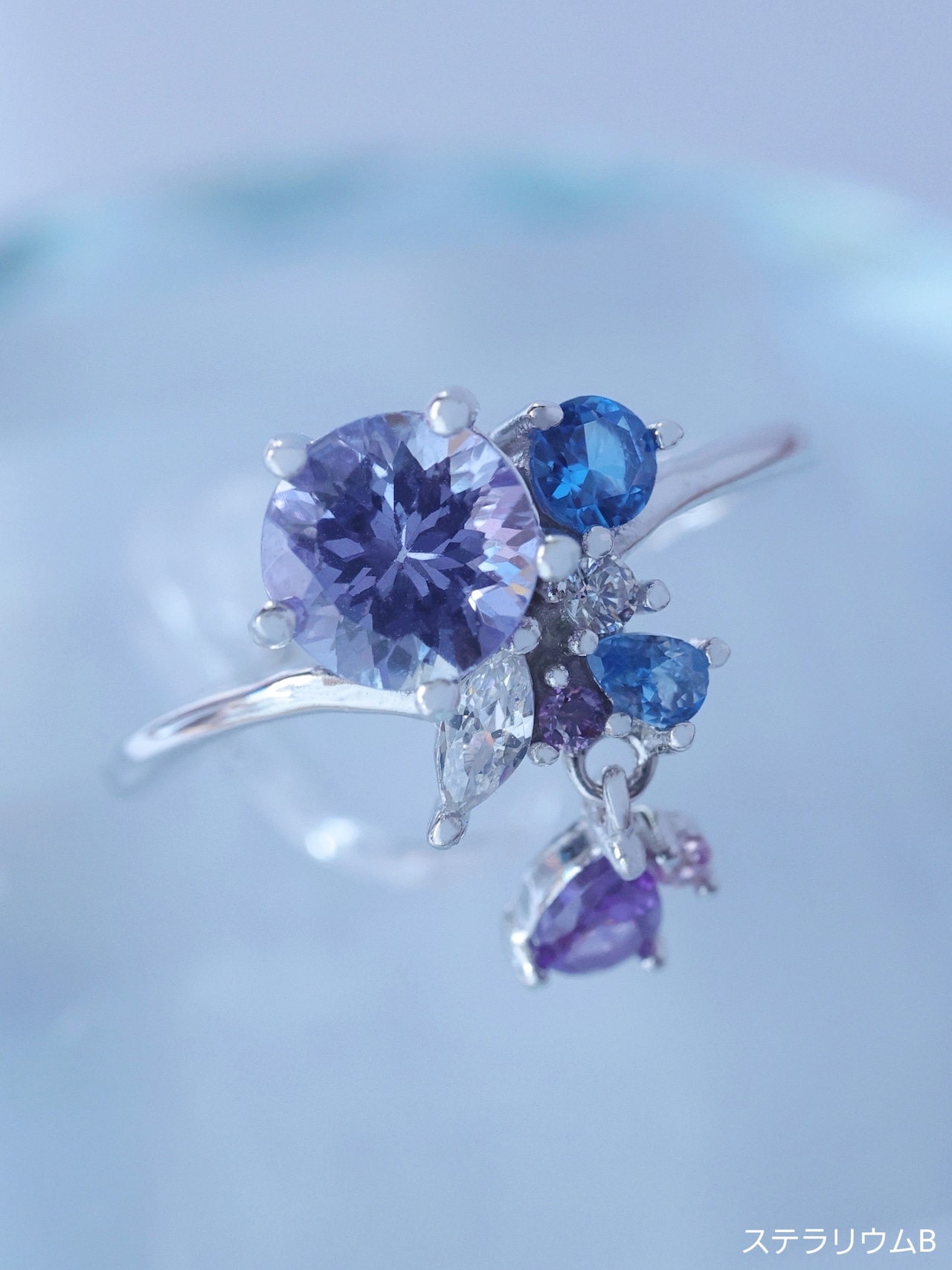 中央には、透明感のあるタンザナイトを贅沢に使用。