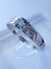 中央のスクエアカットを引き立てるように、両脇にはきらめくメレストーンを配置。さらにアーム部分には北斗七星の星座モチーフを刻み込みました。夜空を象るようなラインは、シンプルでありながらも神秘的な存在感を放ち、ユニセックスに楽しめるモダンなデザインに仕上がっています。