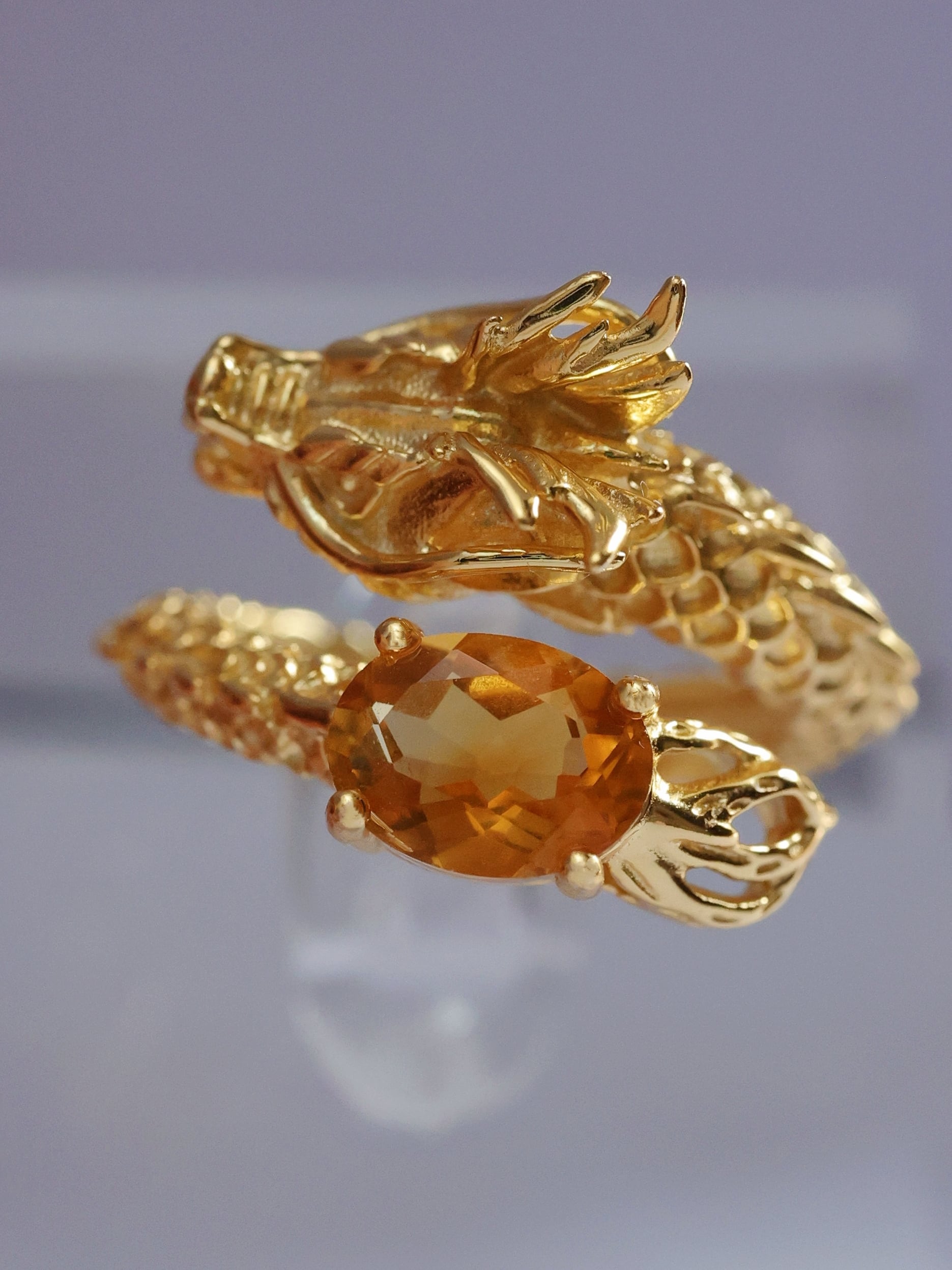 中央には、黄金のように輝くシトリンがセッティングされています。この宝石は、温かみのある色合いと光が織り成す美しさで、まるで龍が宝物を守るかのような印象を与え、幸福と繁栄の象徴として際立たせています。