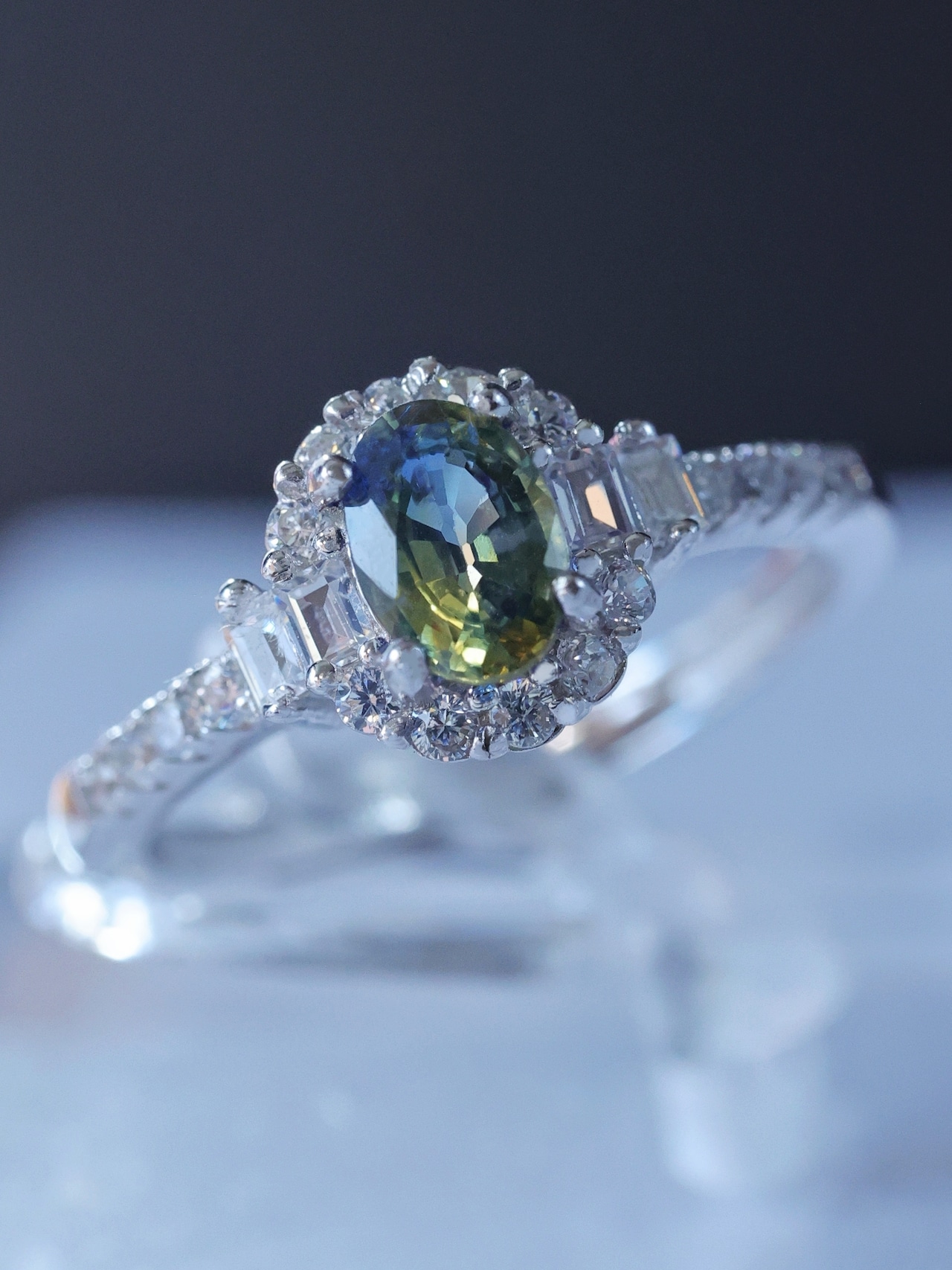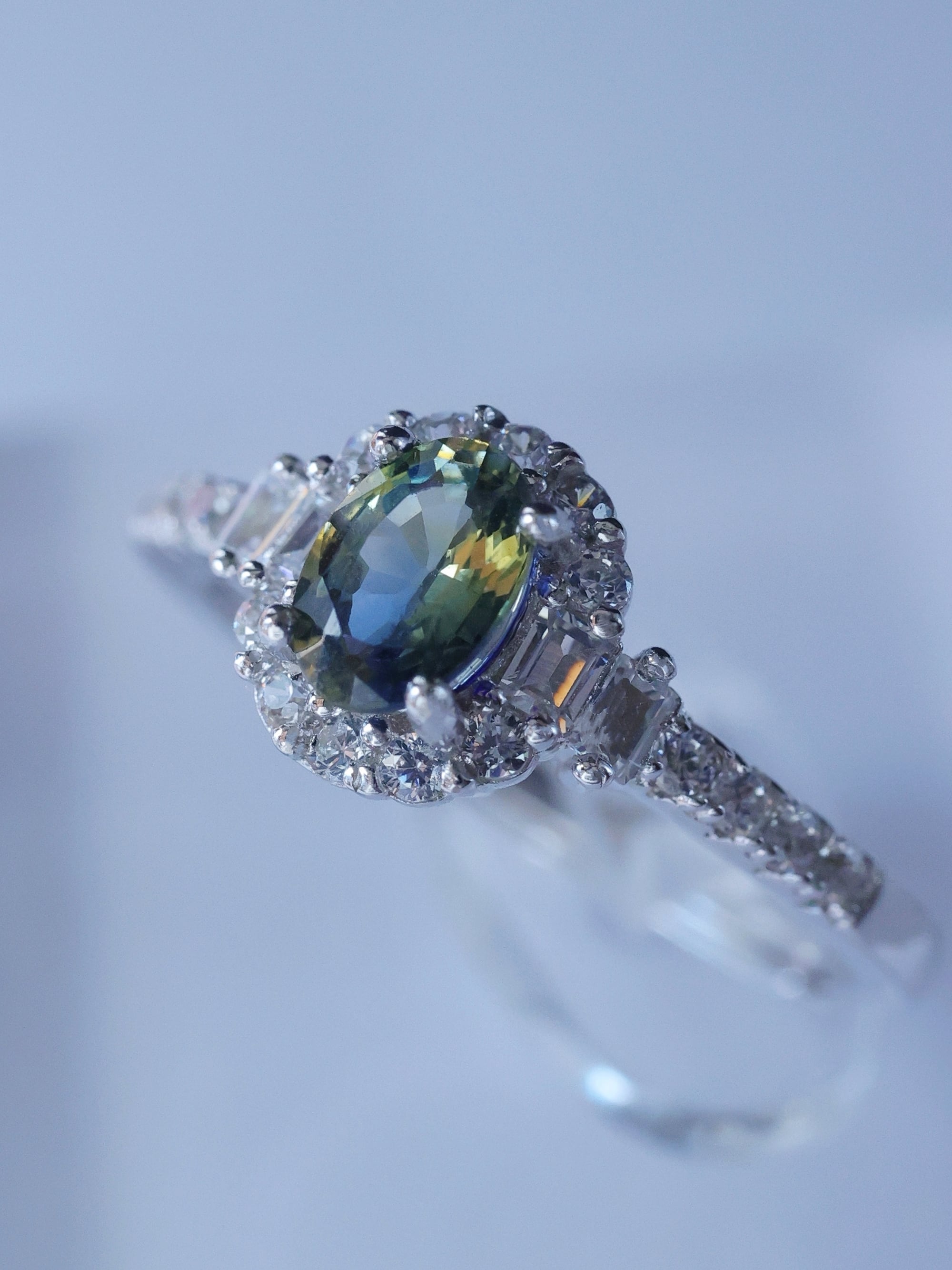 中心に据えたのは、深いブルーとやわらかなイエローグリーンが溶け合う天然パーティーカラーサファイア。