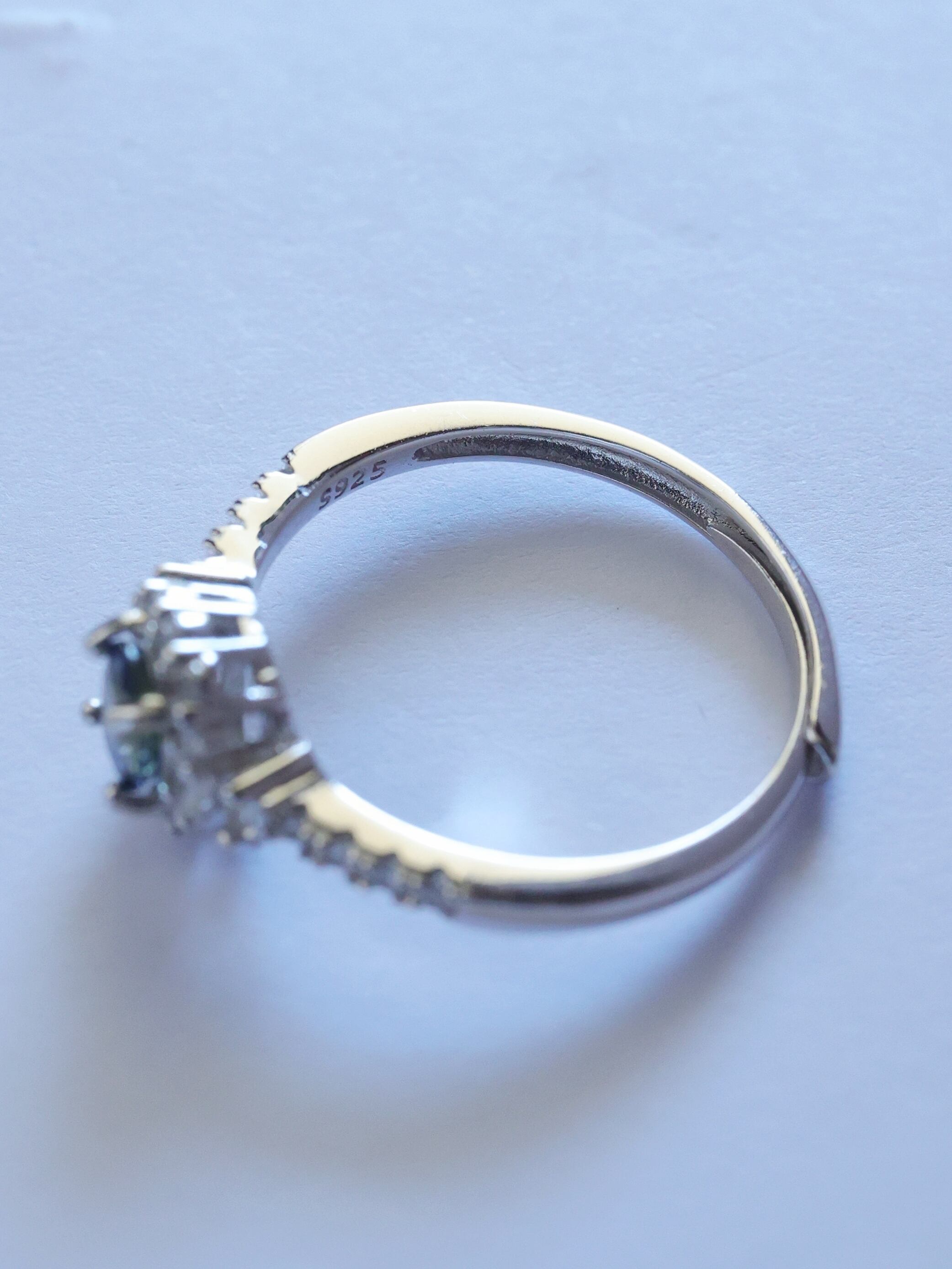 リングの地金は、Silver925にロジウムコーティングを施し、透明感のあるサファイアの輝きを引き立てるプラチナカラー仕立てに。