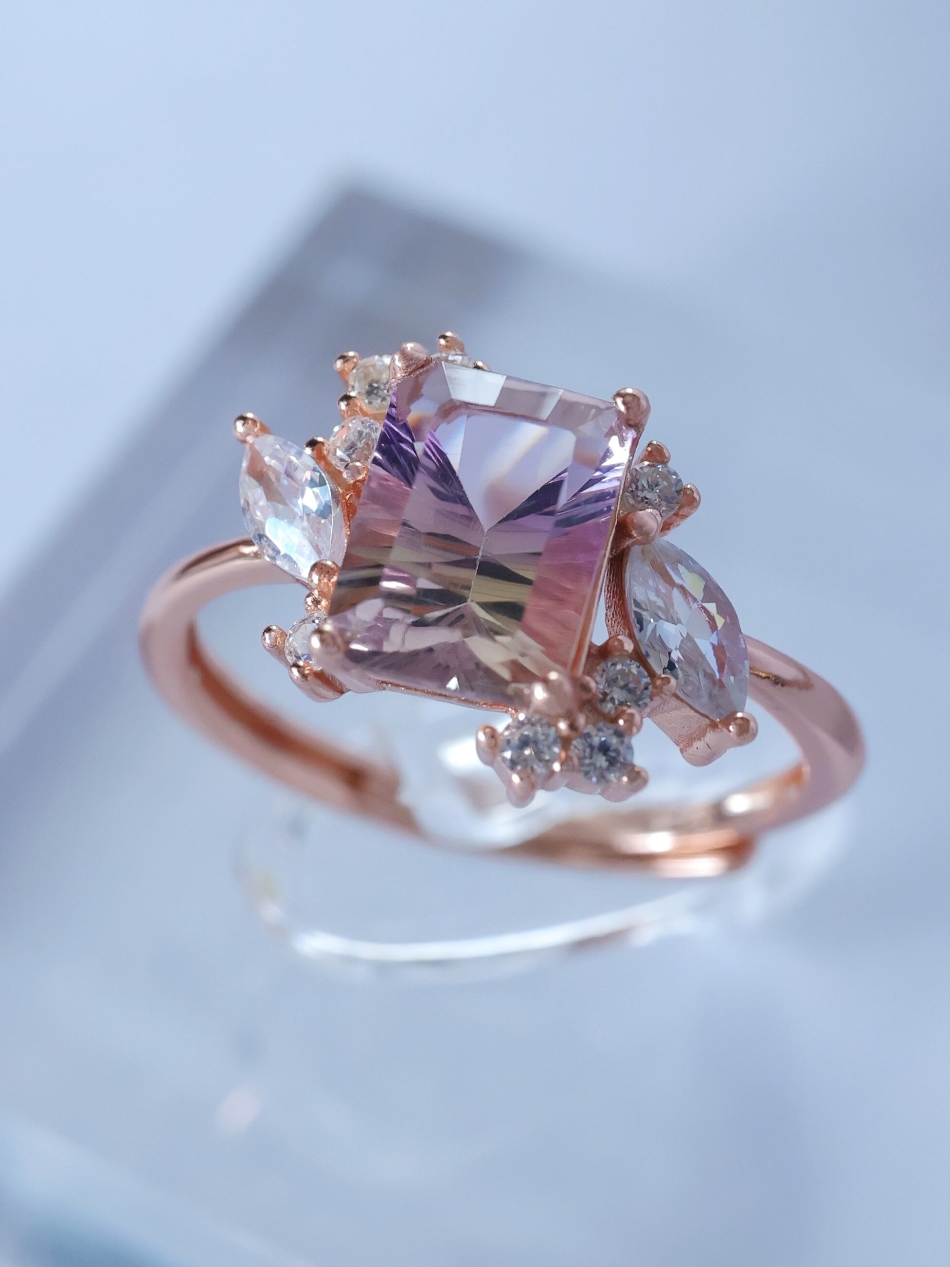 センターストーンを囲むように、マーキスカットとラウンドカットのジルコニアを配置。花々が咲き誇るようなデザインが、アメトリンの独特な色彩をさらに引き立てています。