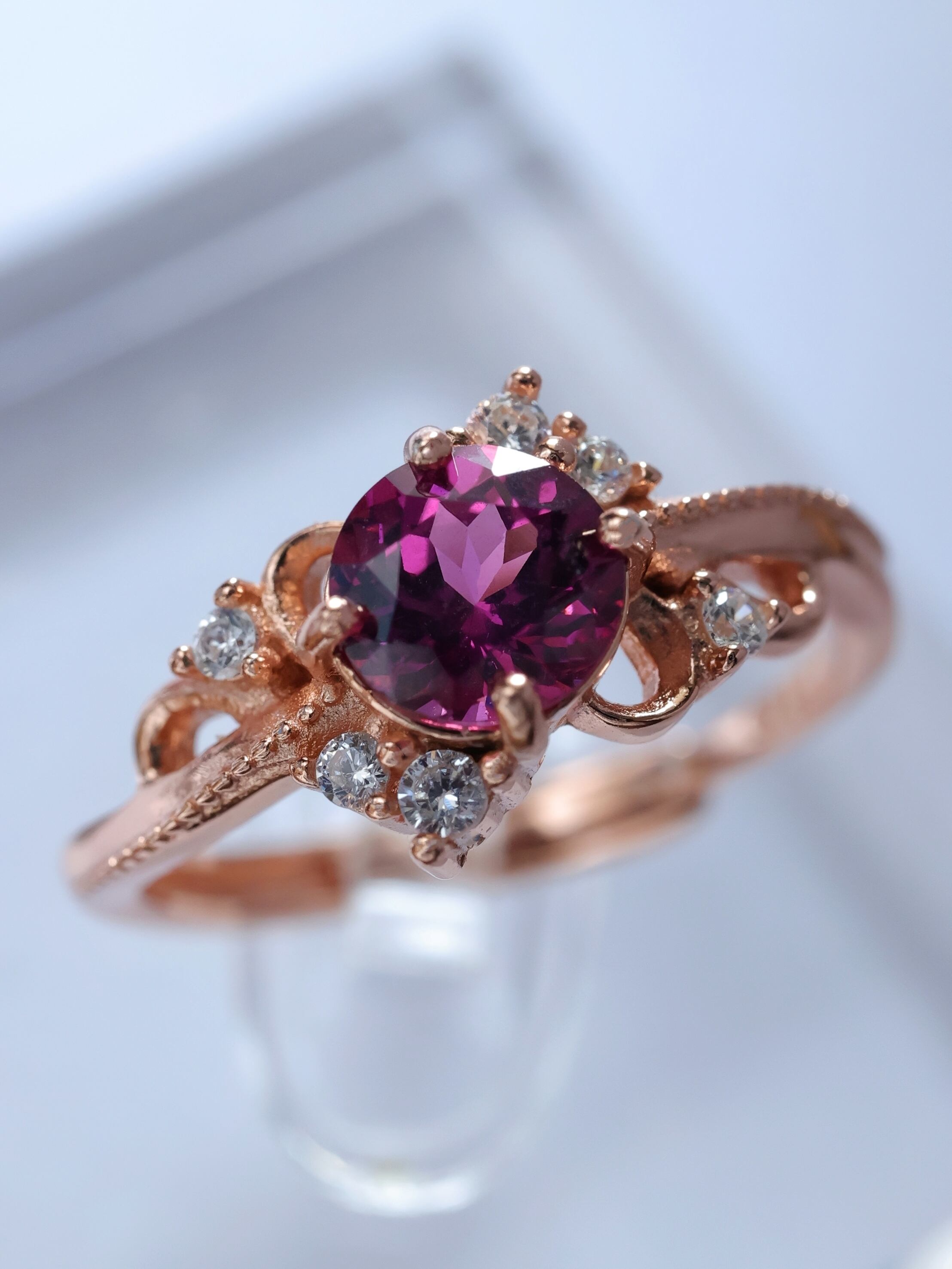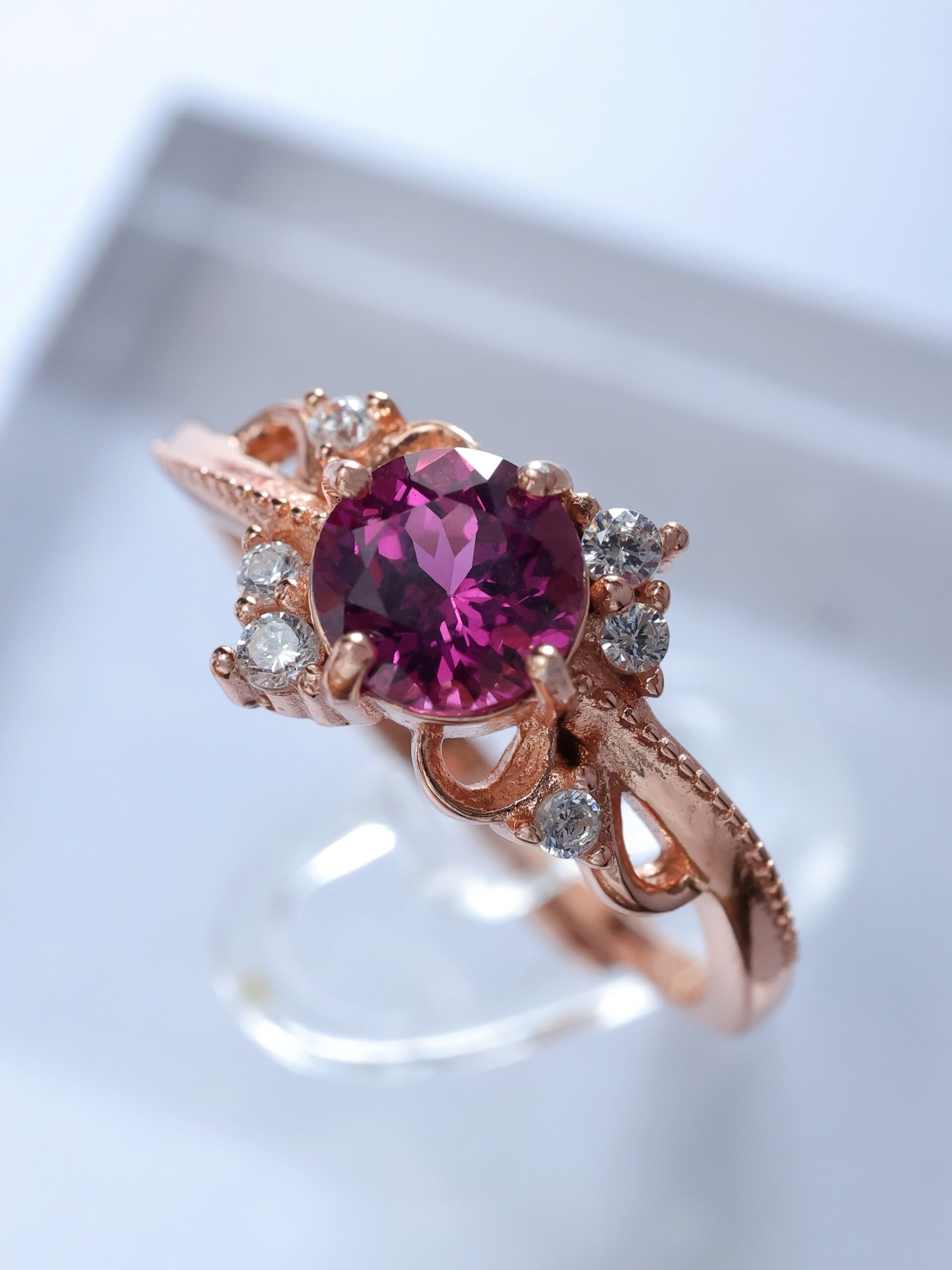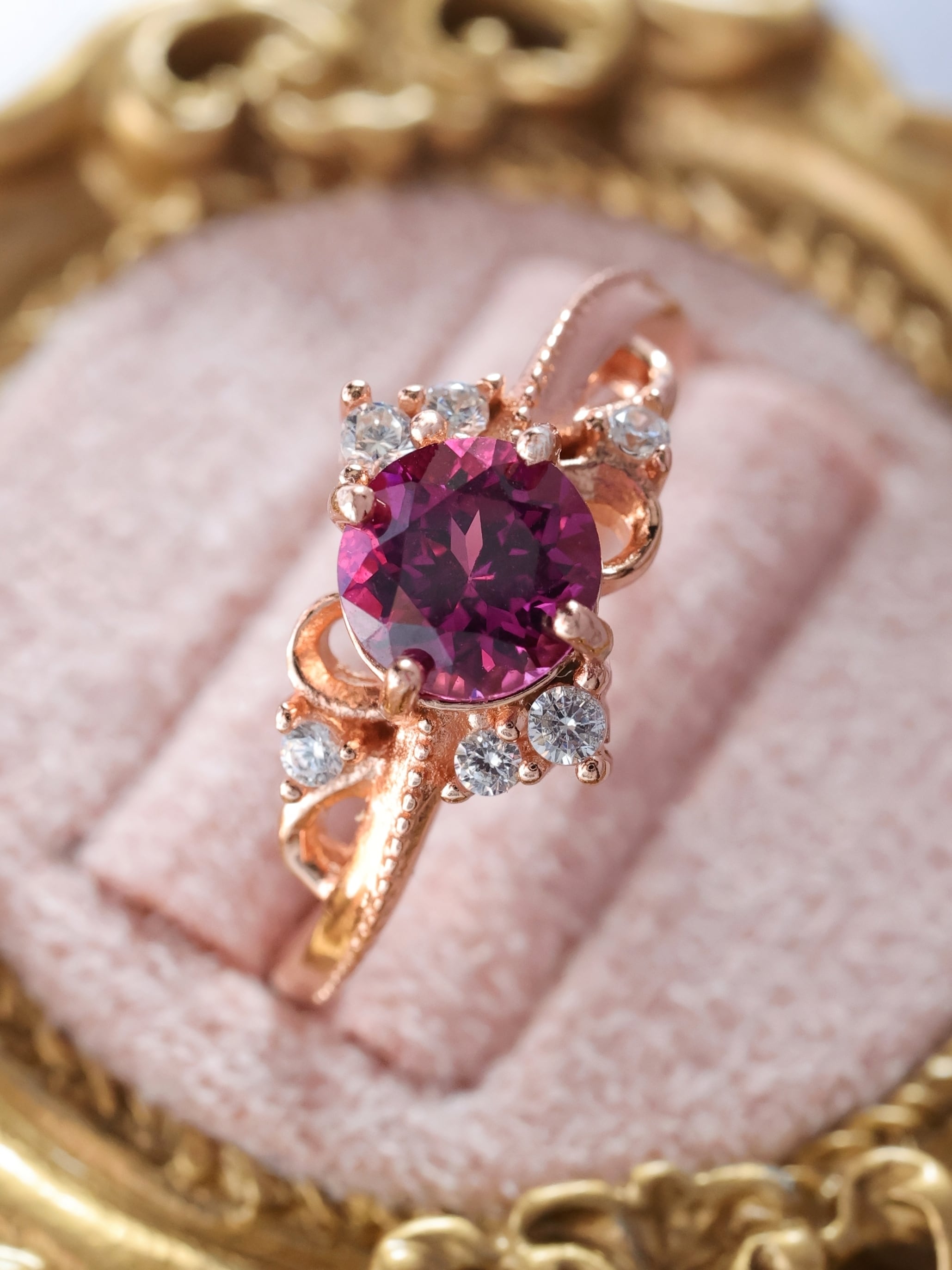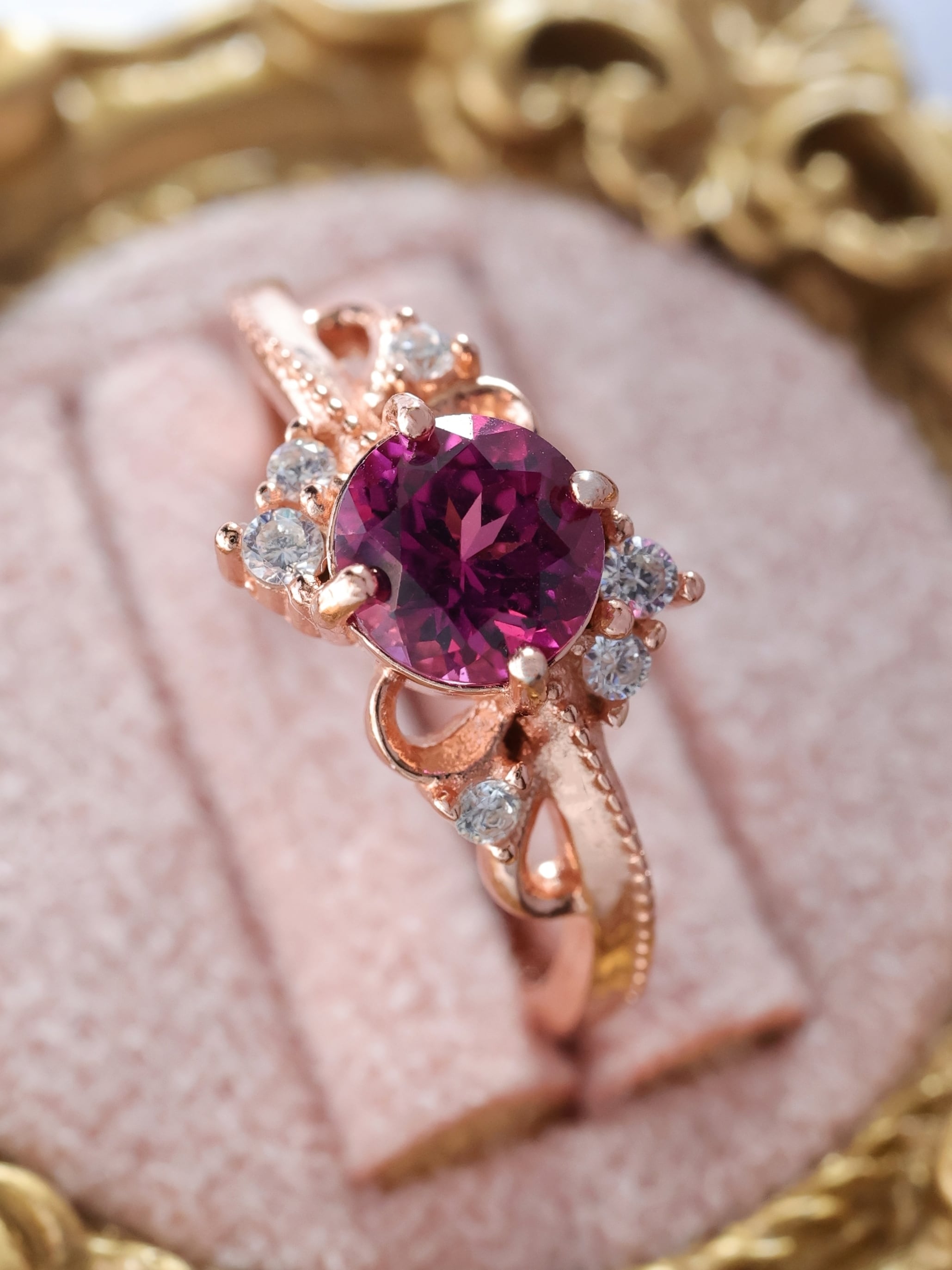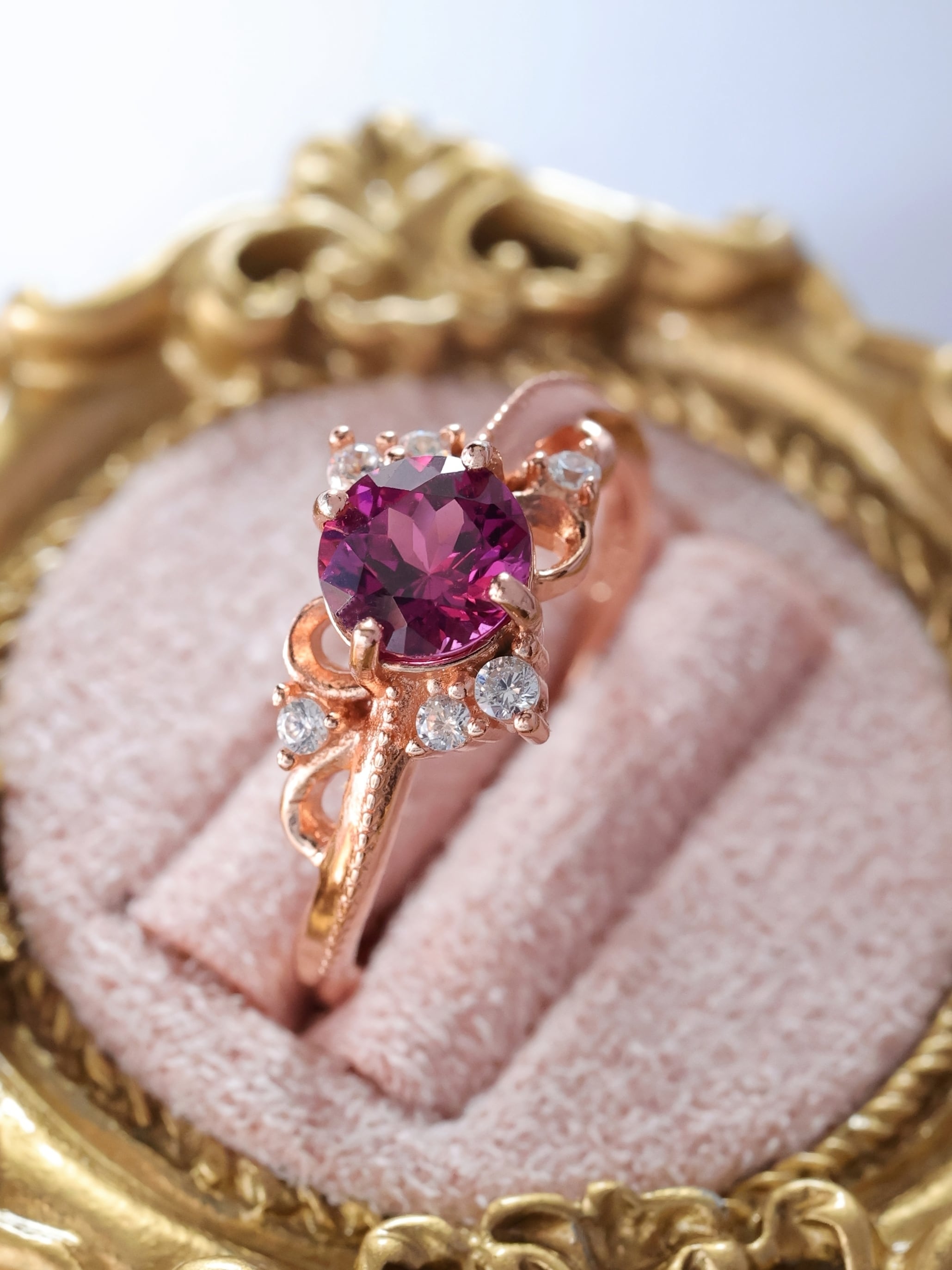 センターストーンは透明度が高く、みずみずしい輝きが魅力のラウンドカット。周囲にはジルコニアを配し、星々がきらめく夜空のような煌めきを添えました。地金はSilver925にK18ピンクゴールド仕上げを施し、宝石の赤紫を柔らかく包み込んでいます。
