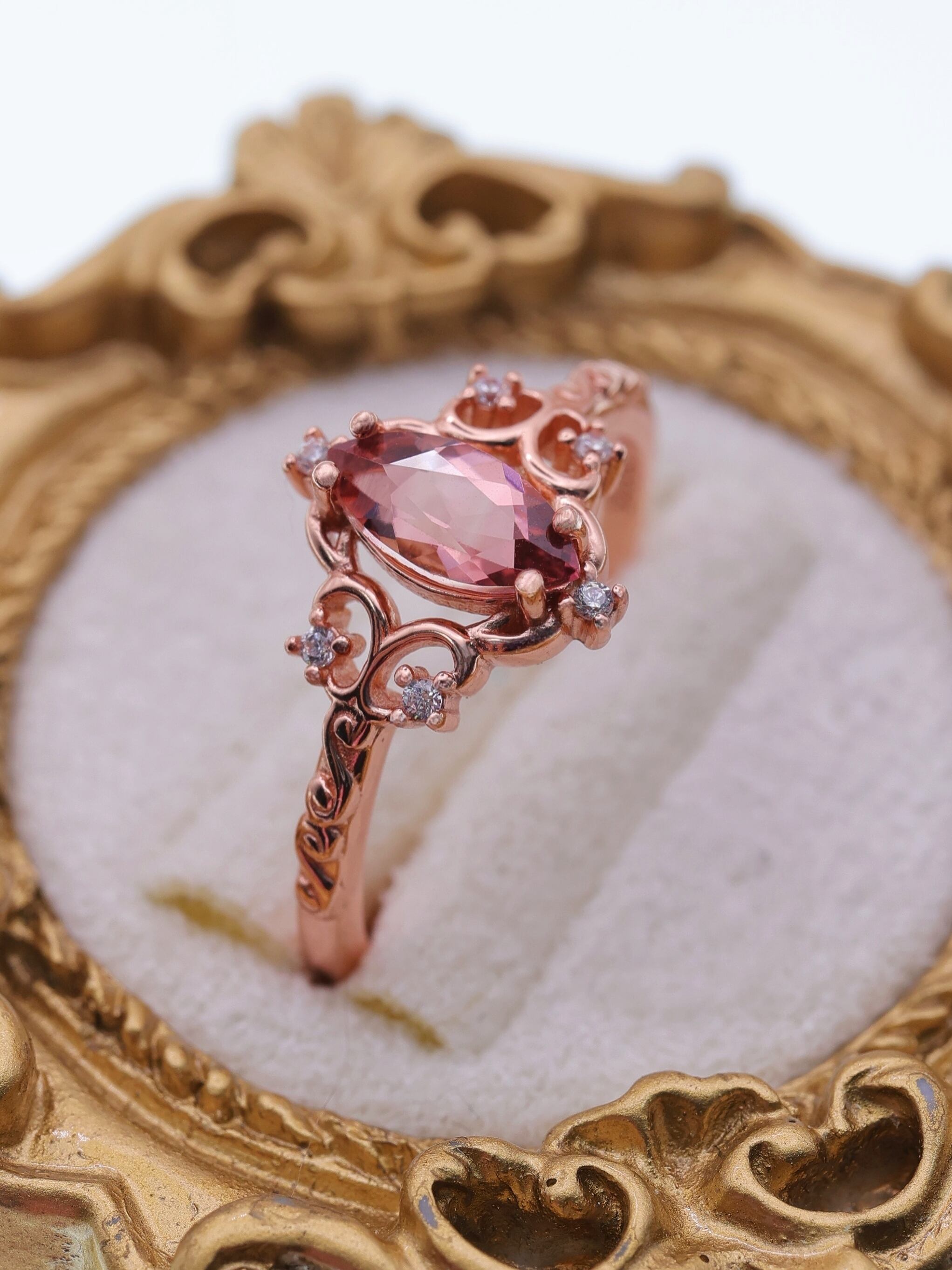 カットはオーバルシェイプ。端正なラインがピンクトルマリンの持つ輝きを最大限に引き出し、石の存在感をより一層高めています。周囲には繊細なメレストーンを添え、リング全体に華やぎをプラスしました。