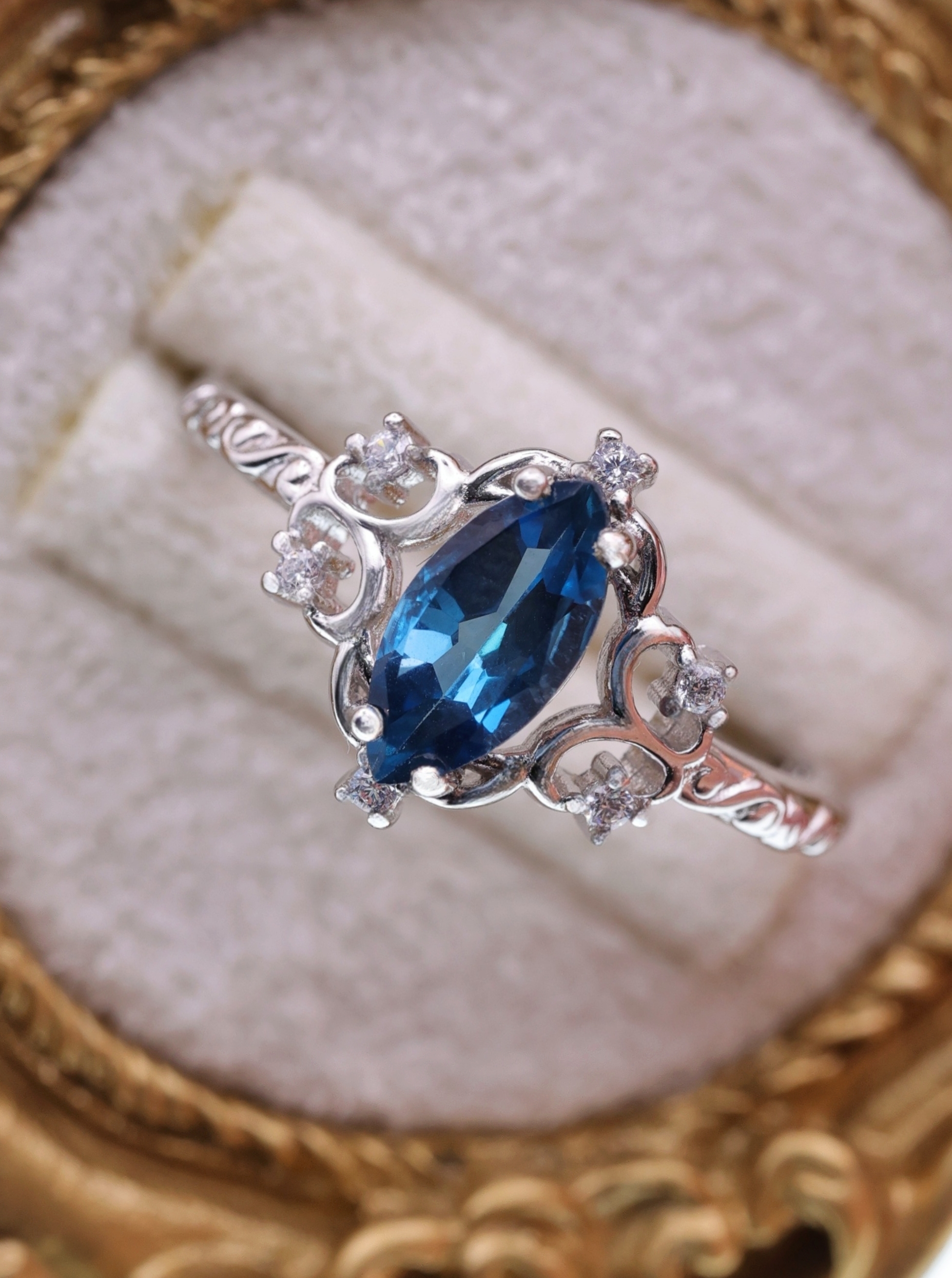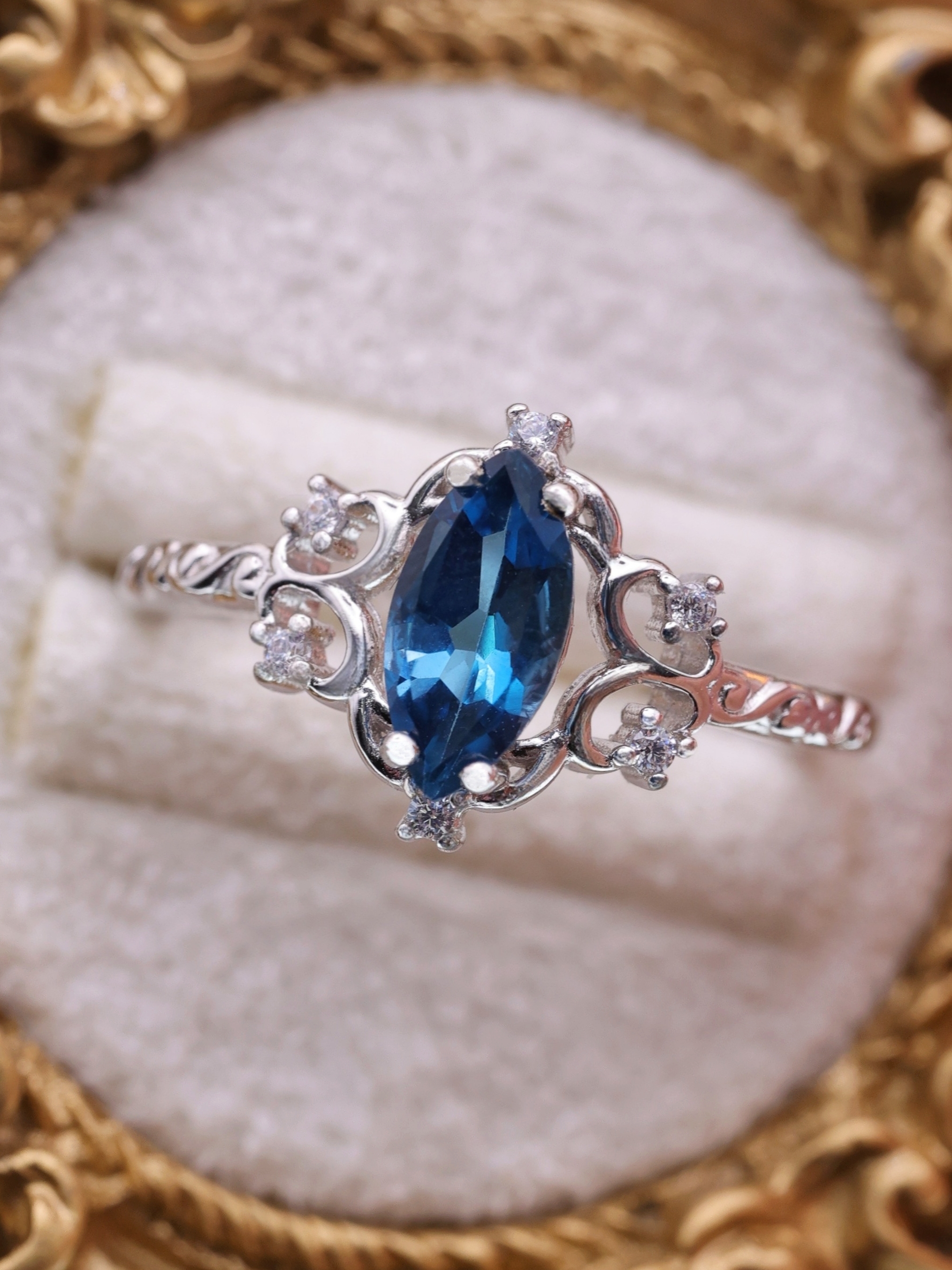 カットはマーキスシェイプ。優雅なラインがロンドンブルートパーズの輝きを最大限に引き立て、周囲には美しいジルコニアが寄り添い、華やかさを加えています。
