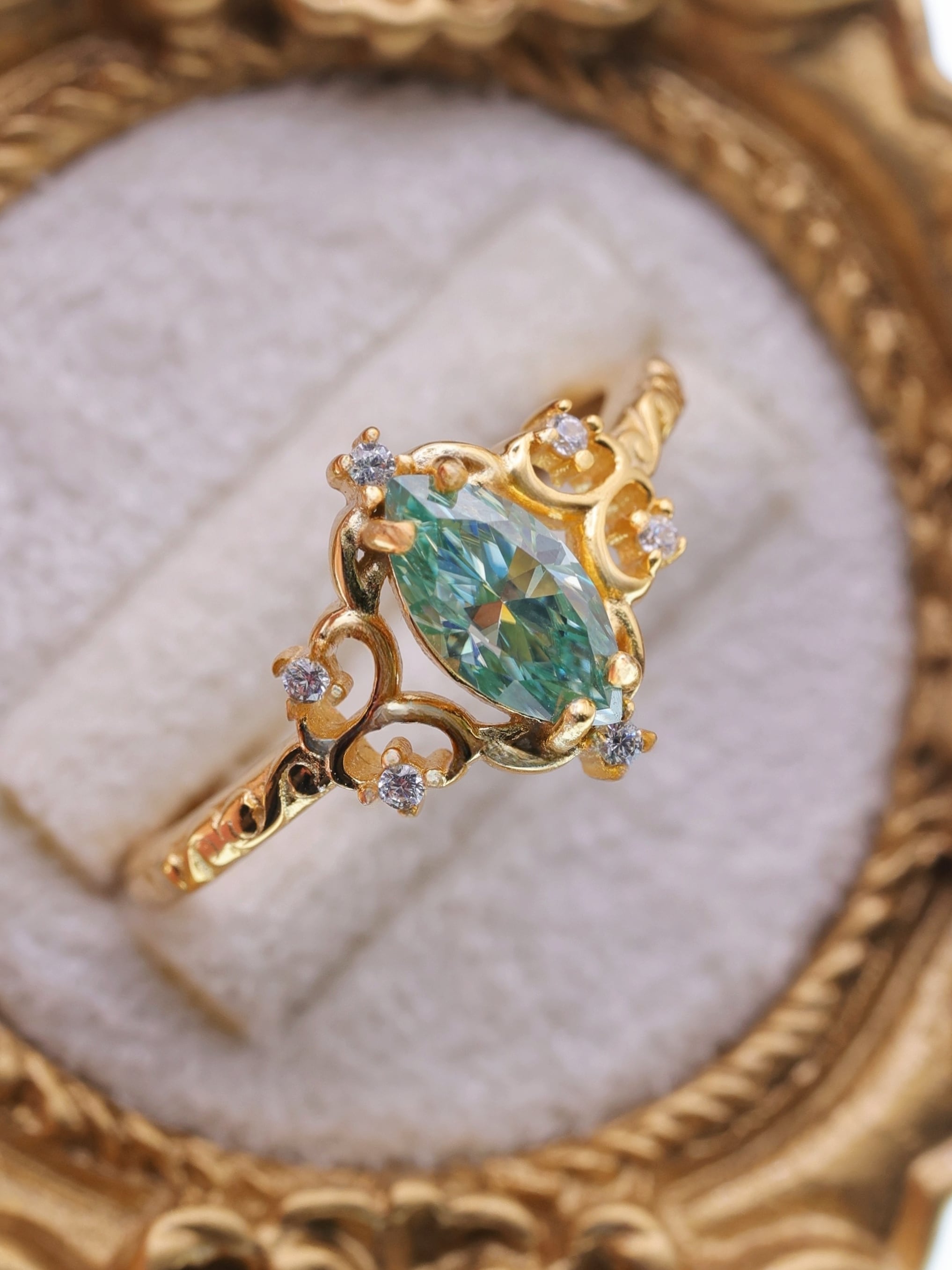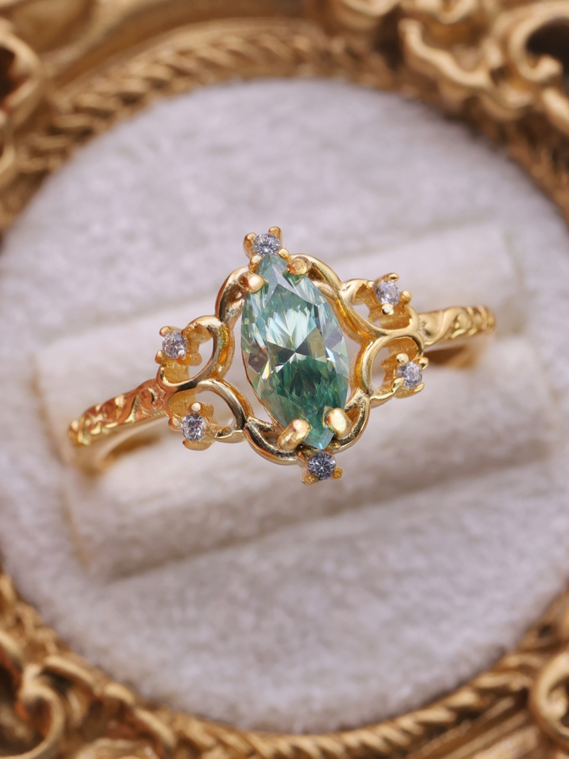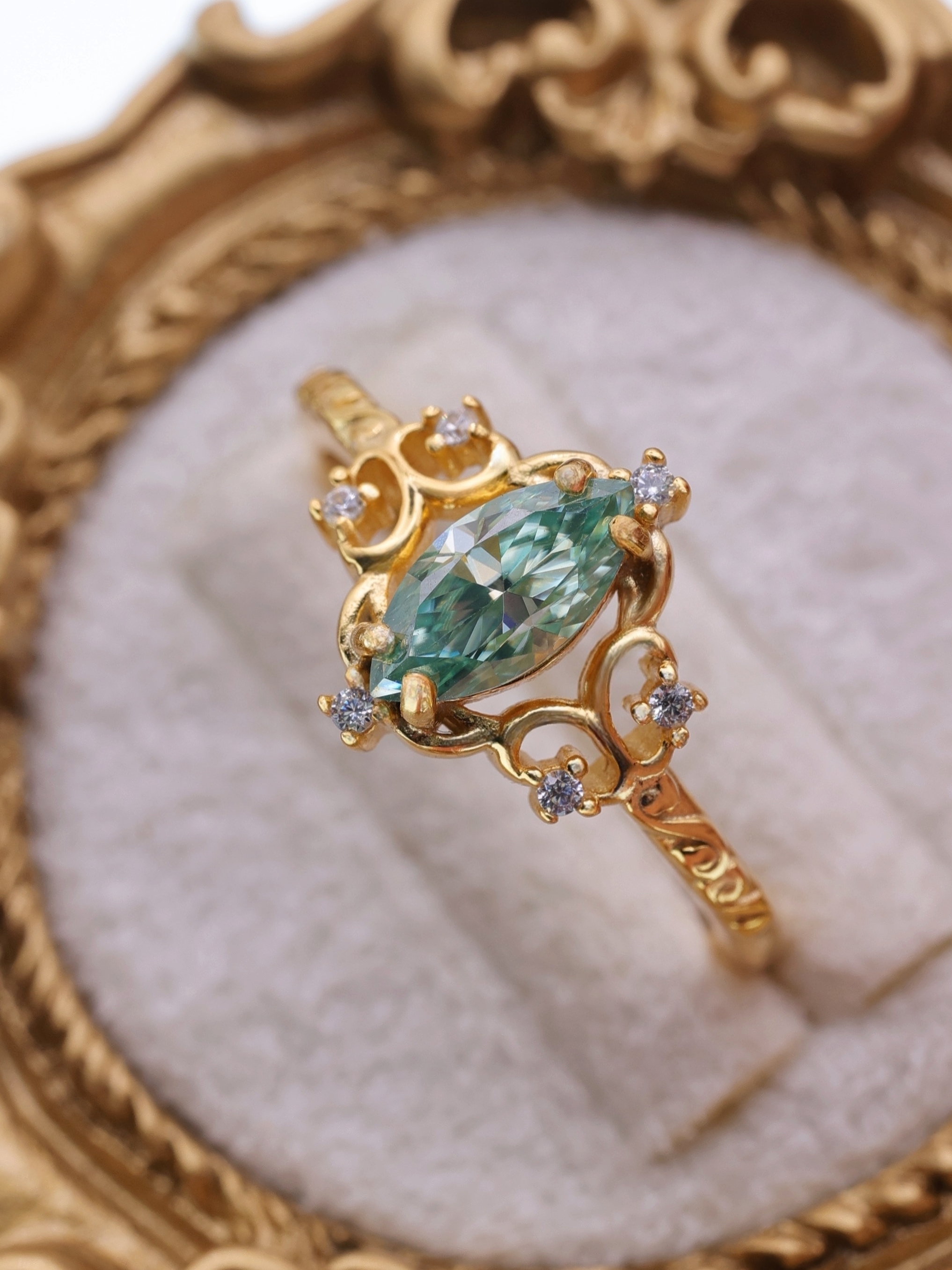 カットはマーキスシェイプ。繊細なカットがモアサナイトの美しさを最大限に引き立て、周囲には美しいジルコニアが華やかさを添えています。