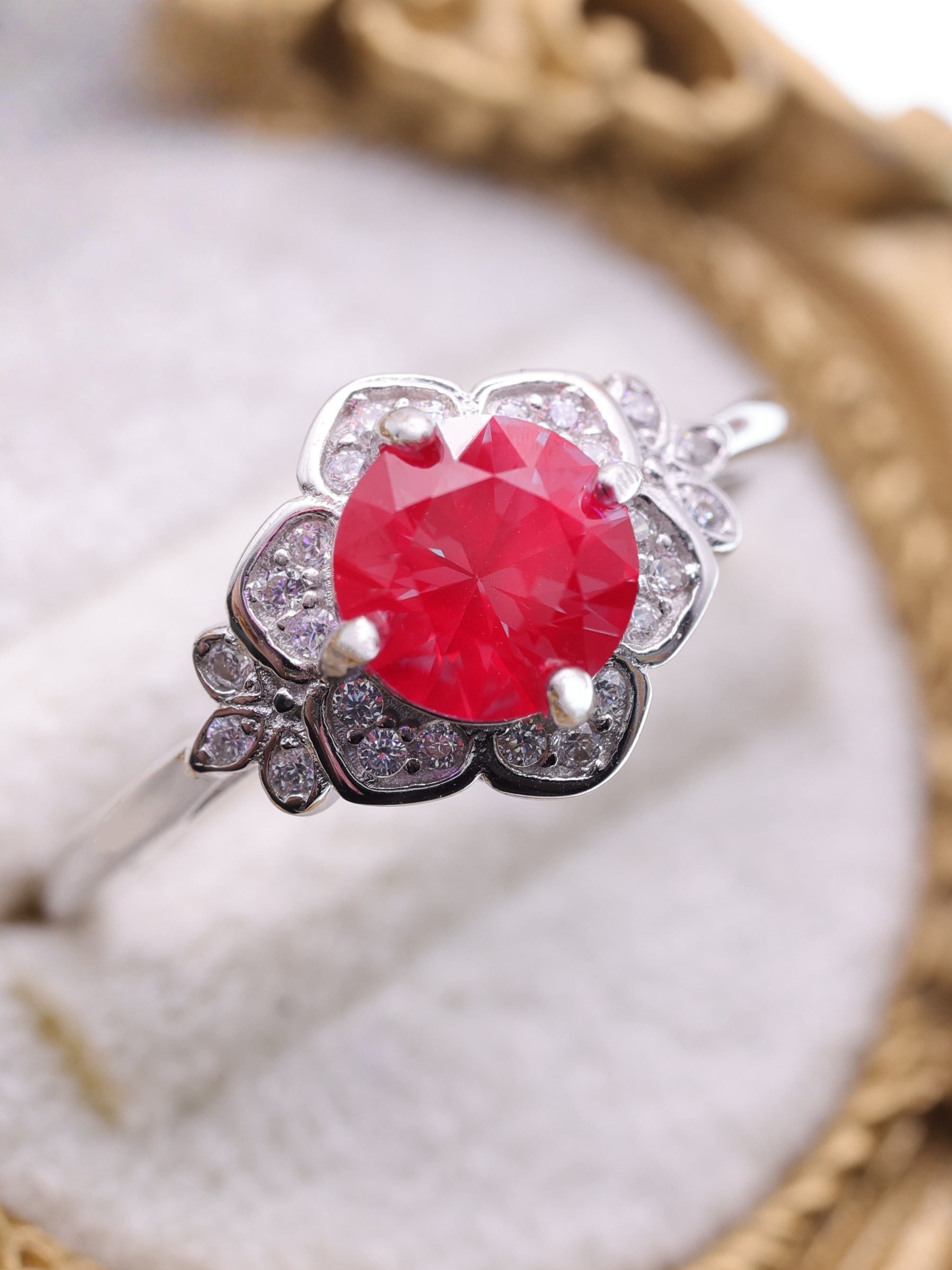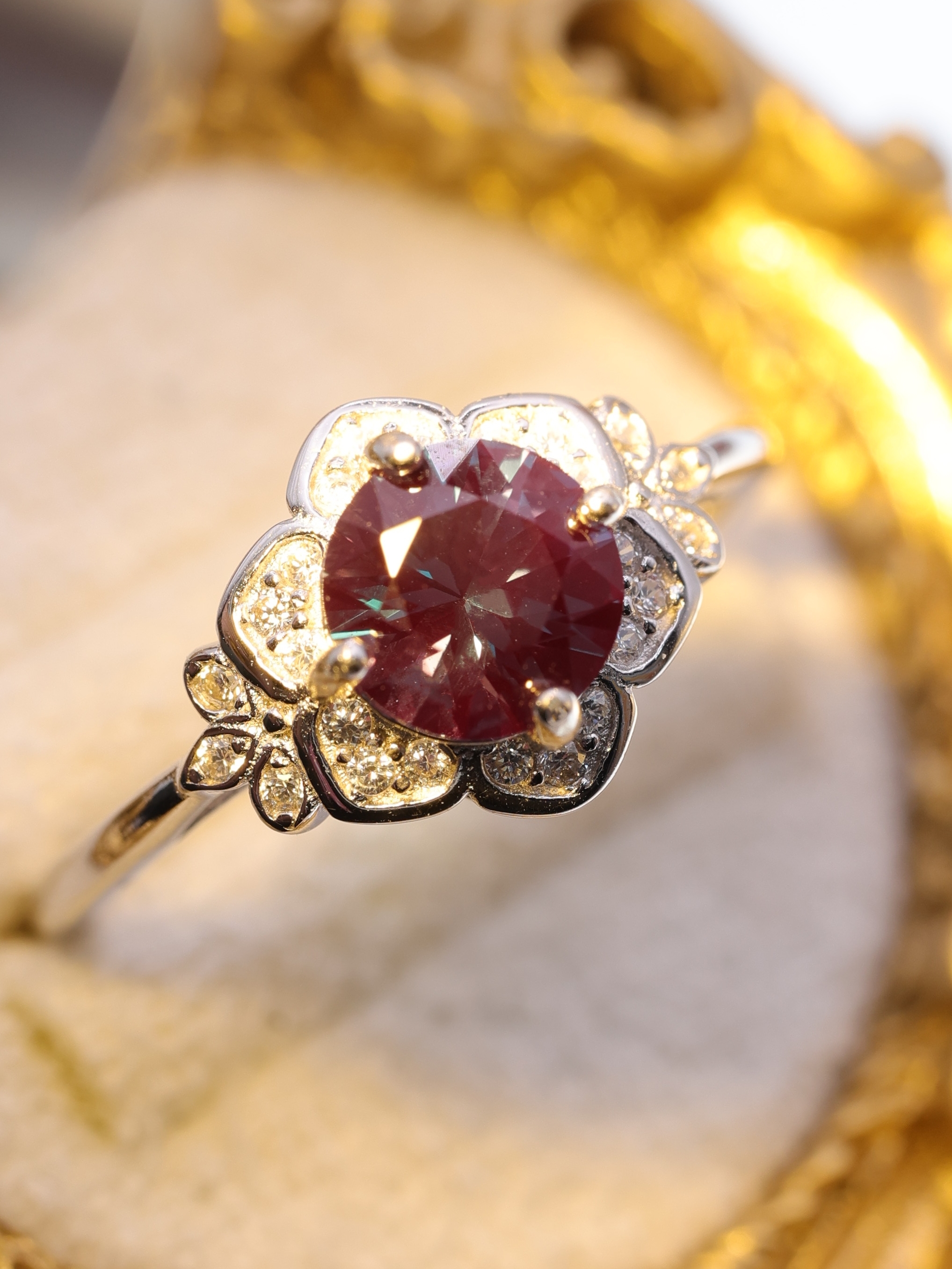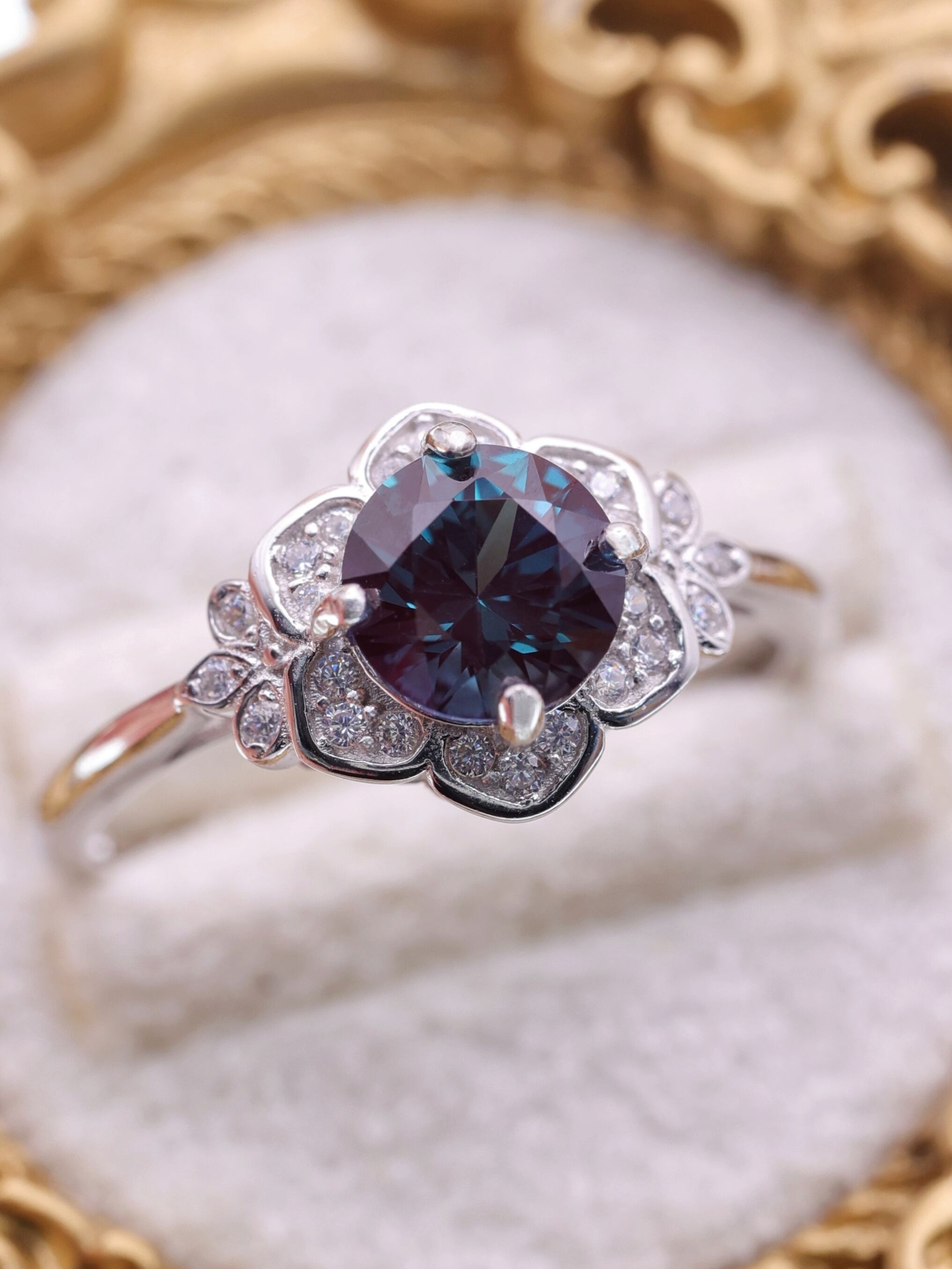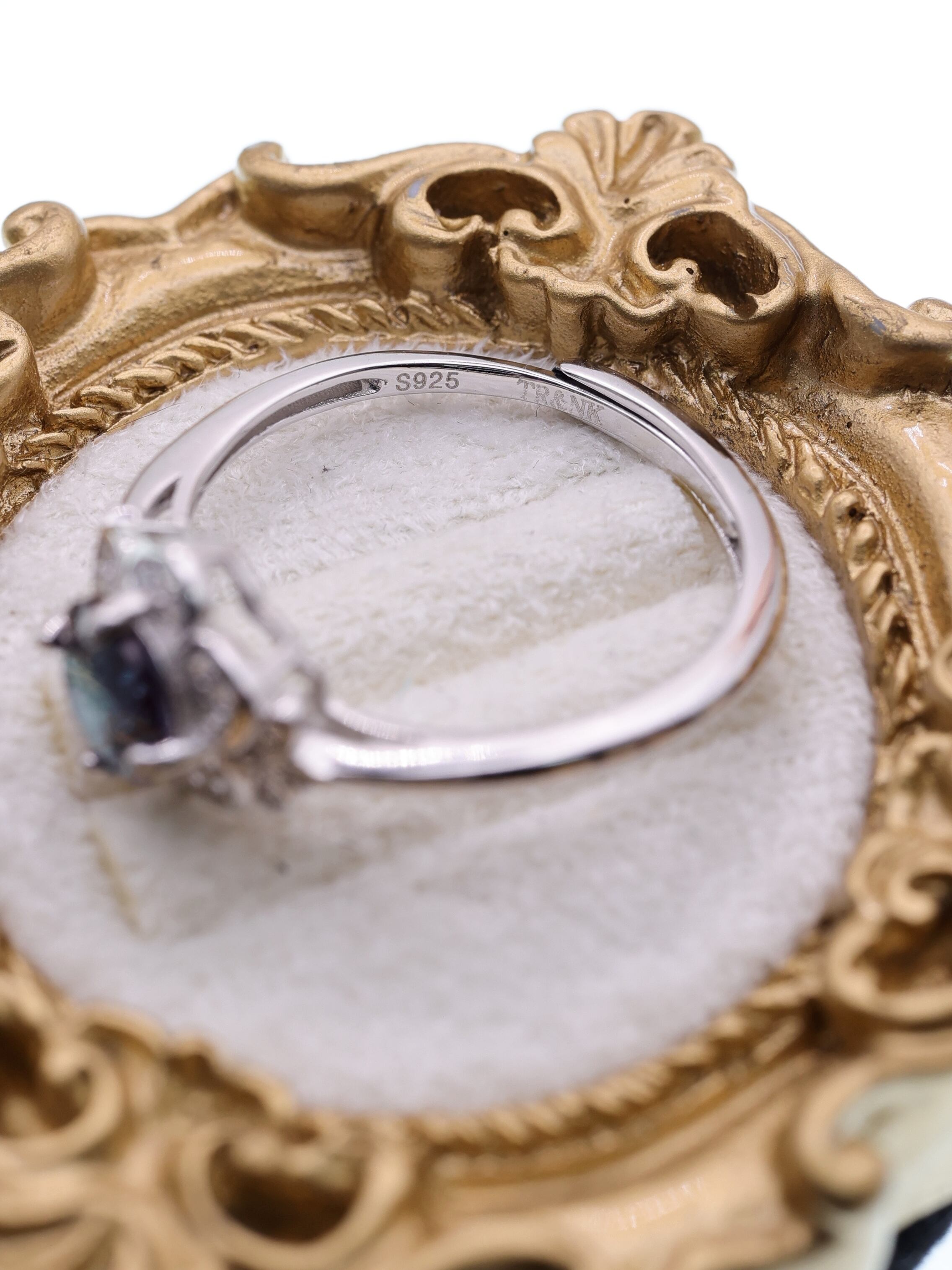 リングの中央にはラボグロウンアレキサンドライトがセットされ、華やかな花びらをイメージしたデザインが周囲を囲みます。シルバー925をベースにロジウムコーティングを施し、さらに7Aランクのジルコニアをアクセントとしてあしらうことで、気品あふれる仕上がりになっています。花のように優雅なフォルムは、着ける人の指先をまるで光の輪で包み込むかのようです。