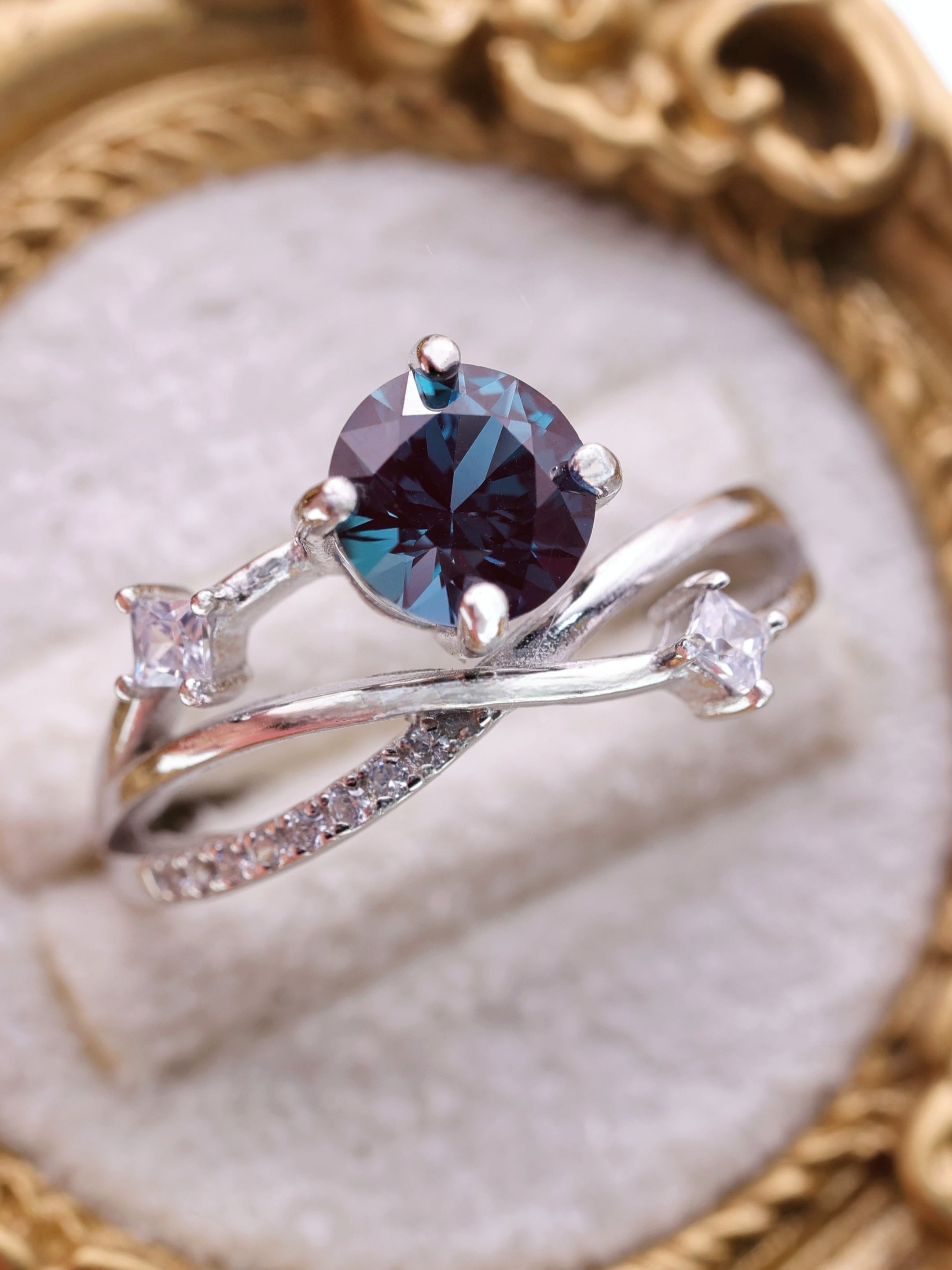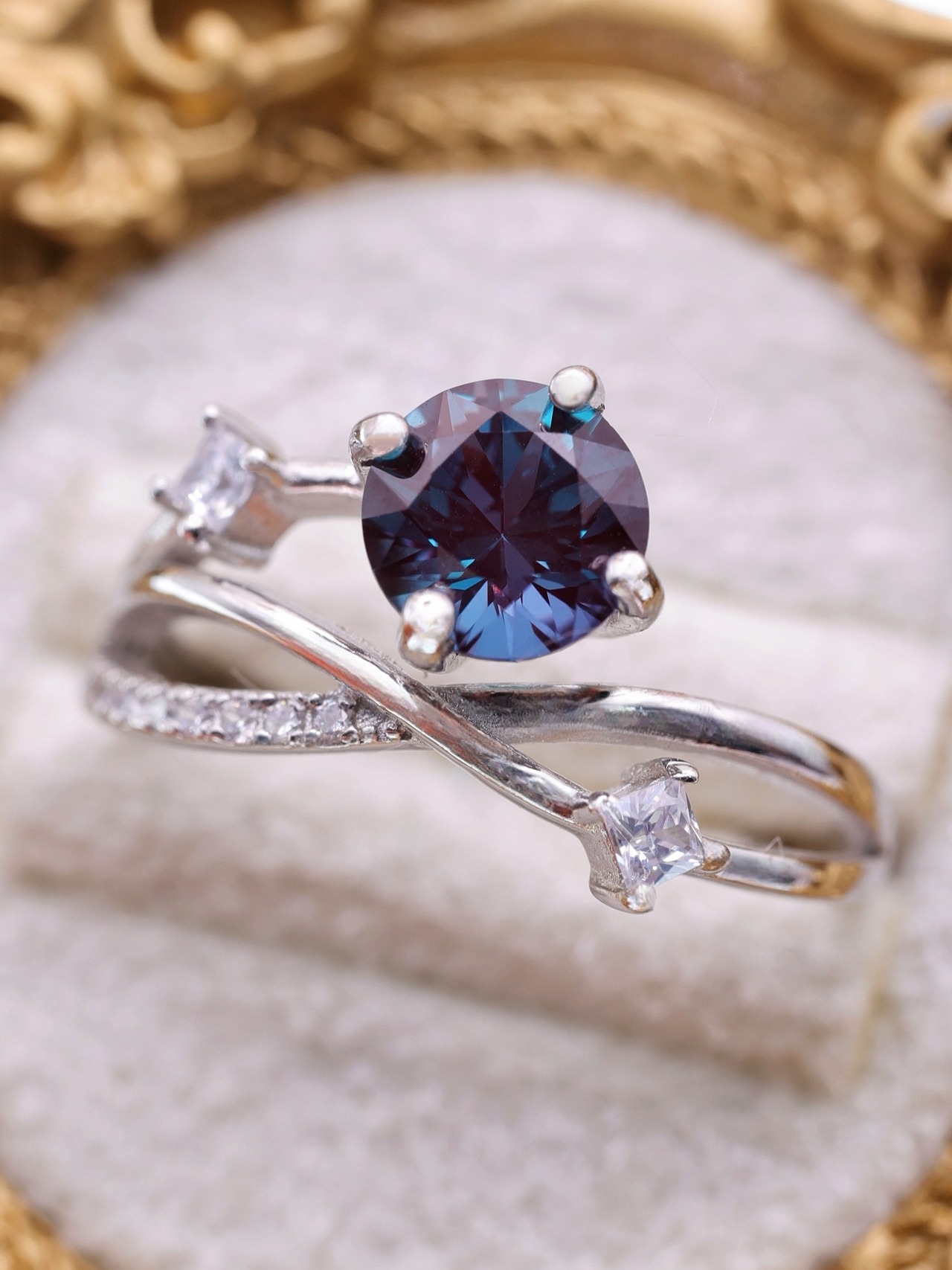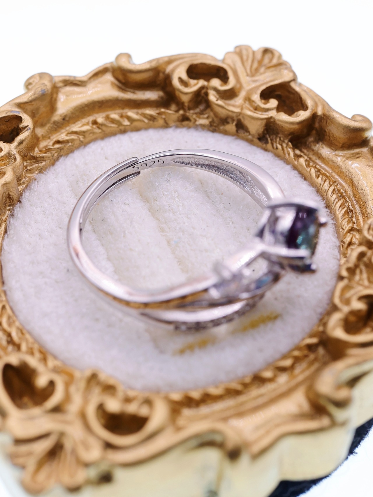 地金にはSilver925にロジウムコーティングを施し、アレキサンドライト(ラボグロウン)の深遠な色をより一層引き立てています。