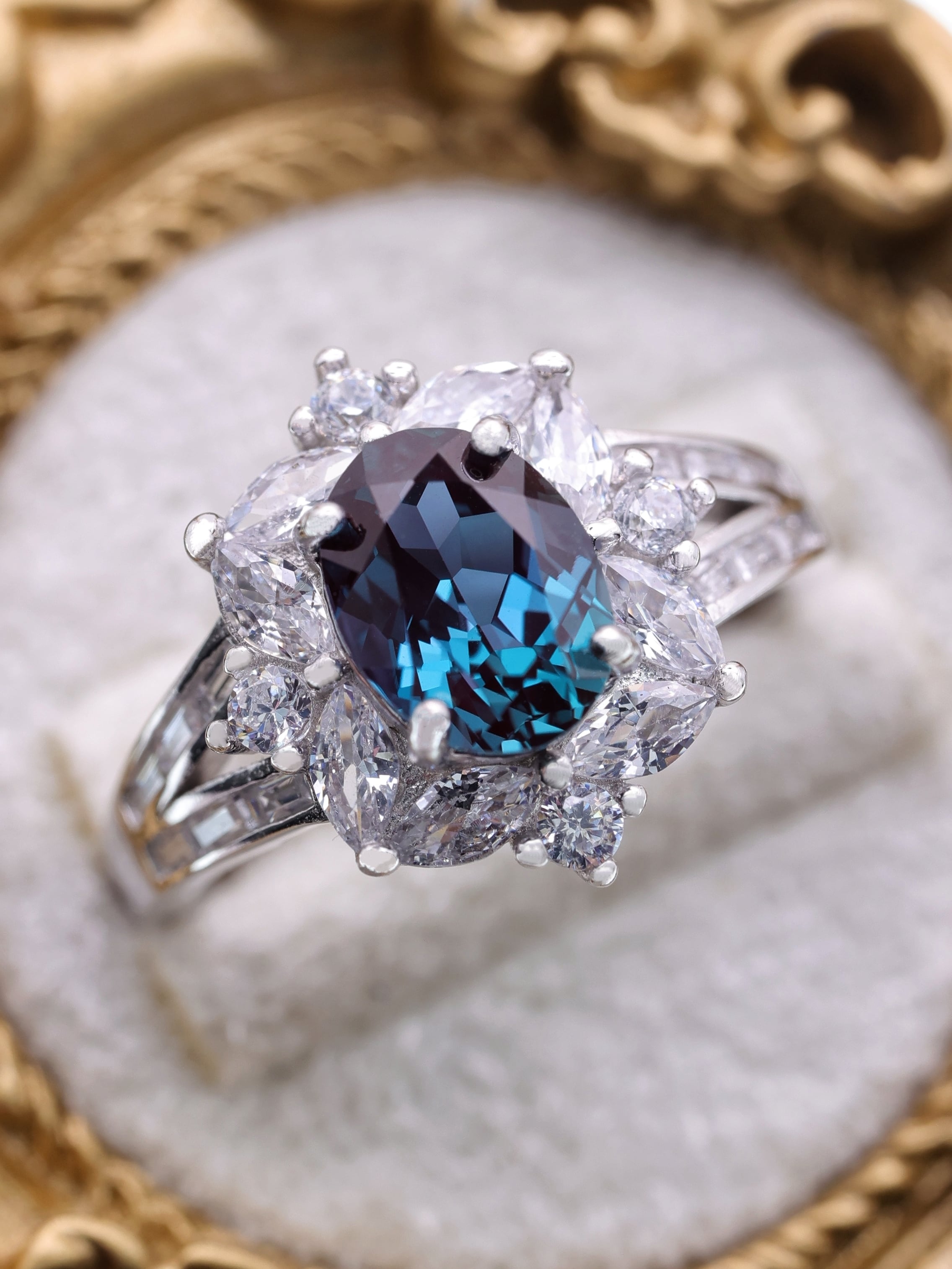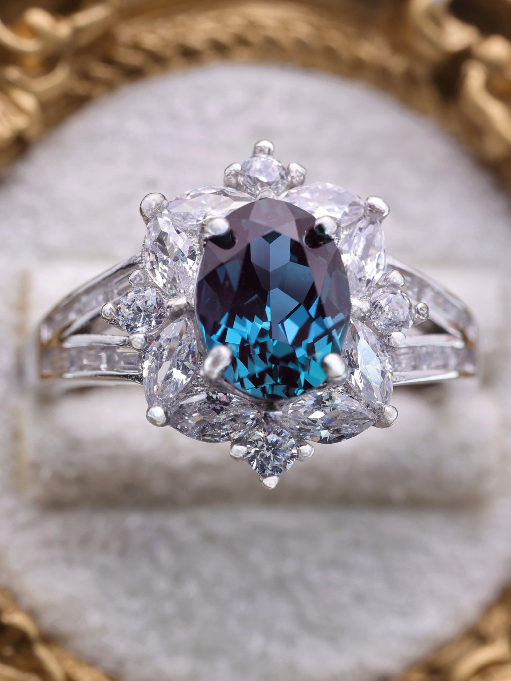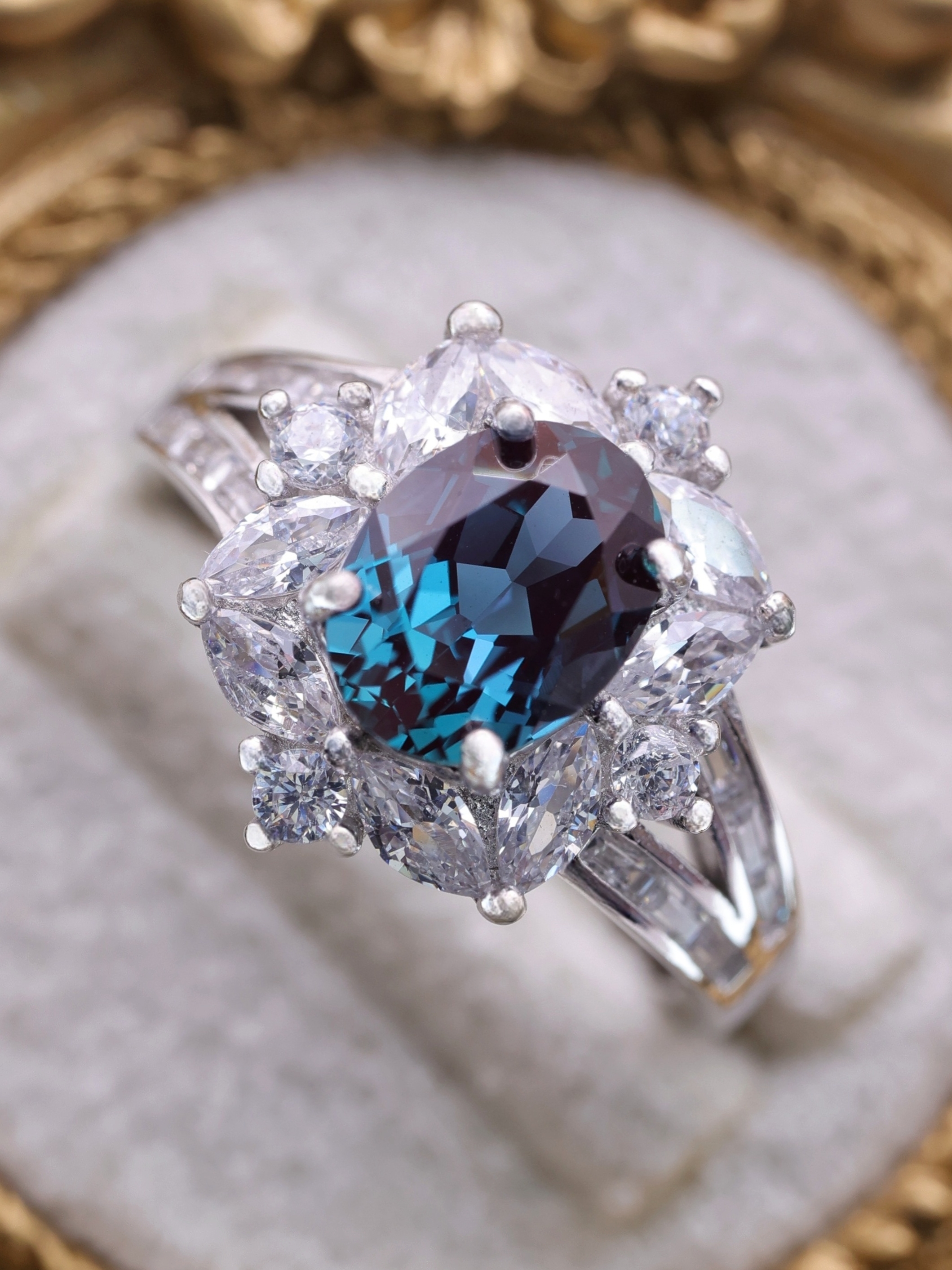 デザインは、王冠を思わせる高低差のあるセッティング。両脇に配された高品質のジルコニアが青の輝きを引き立て、指先に凛とした気品と清らかさを添えます。