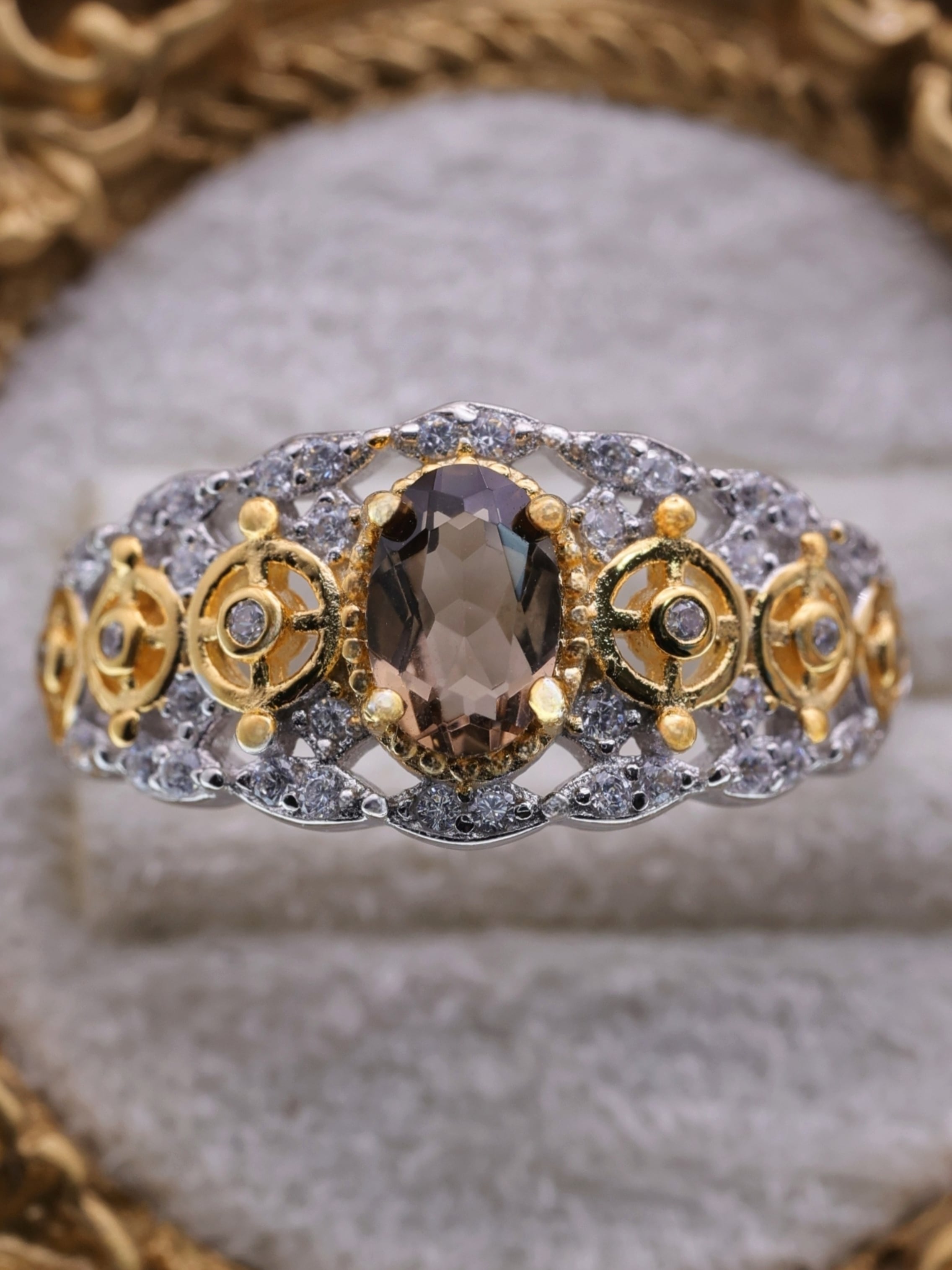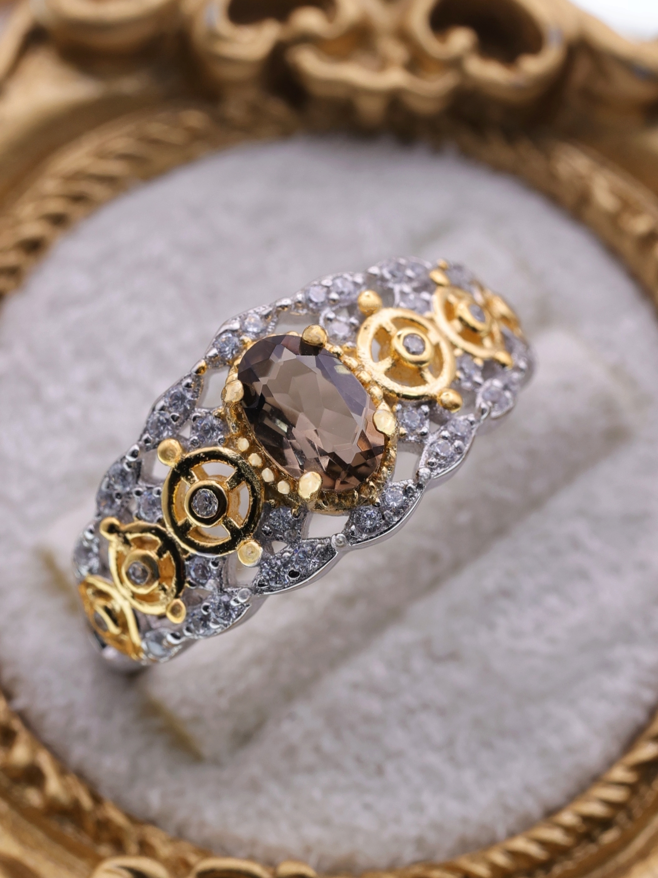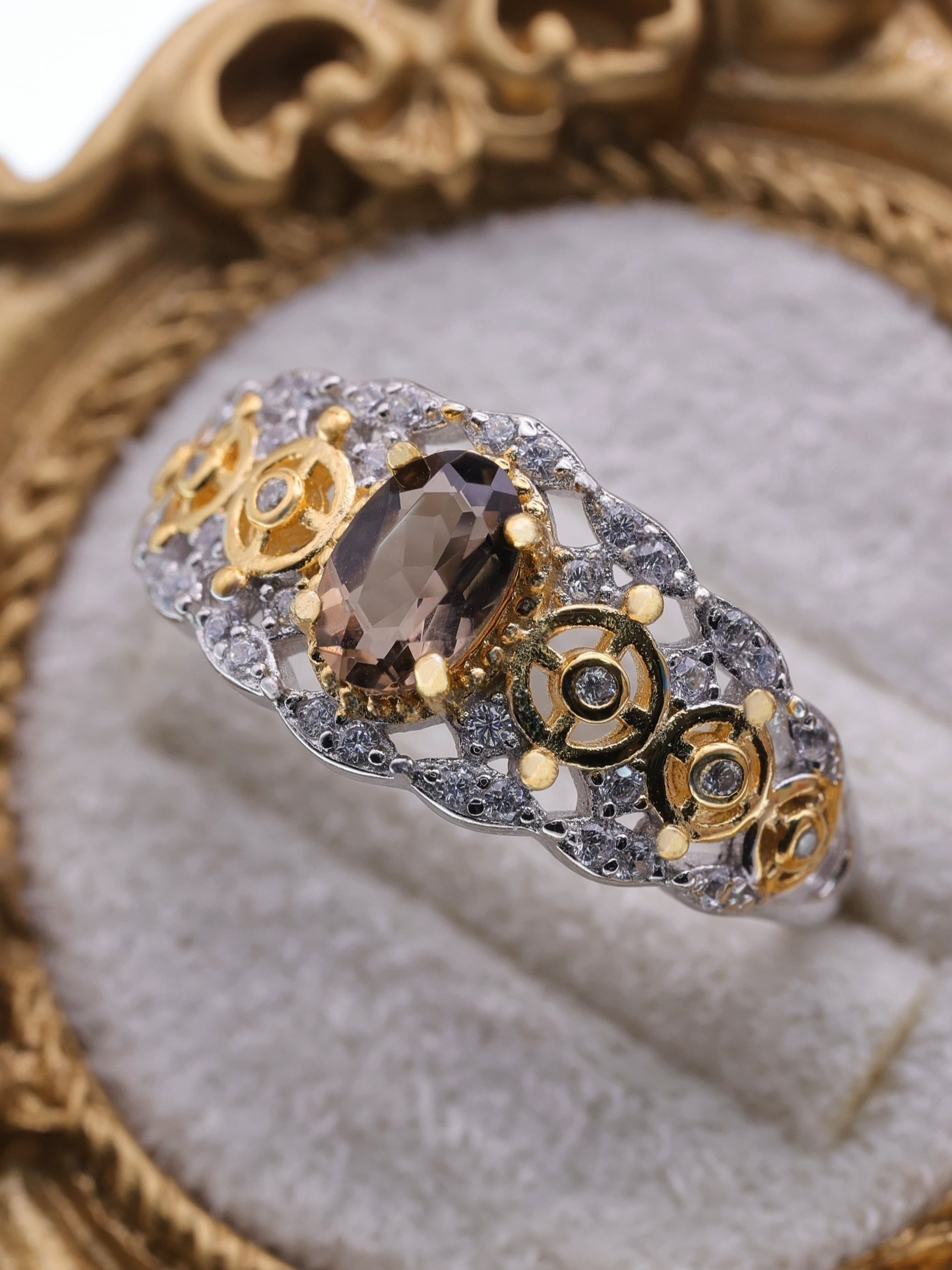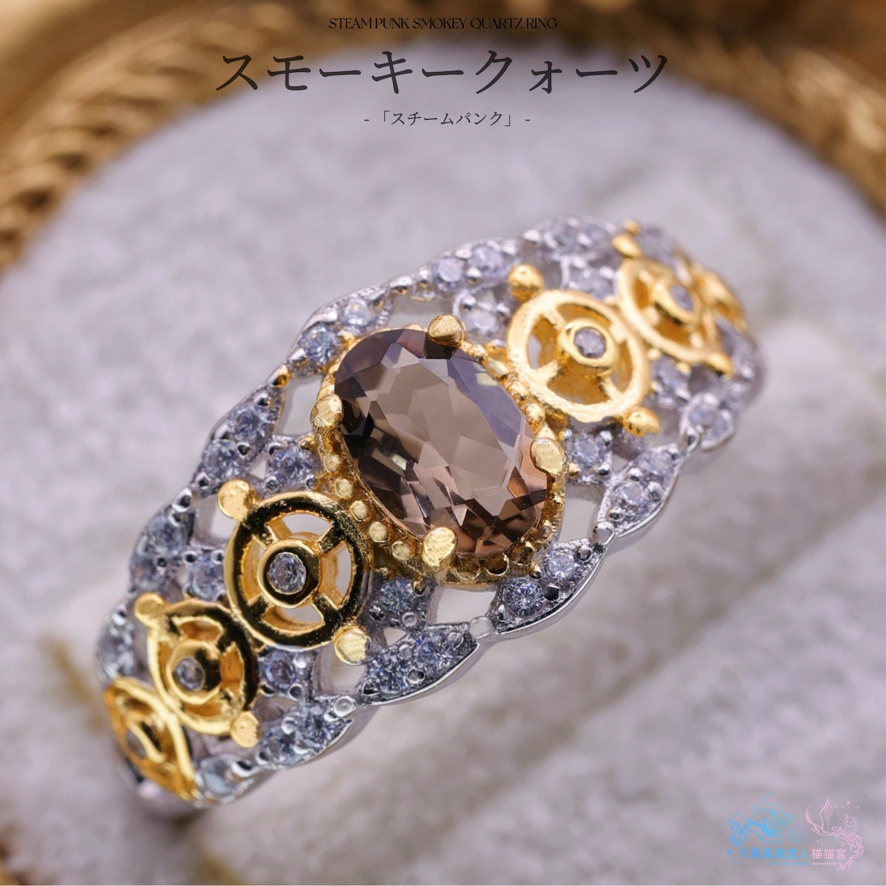 センターに落ち着いたブラウンの輝きを放つスモーキークォーツを据え、両サイドには精巧な歯車モチーフをあしらったリング。ゴールドの歯車とシルバーの透かし模様、そして散りばめられたジルコニアの煌めきが調和し、アンティークと幻想が交差する独特の世界観を生み出しています。