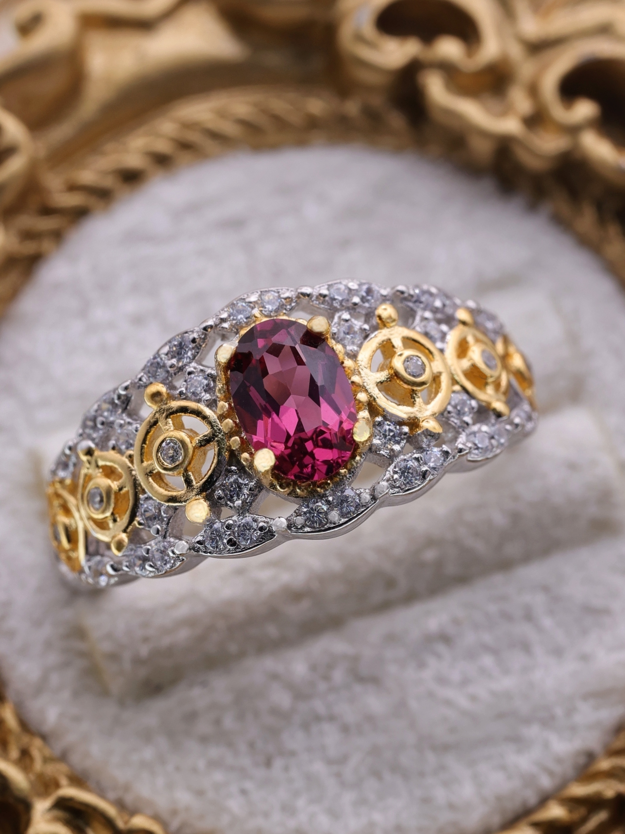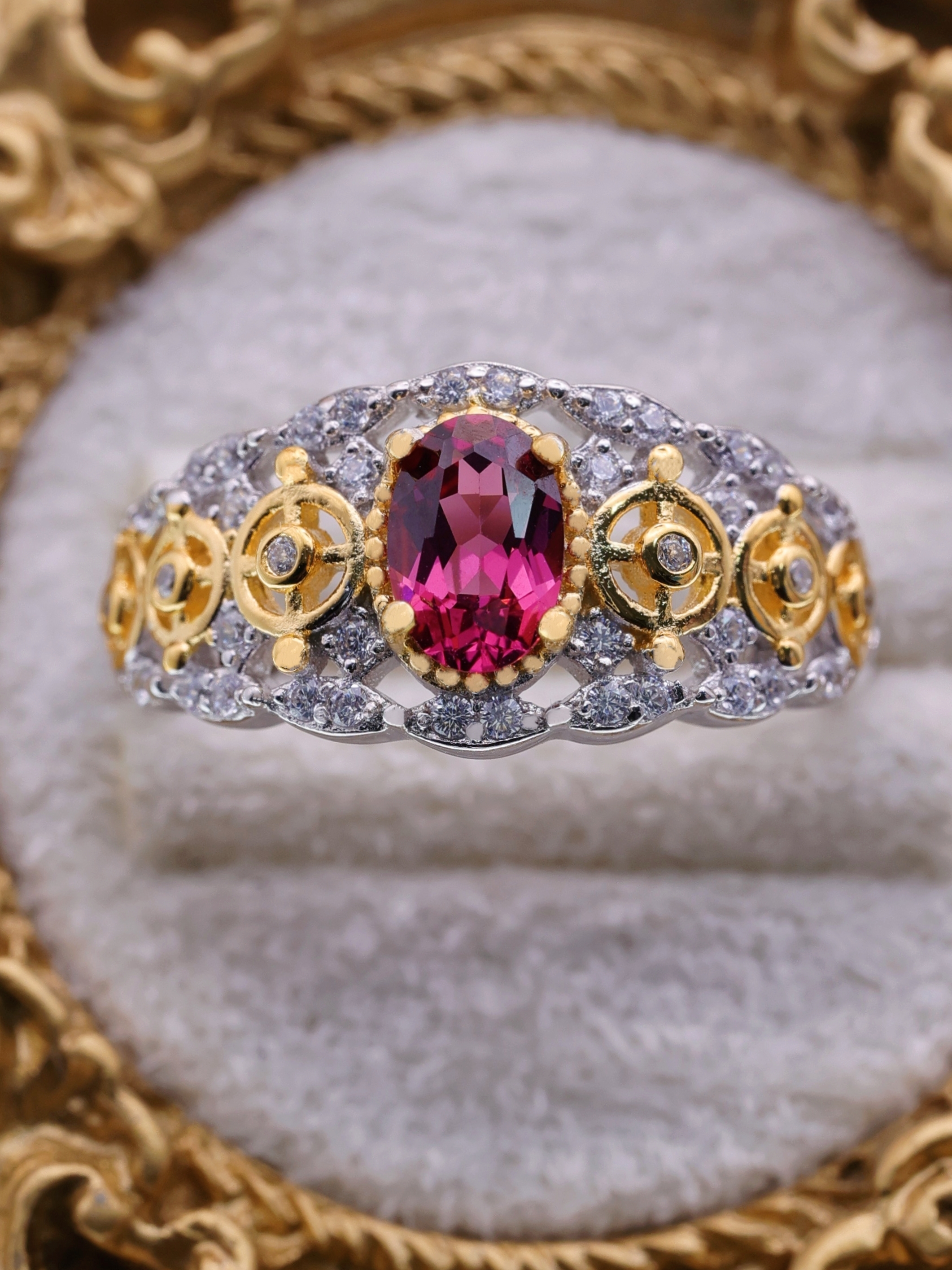 深い赤紫の輝きを放つロードライトガーネットをセンターに据え、両サイドに精巧な歯車モチーフをあしらったリング。力強さと華やかさを併せ持つガーネットの色彩が、ゴールドの歯車装飾と調和し、ヴィクトリアンな美学を感じさせる印象的なデザインに仕上がっています。